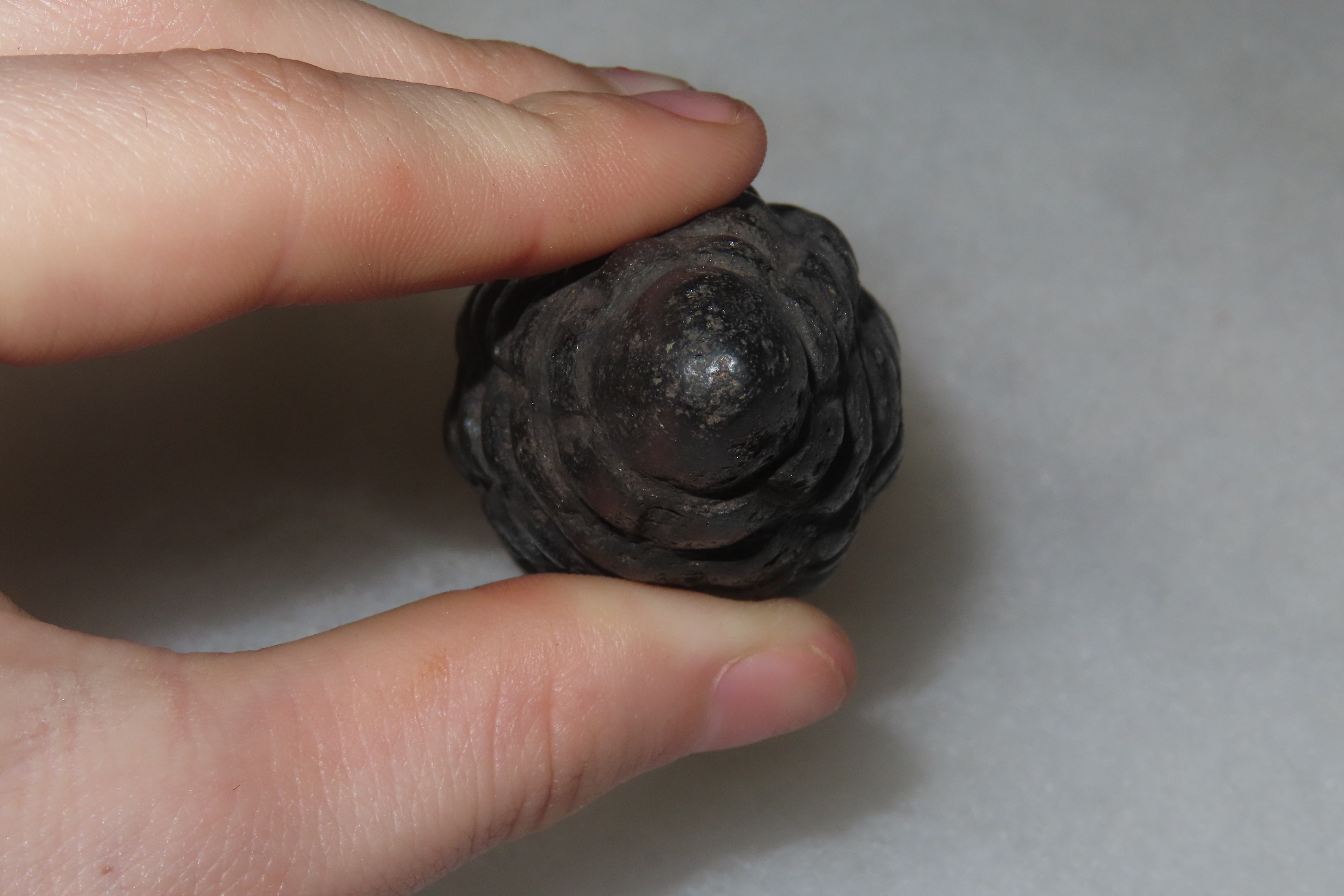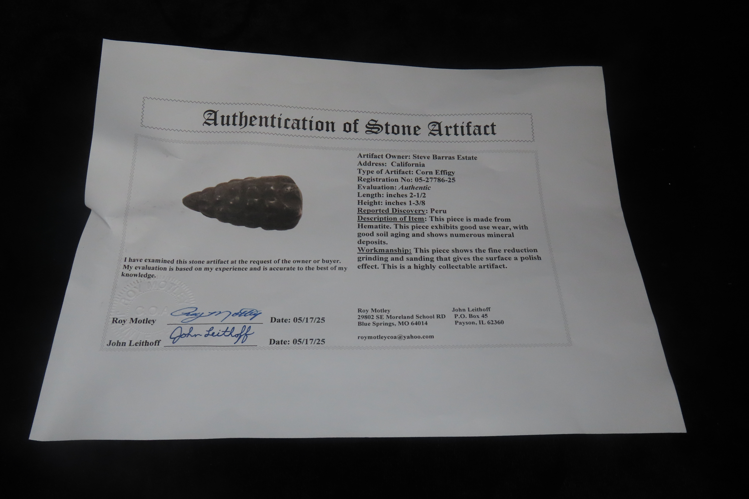 2 1/2″ x 1 3/8″ Hematite Corn Effigy Talisman, Motley COA, found in Peru, Ex Steve Barras Estate