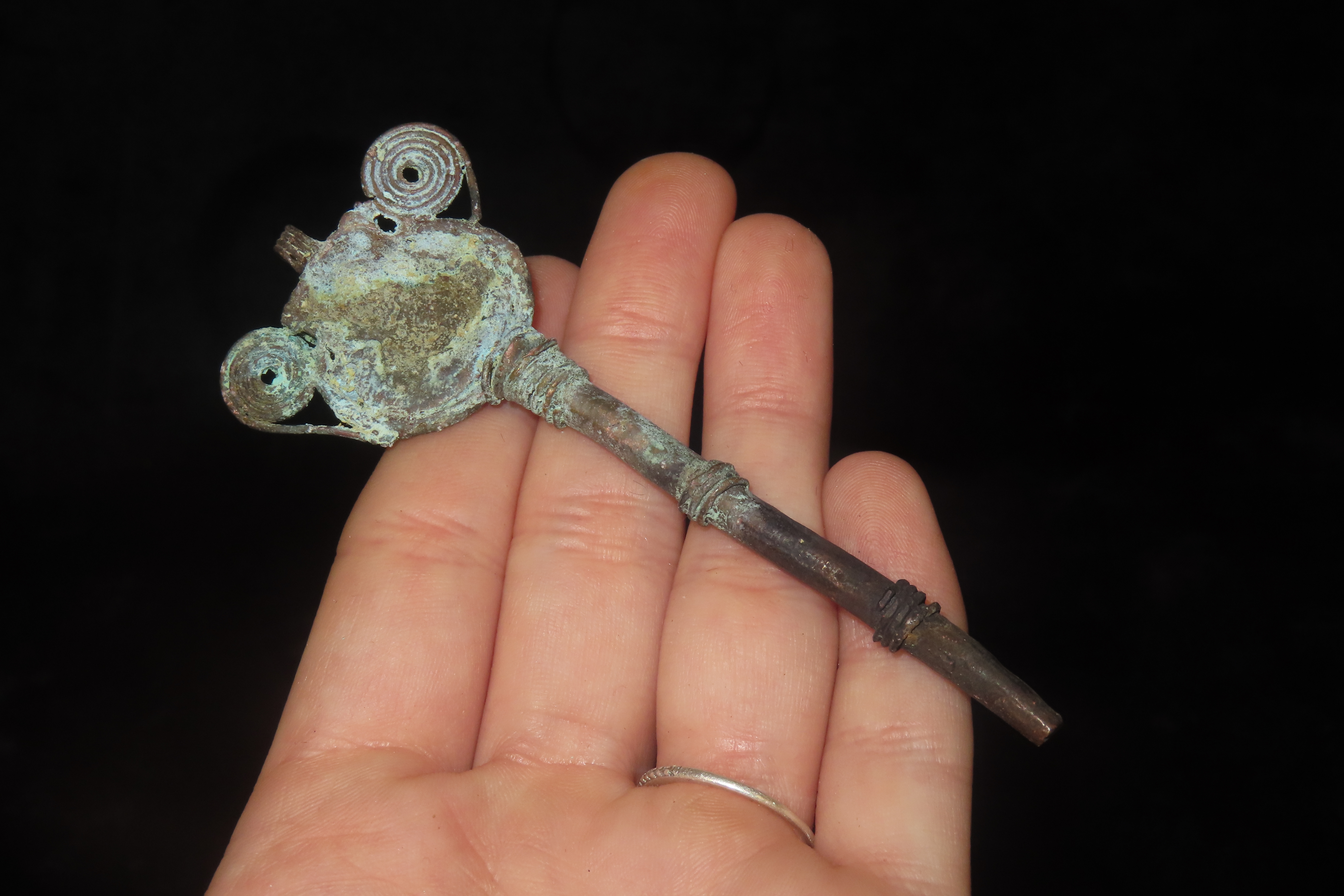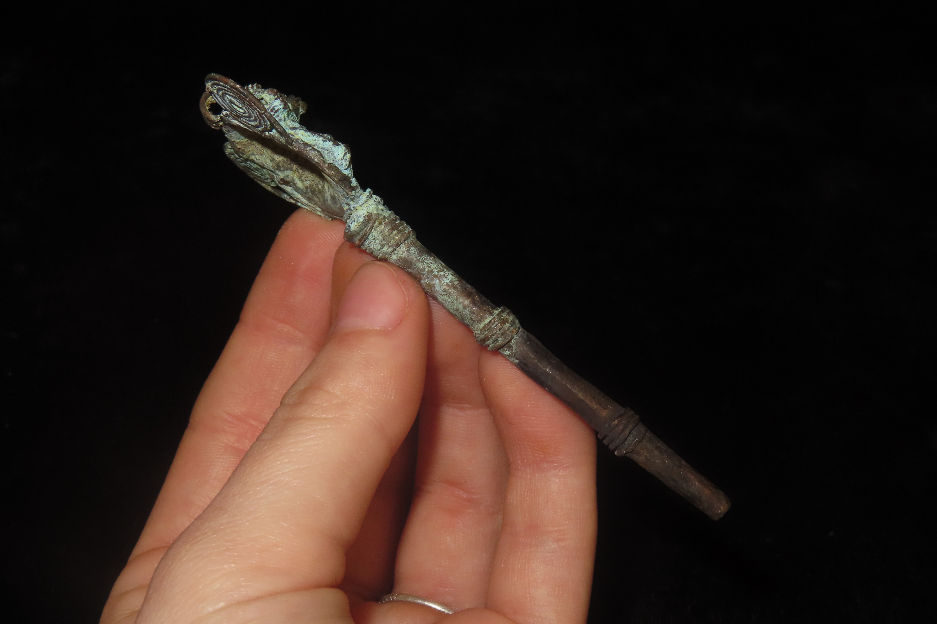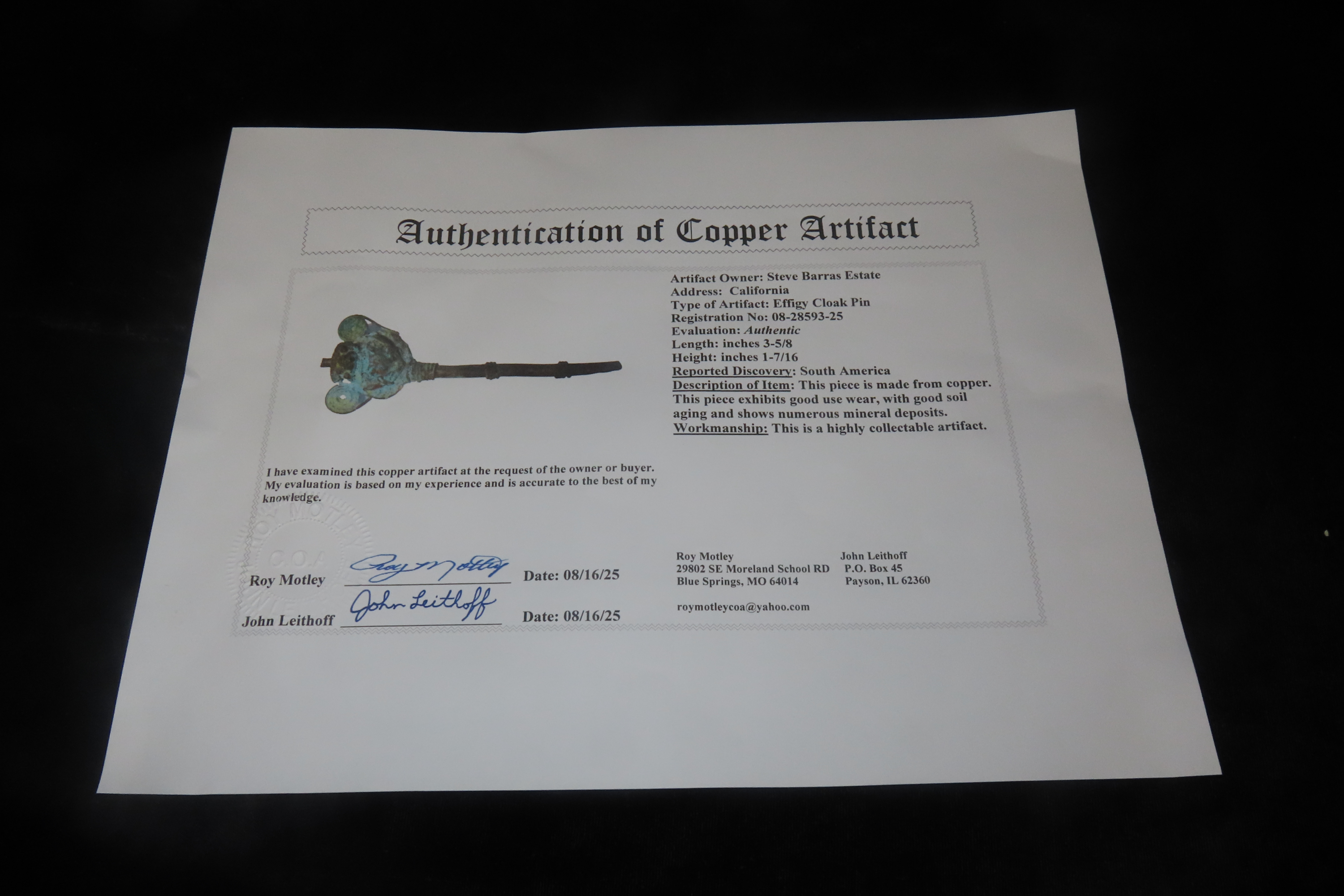 3 5/8″ x 1 7/16″ Copper Effigy Cloak Pin, found in South America, Ex Steve Barras Estate