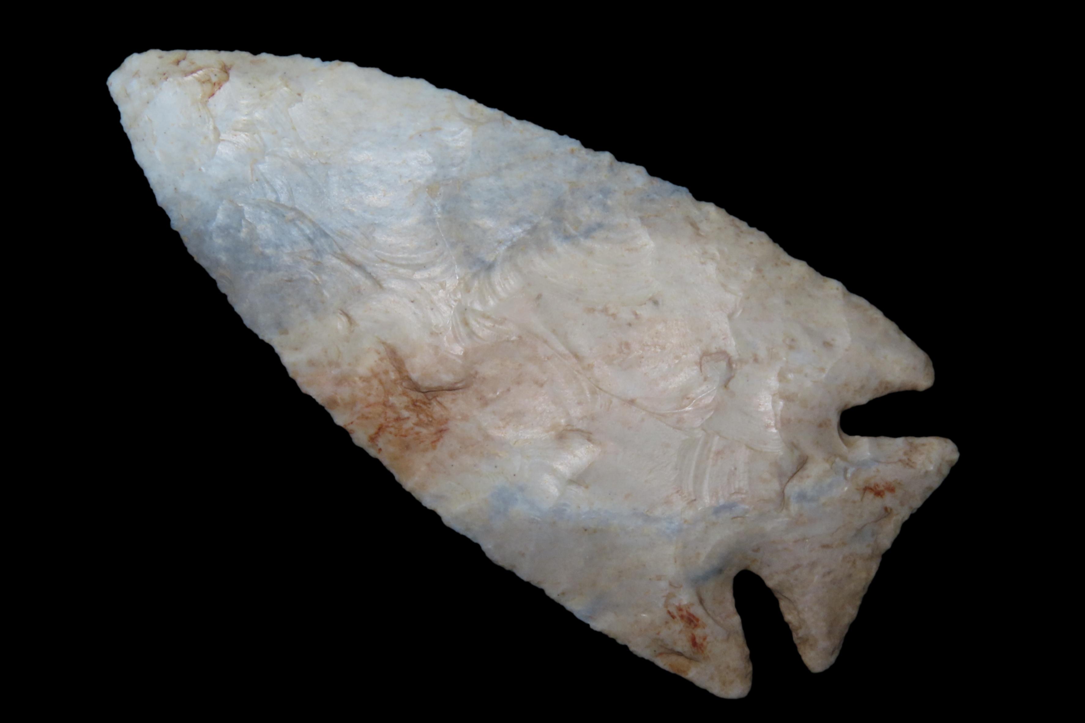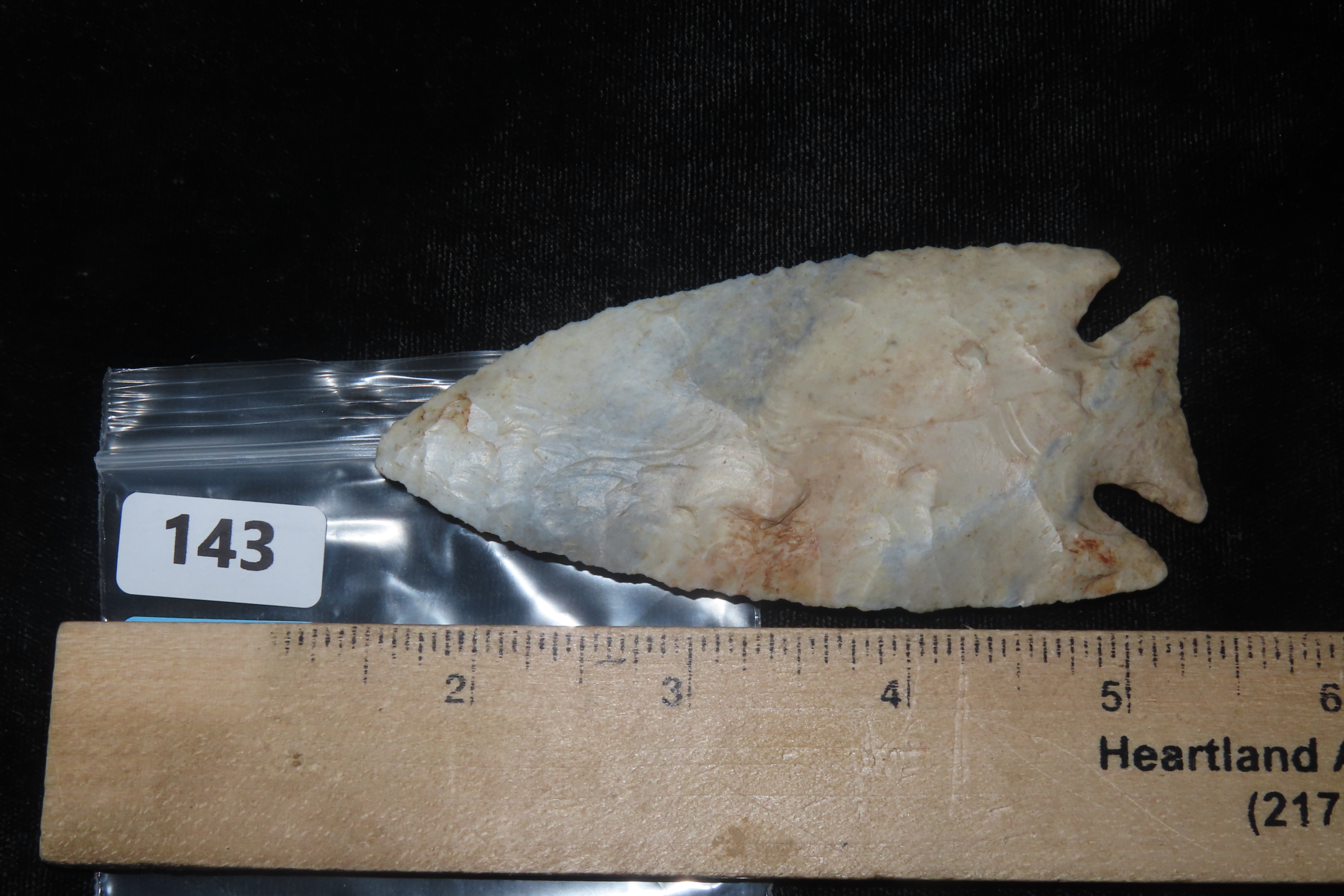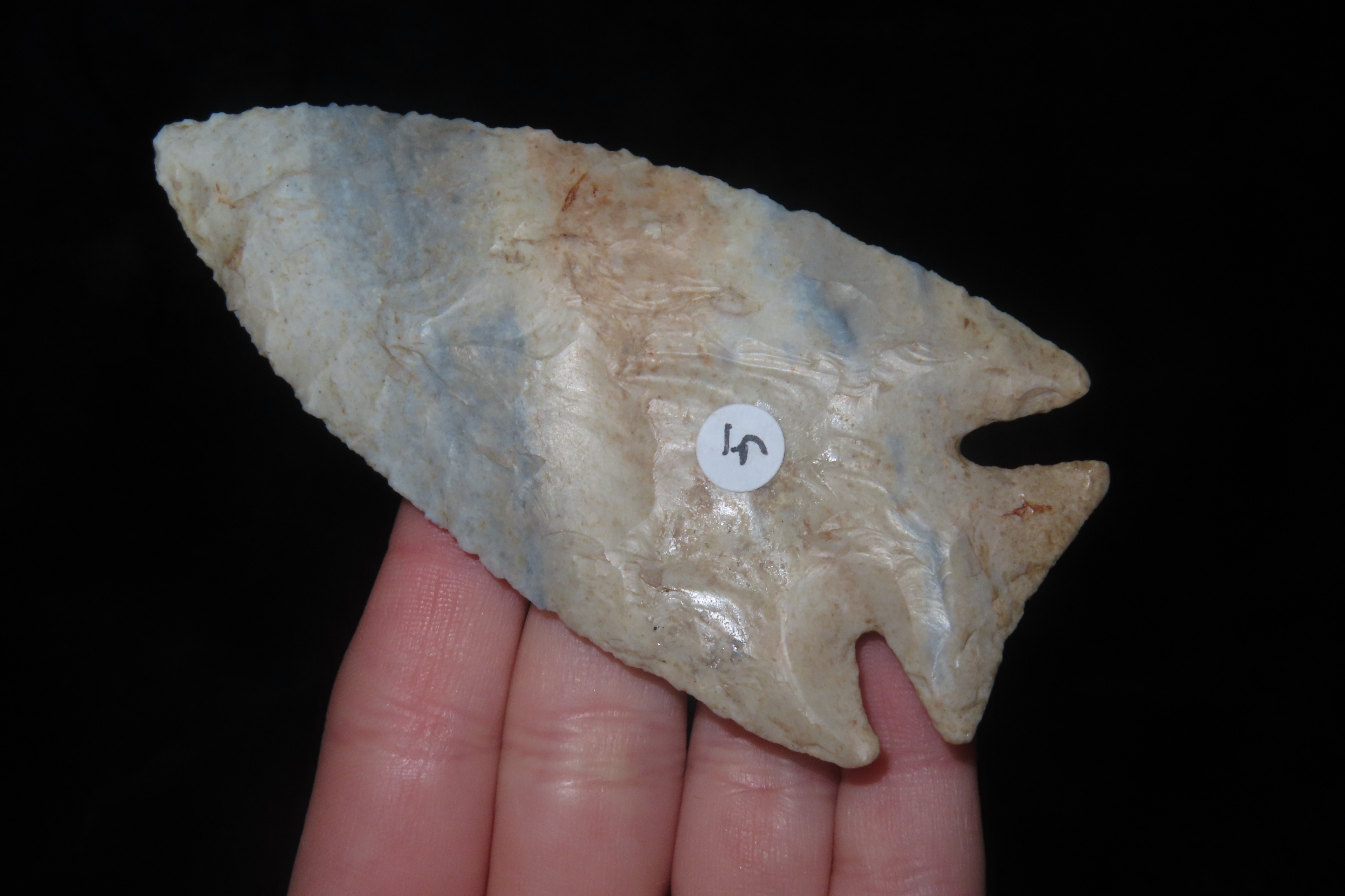 3 15/16″ Gorgeous Color Avon Chert Pulaski Corner Notch, found in 1963 near Summum, Fulton Co., Illinois by Ed Pollit