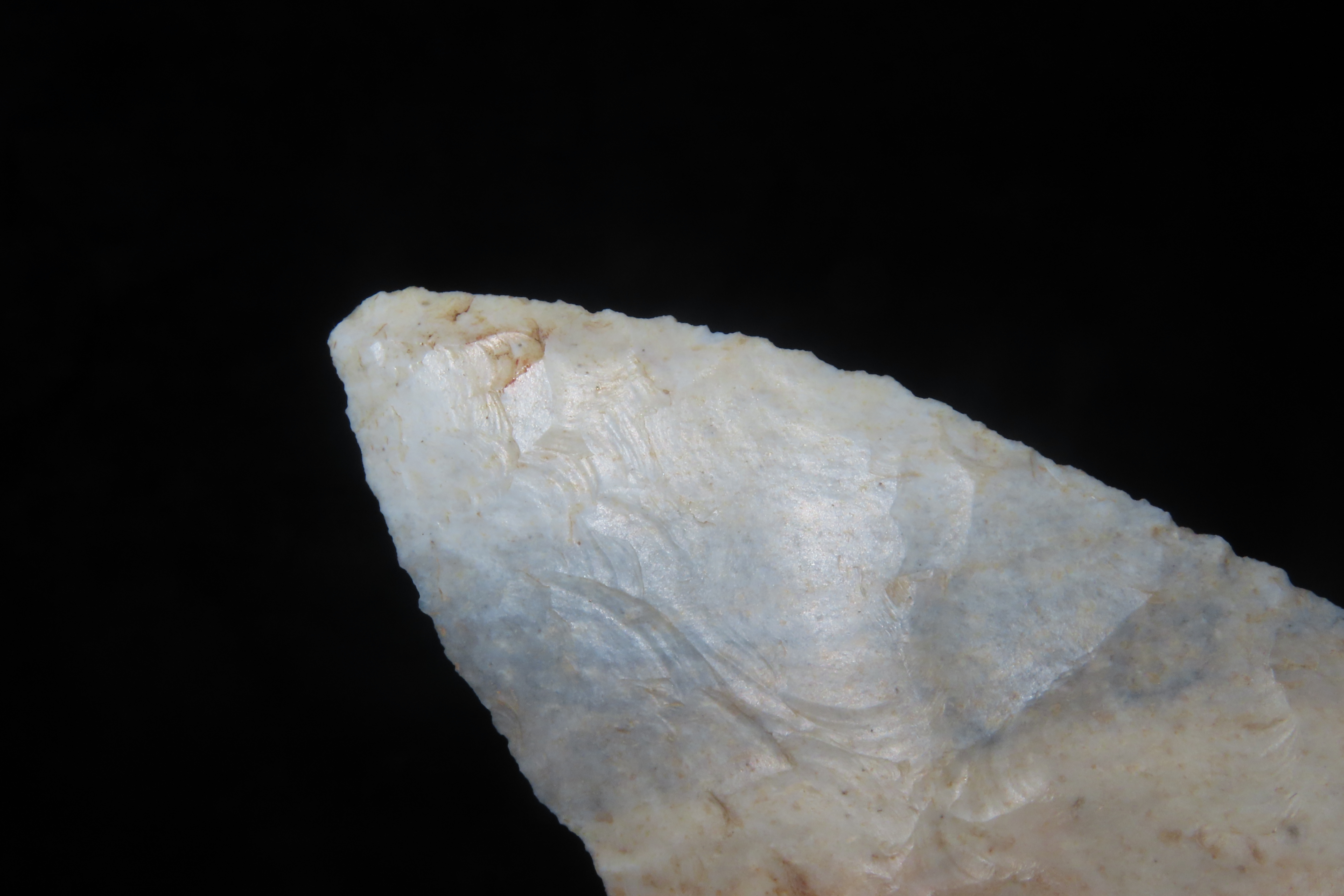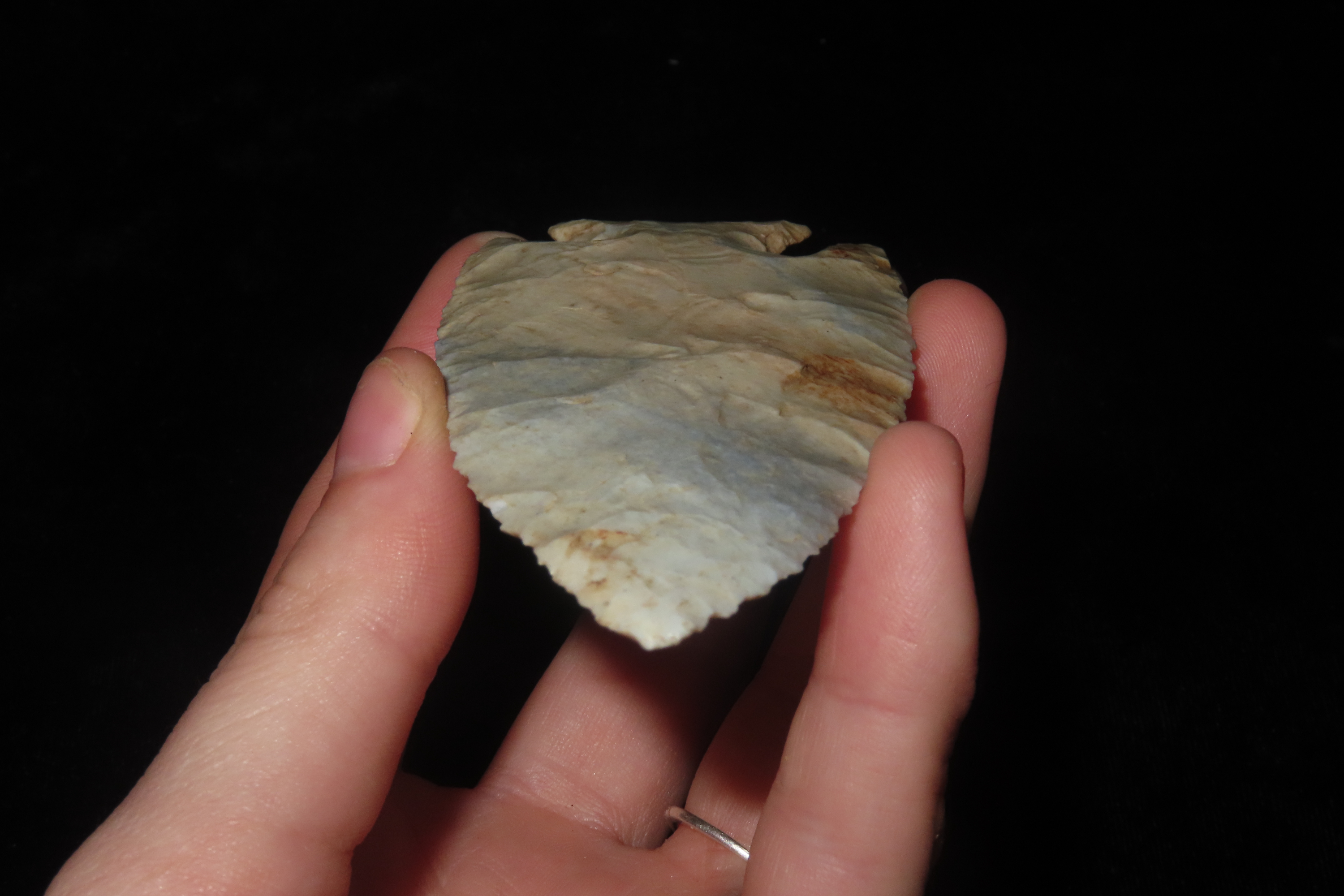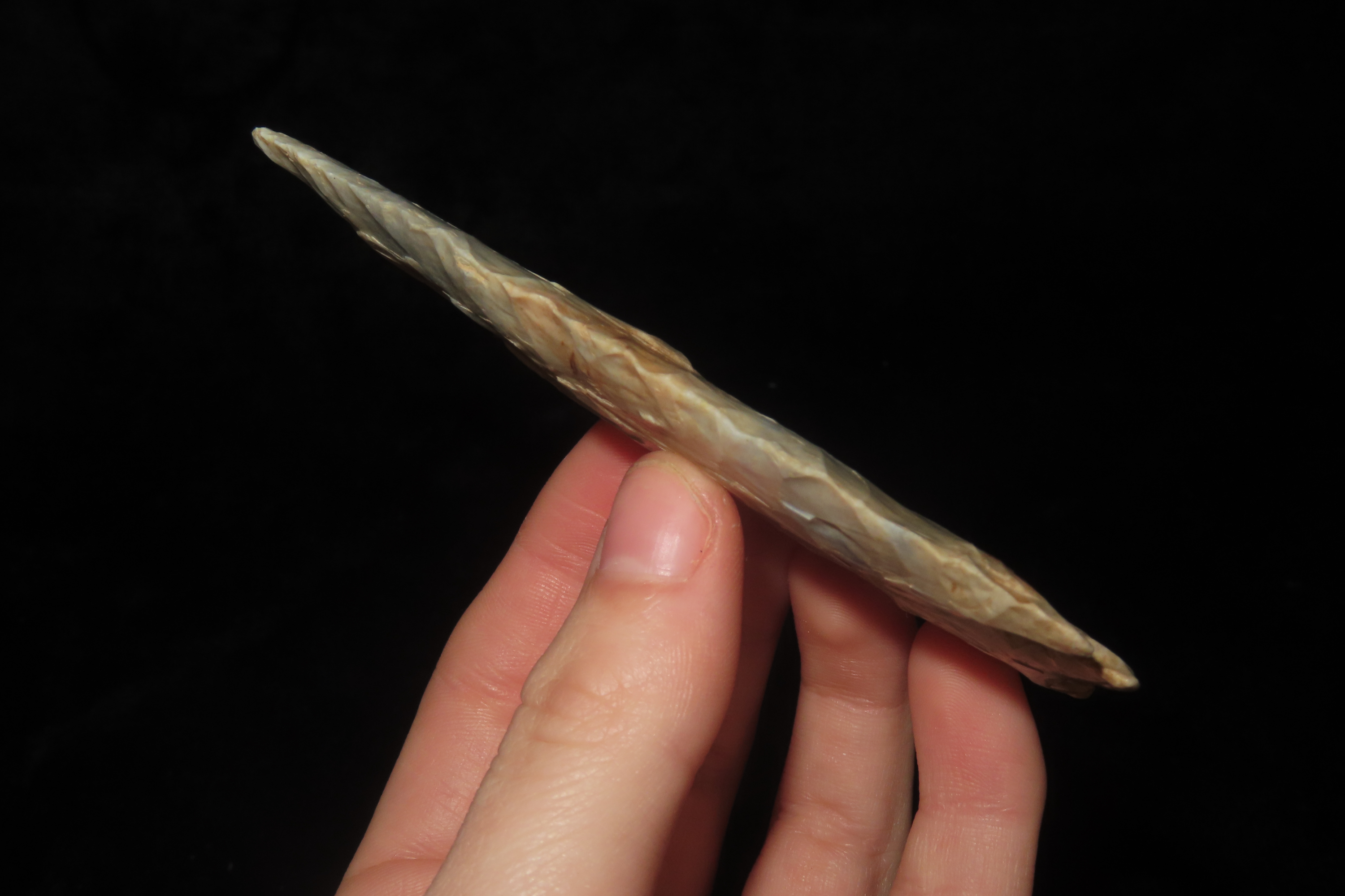 3 15/16″ Gorgeous Color Avon Chert Pulaski Corner Notch, found in 1963 near Summum, Fulton Co., Illinois by Ed Pollit