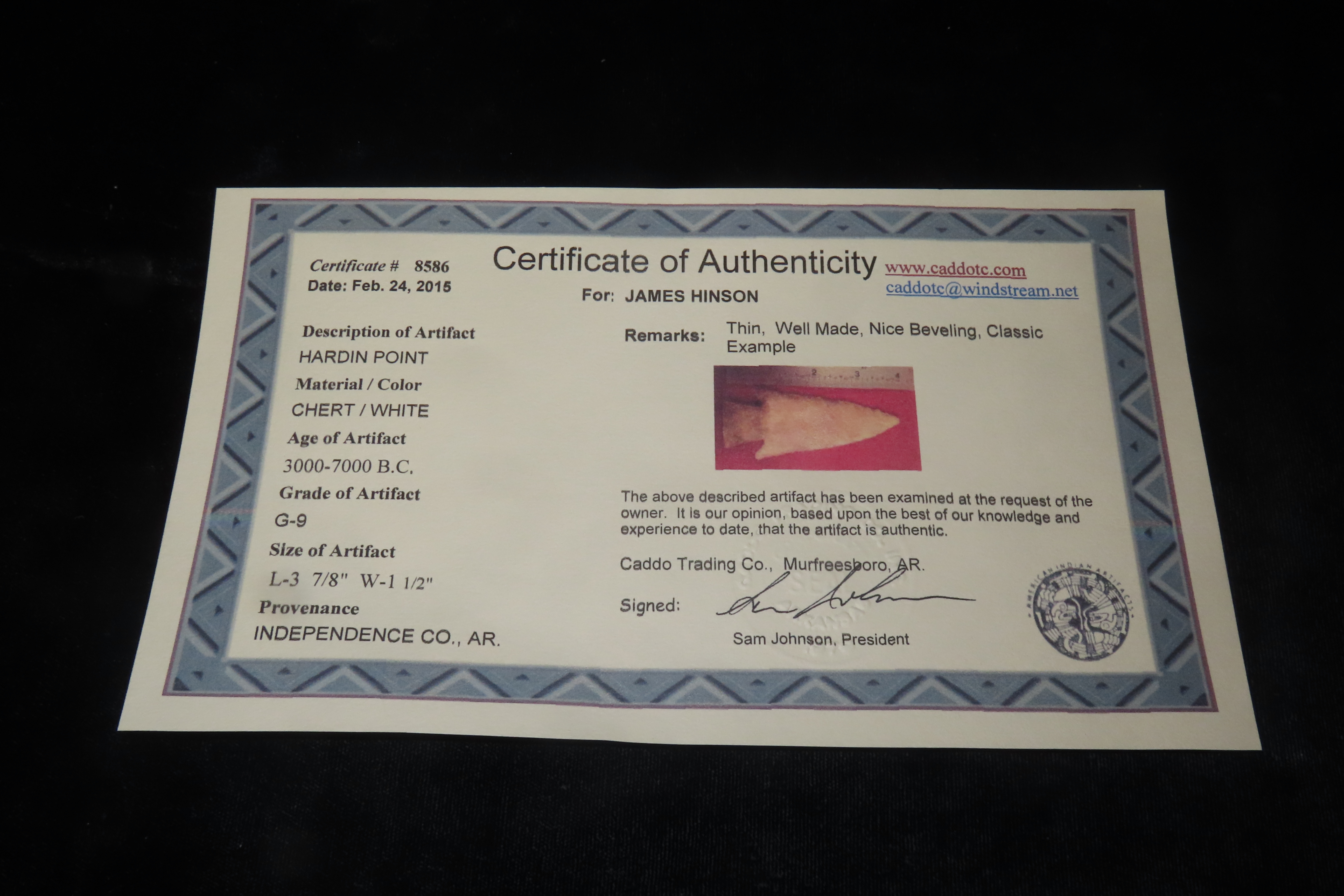 3 7/8″ x 1 1/2″ Hardin Point, Johnson COA, White Chert, Independence County Arkansas