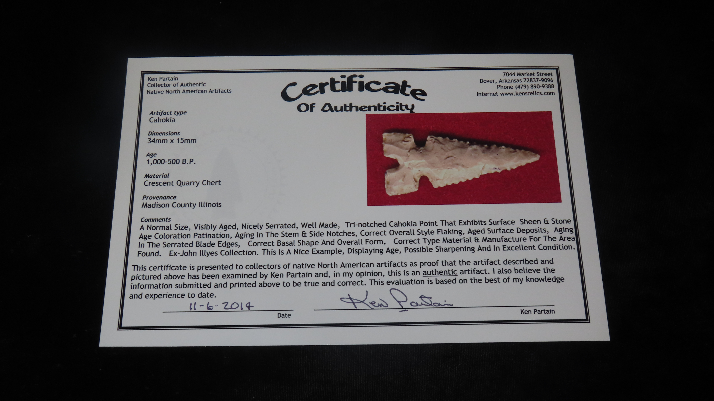 1 6/8″ x 3/4″ Cahokia, Partain COA, Made of Crescent Quarry Chert, Madison Co. Illinois, Ex James Hinson Collection