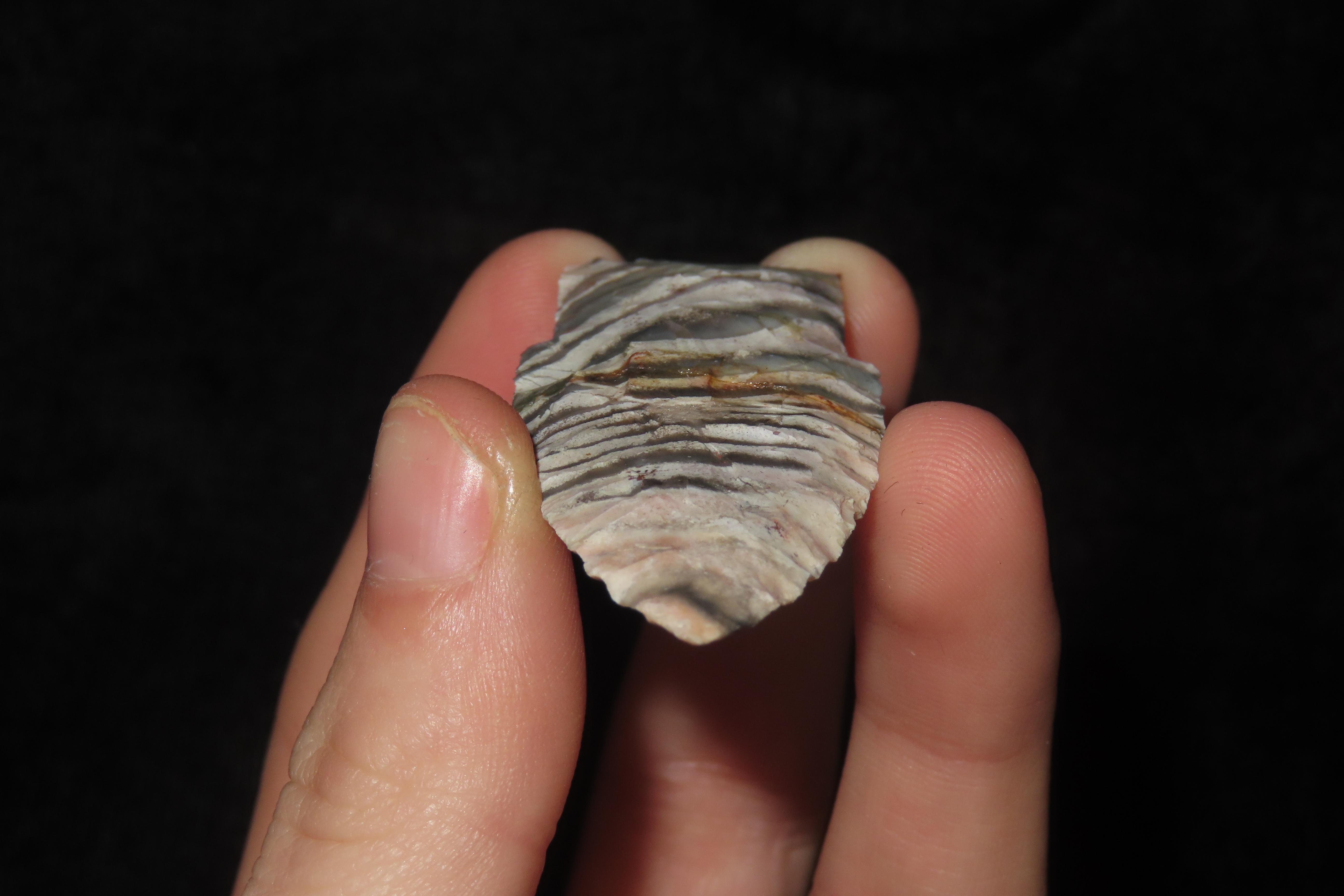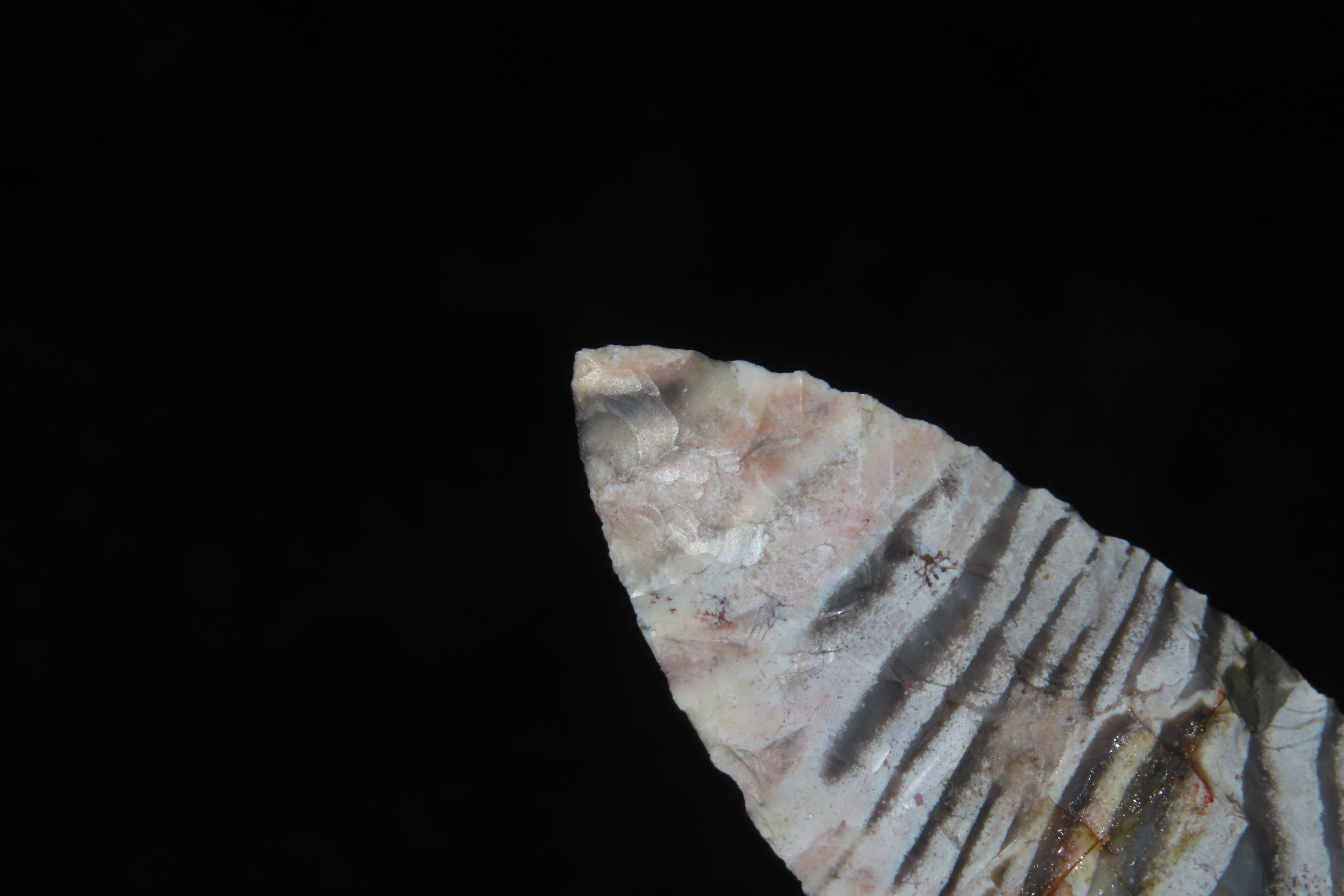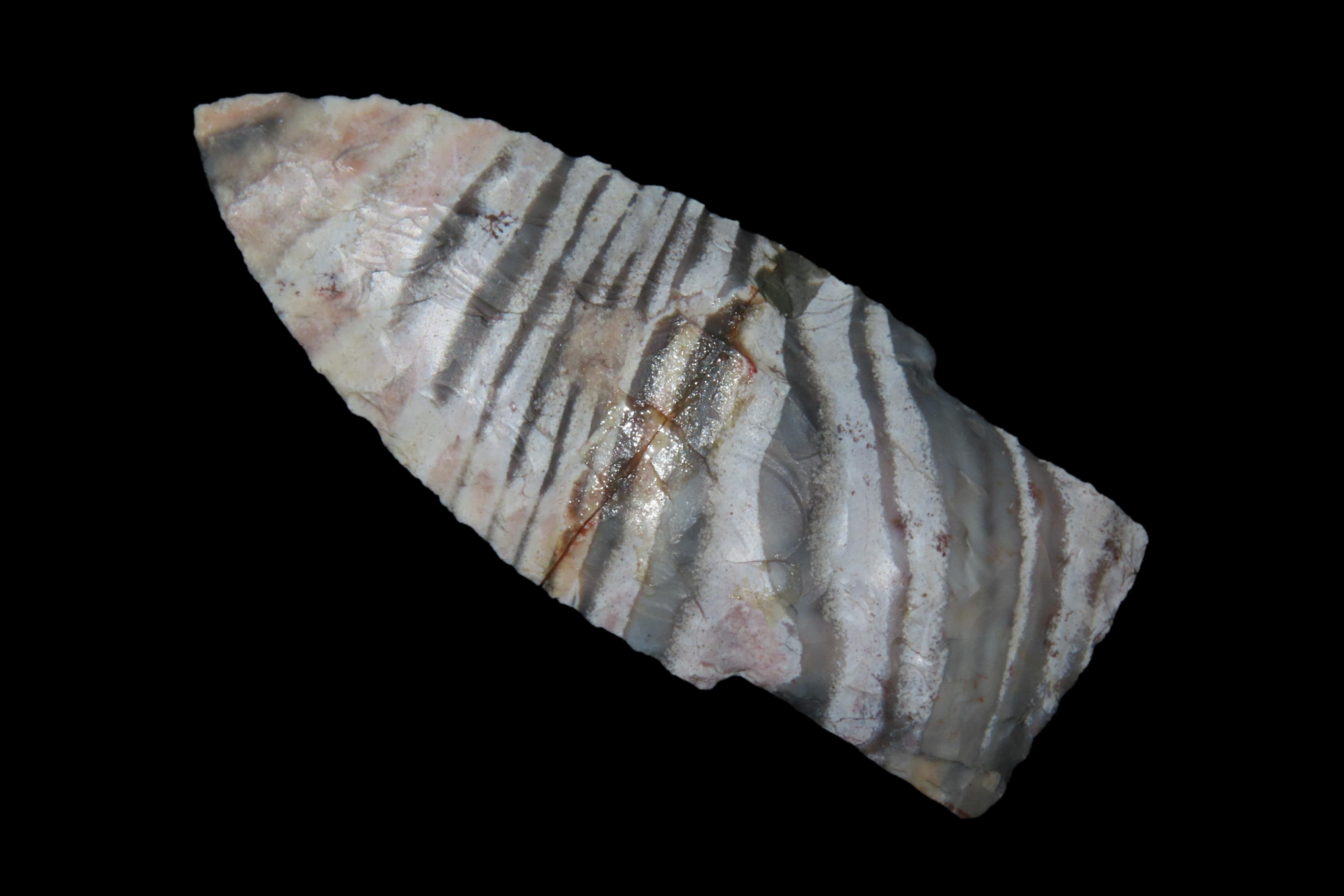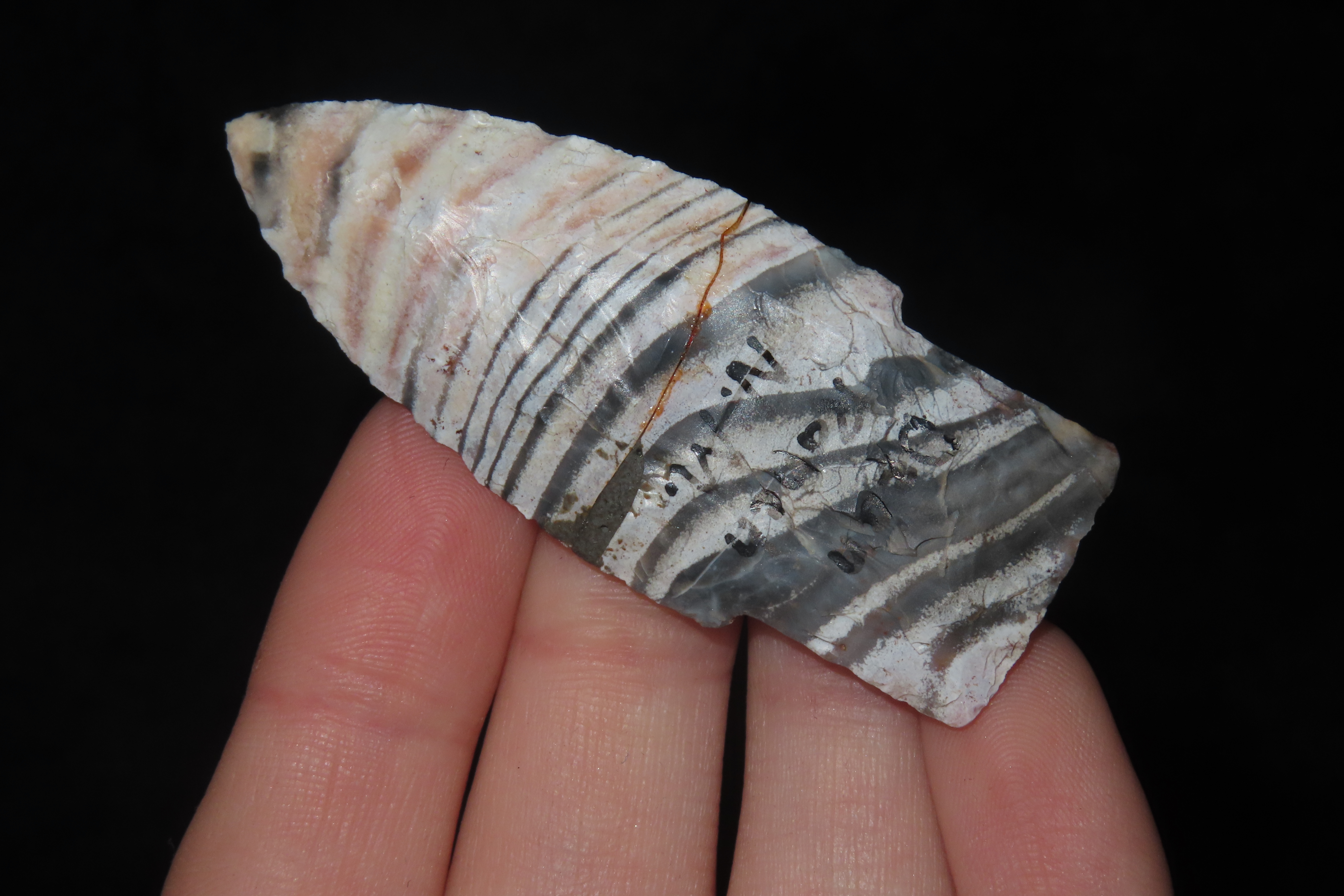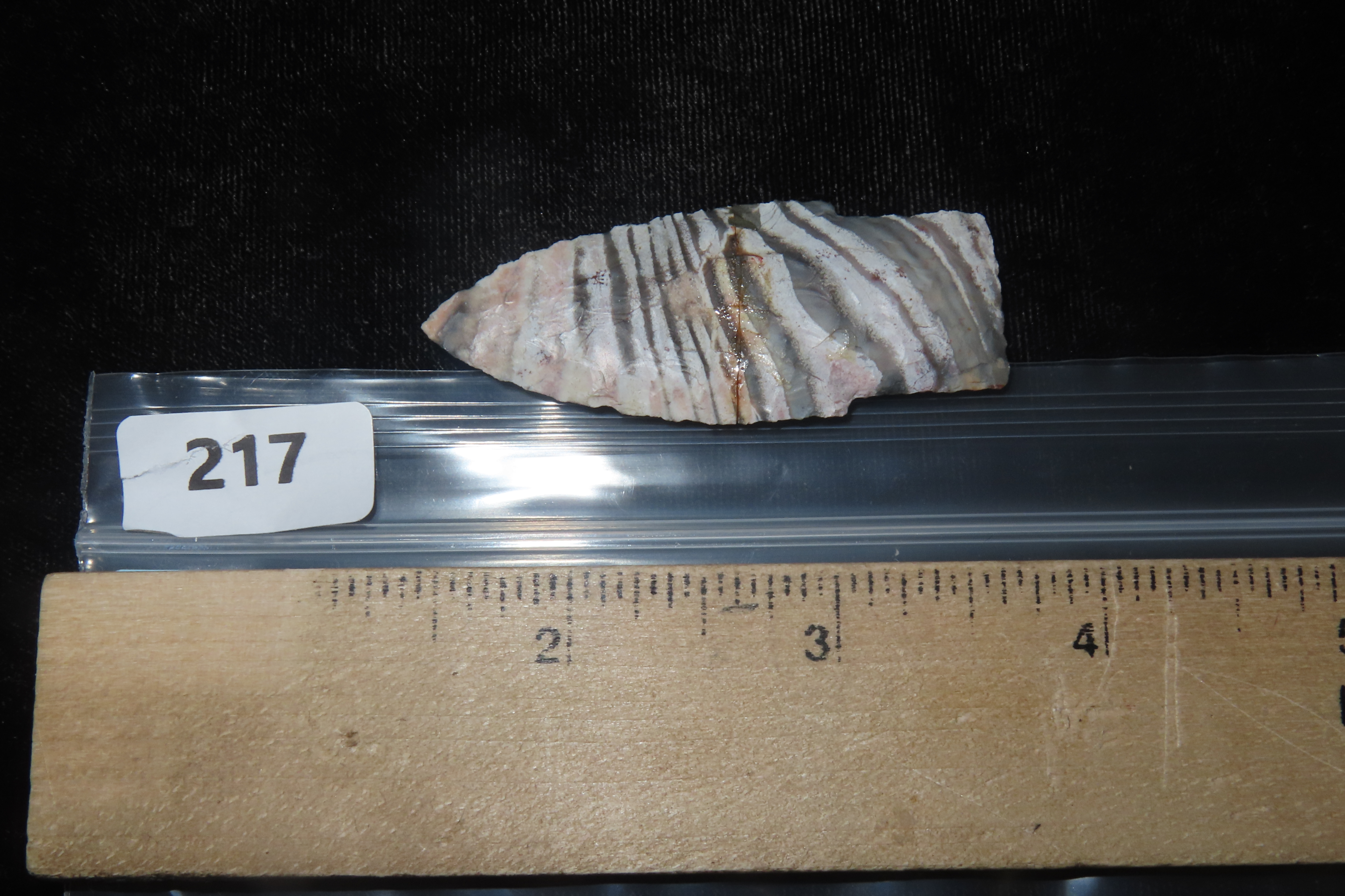 2 5/16″ x 15/16″ Scottsbluff, Tiger Striped Chert, Osage County Missouri, COA Roy Motley & John Leithoff, Ex. E.E. Cheesebro 1940s