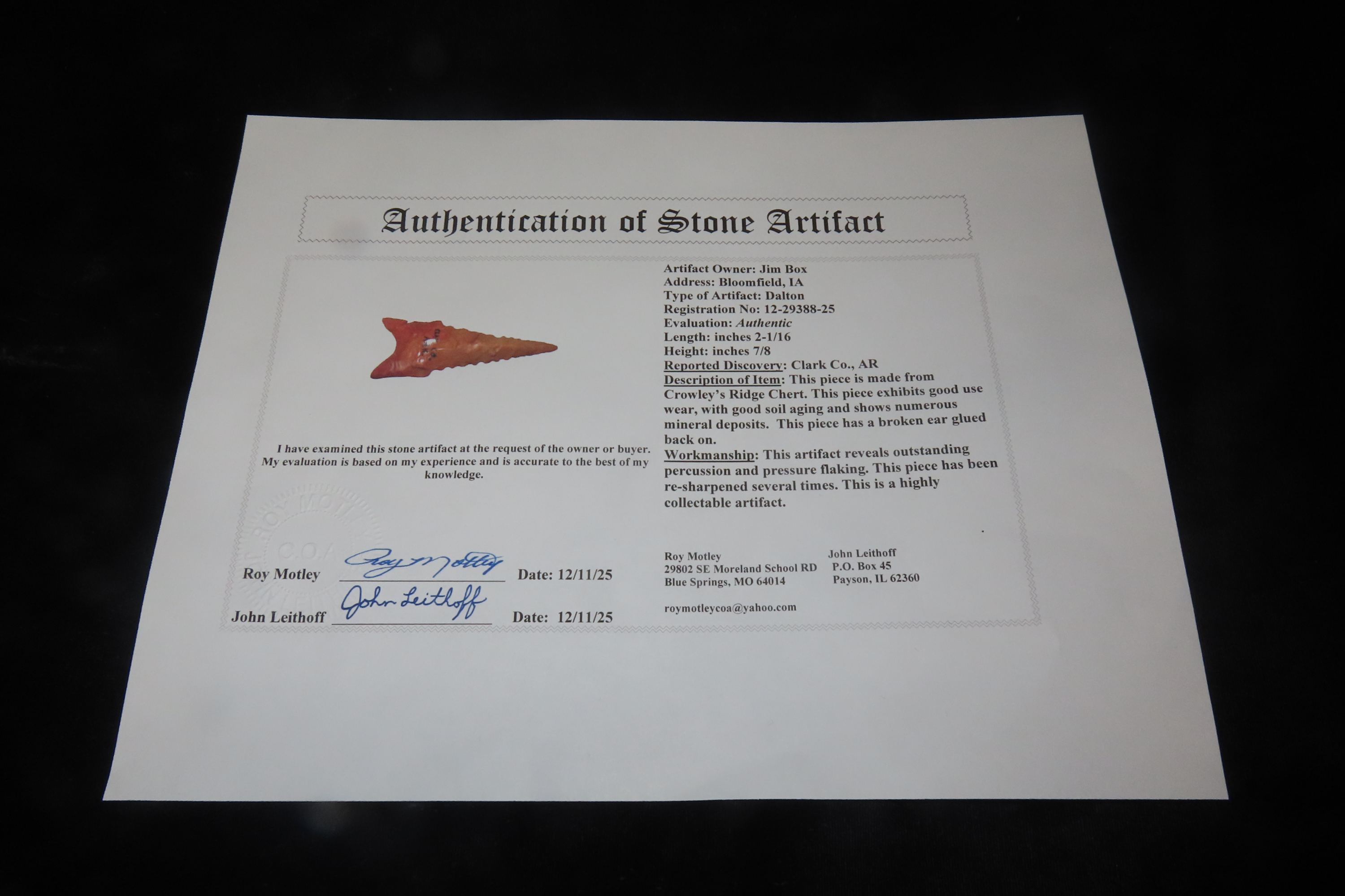 2 1/16″ x 7/8″ Dalton, Crowley’s Ridge Chert, Clark County Arkansas, COA Roy Motley & John Leithoff, Ex. E.E. Cheesebro 1940s