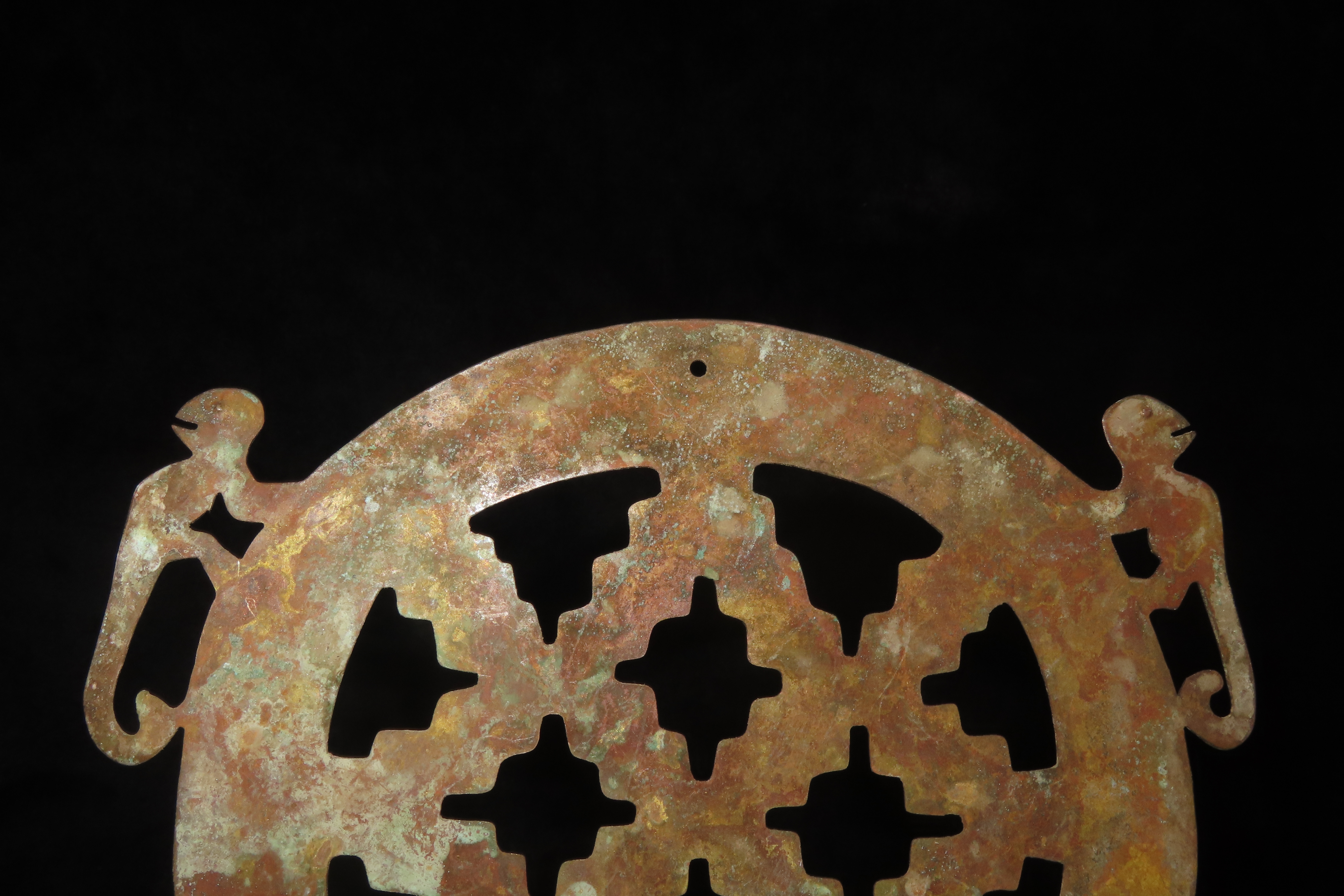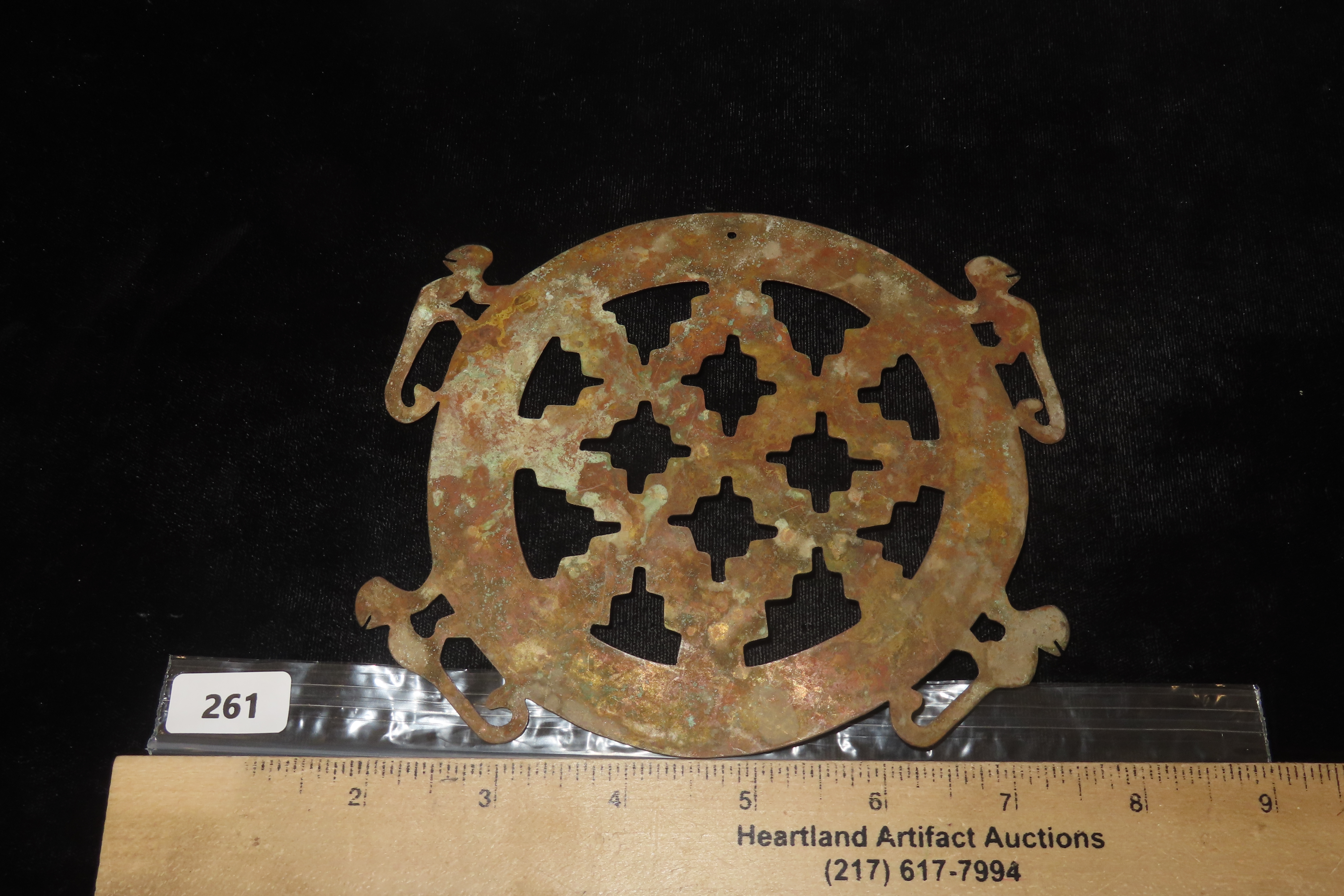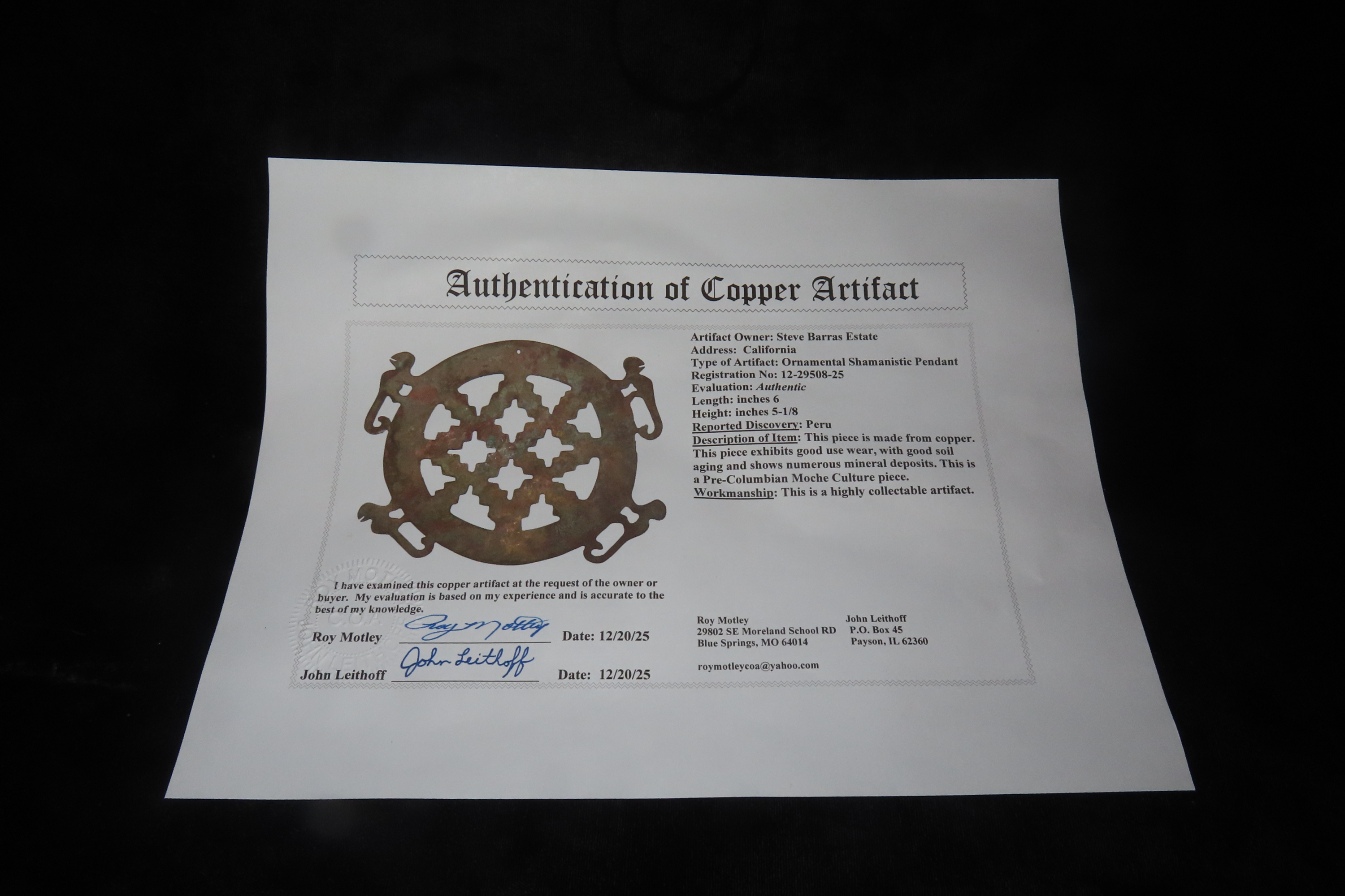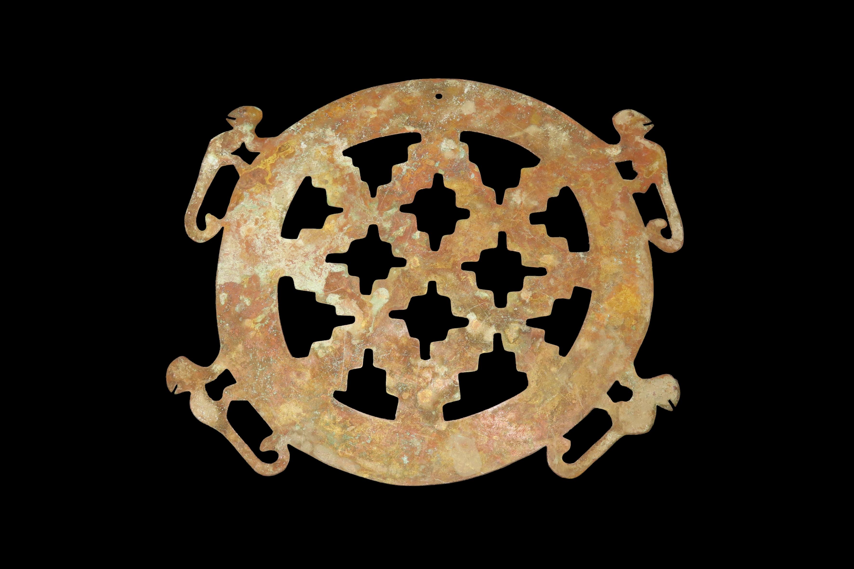 6″ x 5 1/8″ Ornamental Shamanistic Pendant, Pre-Columbian Moche Culture, Copper, Peru, COA Roy Motley & John Leithoff