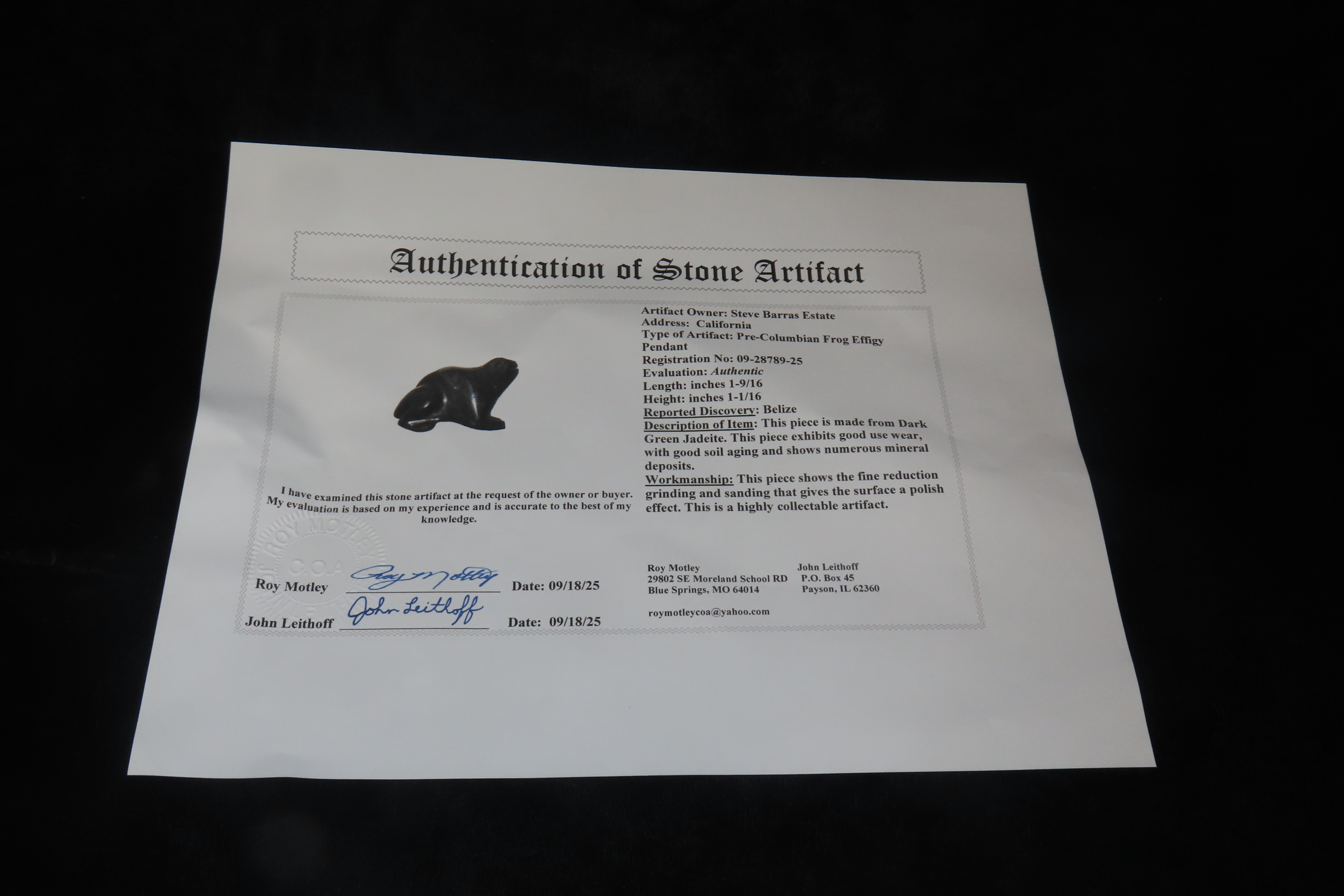 1 9/16″ x 1 1/16″ Pre-Columbian Frog Effigy Pendant, Green Jadeite, Belize, COA Roy Motley & John Leithoff
