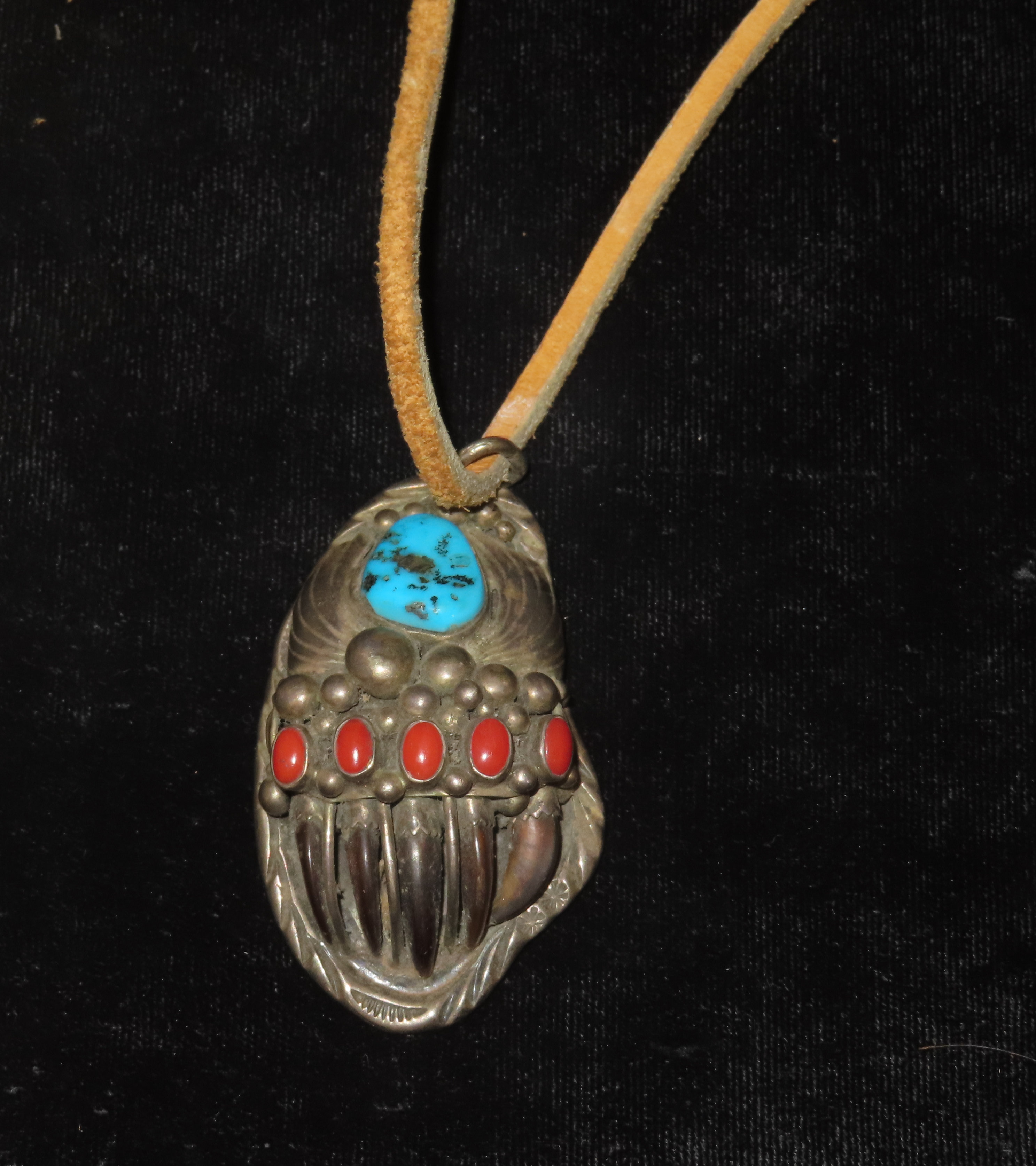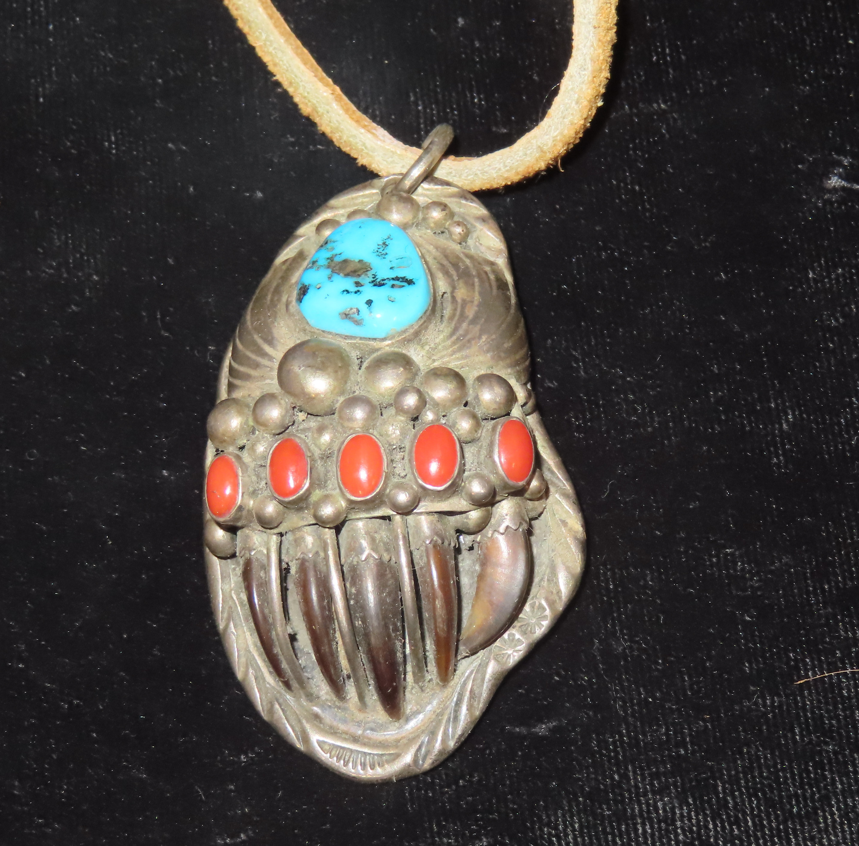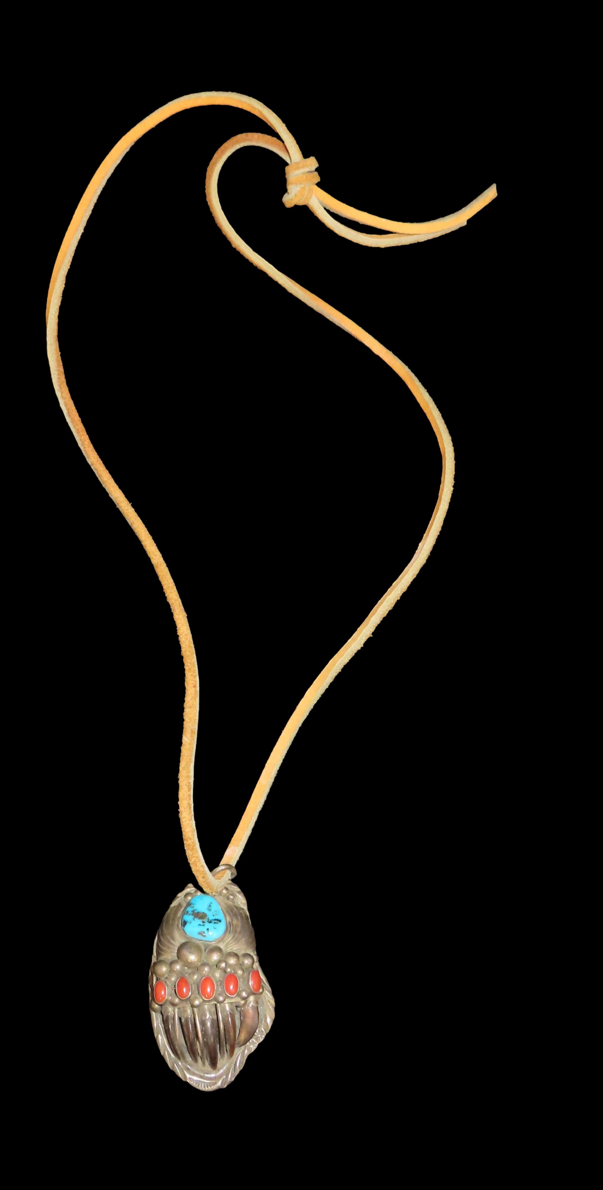 2 3/8″ x 1 1/2″ Navajo Handmade Pendant-Turquoise, Coral, and Authentic Bear Claws