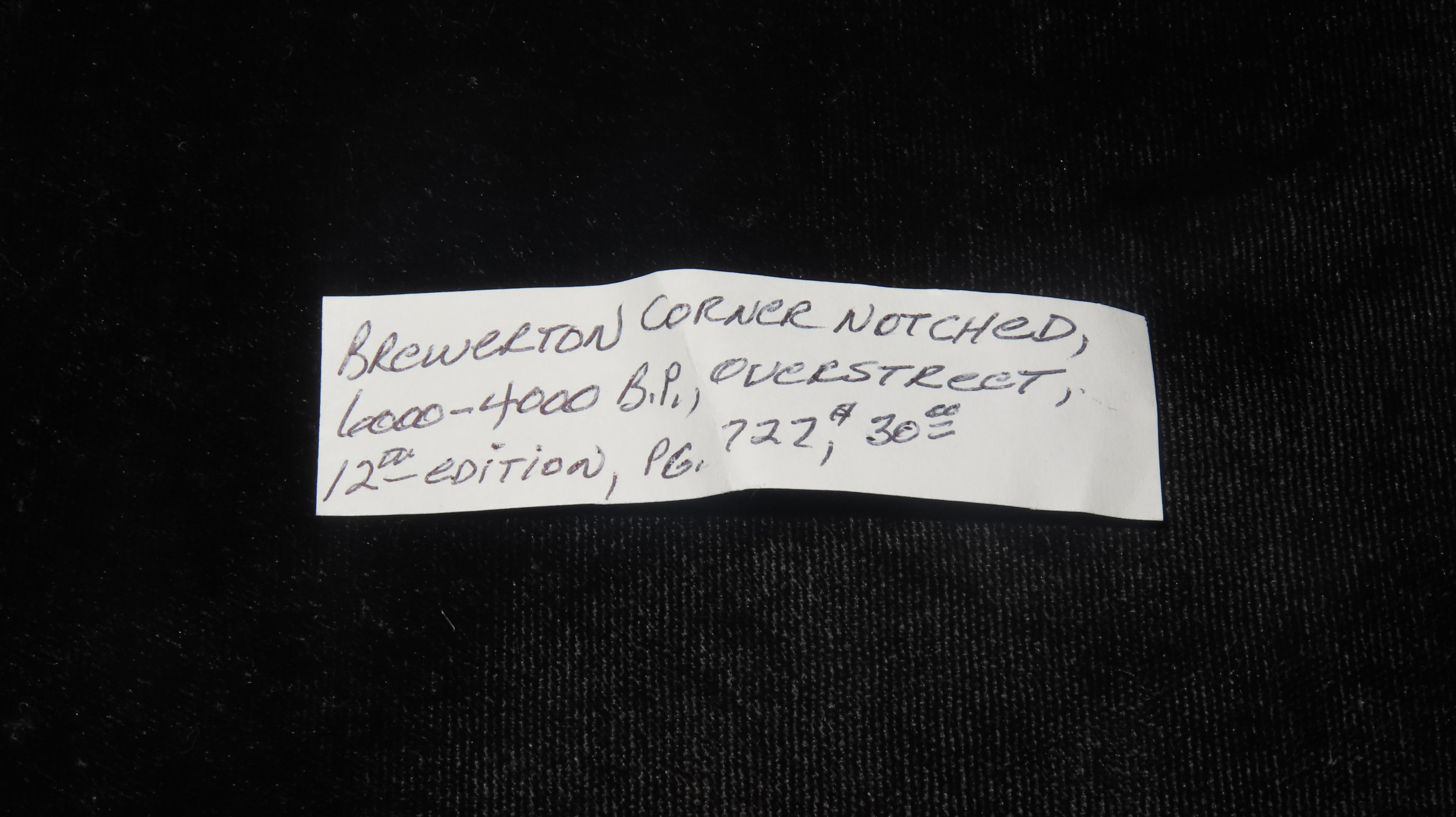 1 9/16″ Brewerton Corner Notch, 6000-4000 BP, For Identification Reference Overstreet 12th Edition Pg. 727