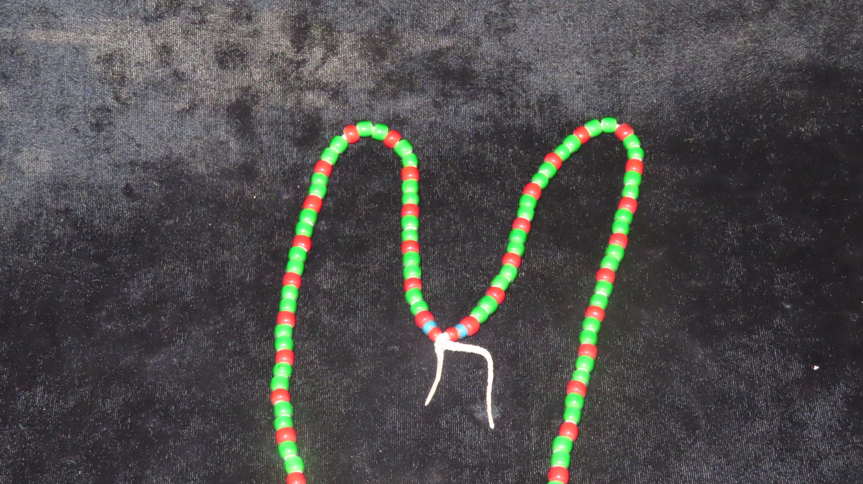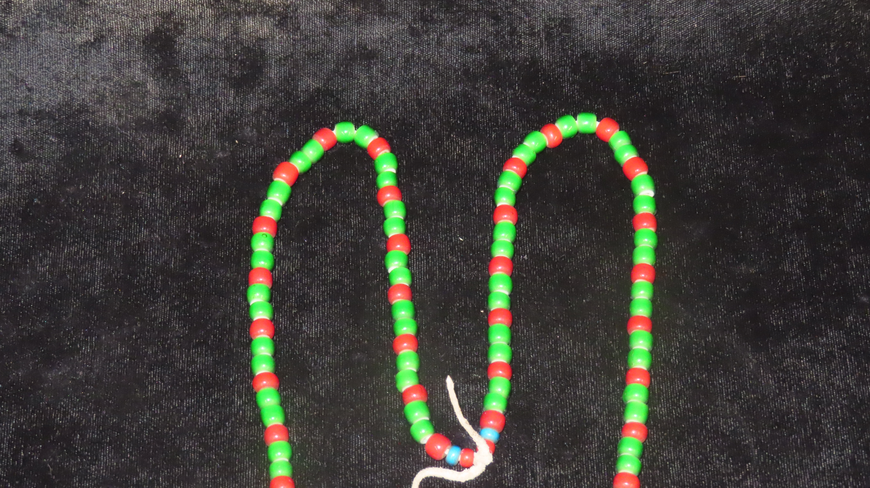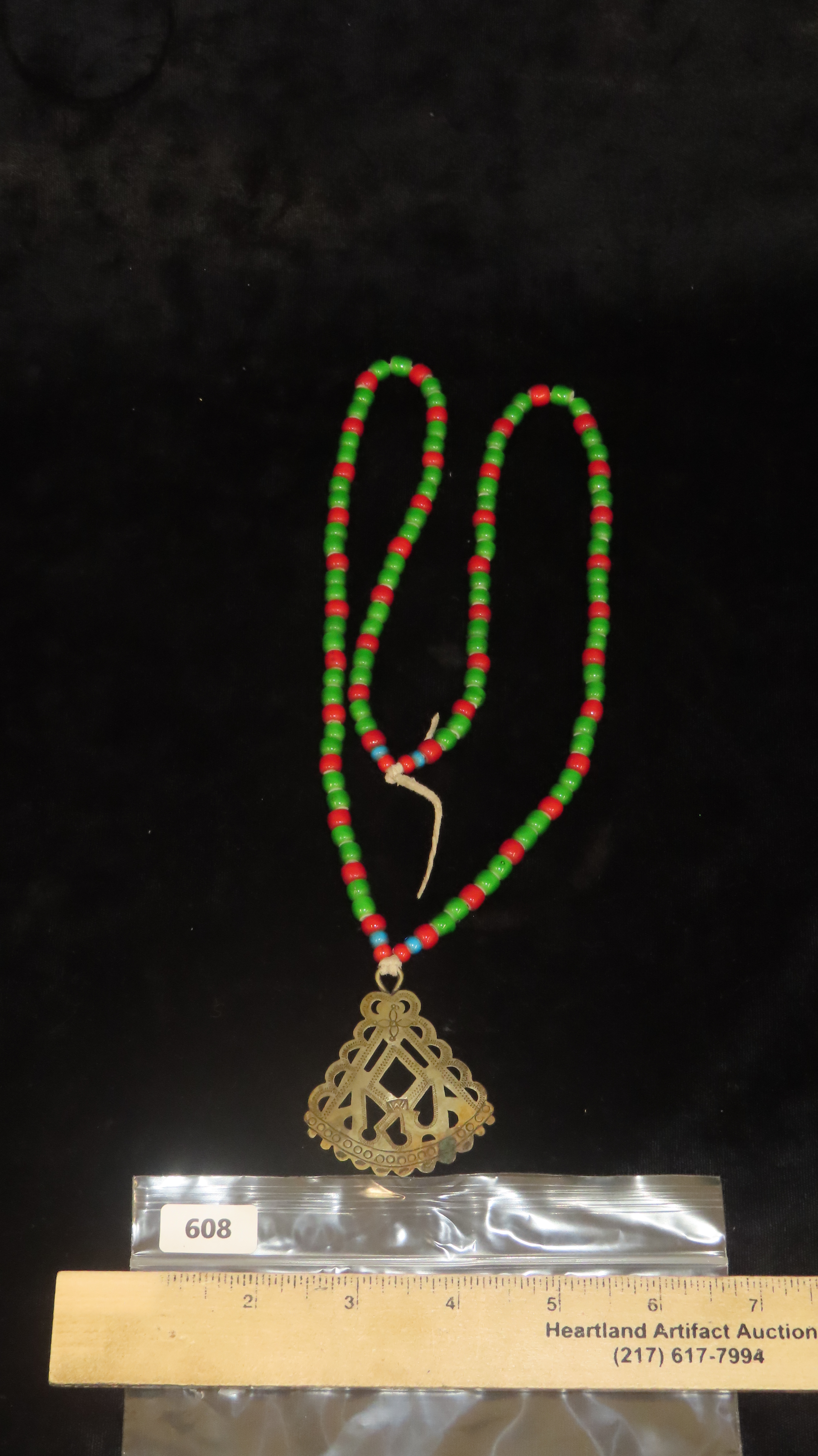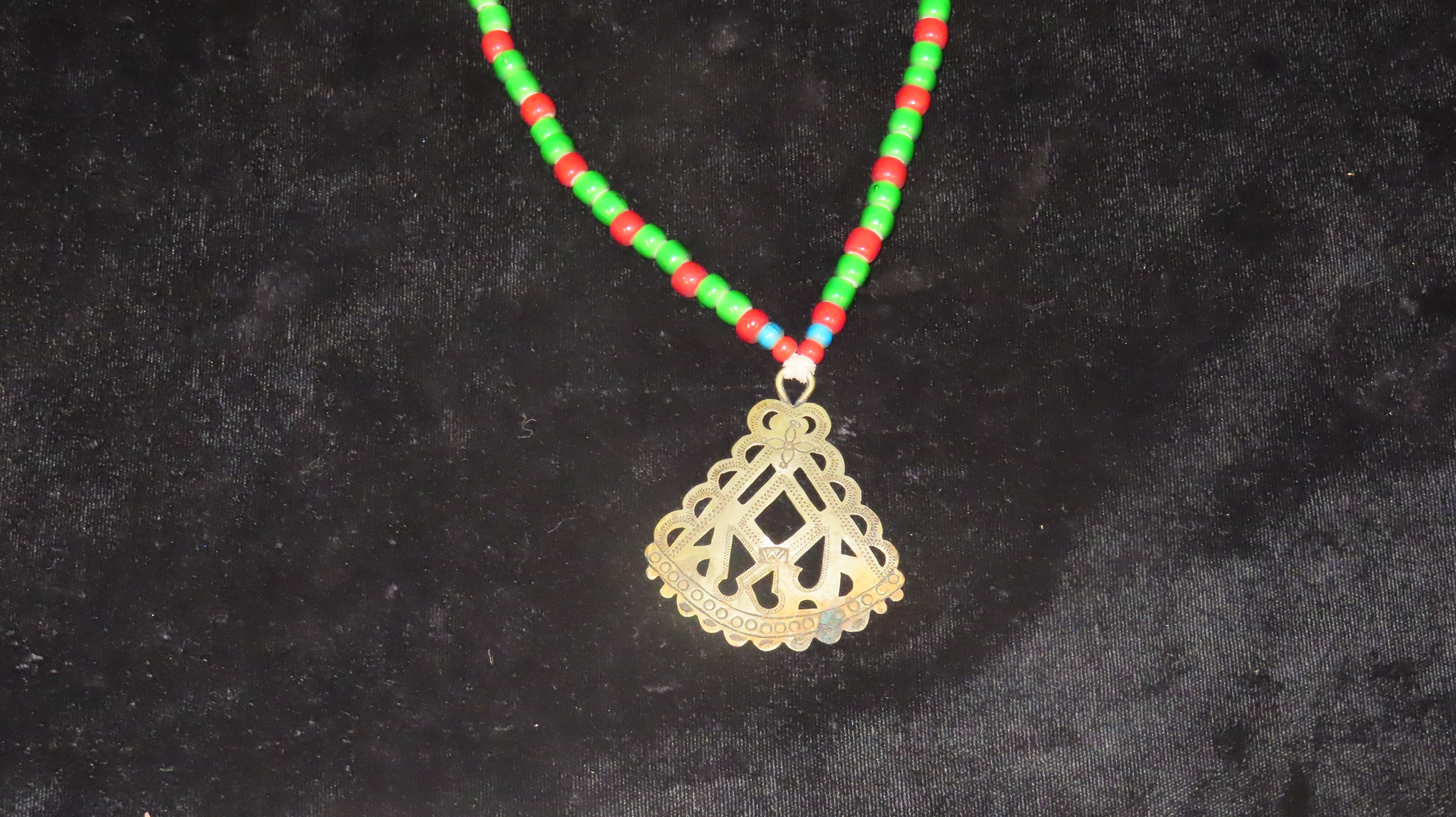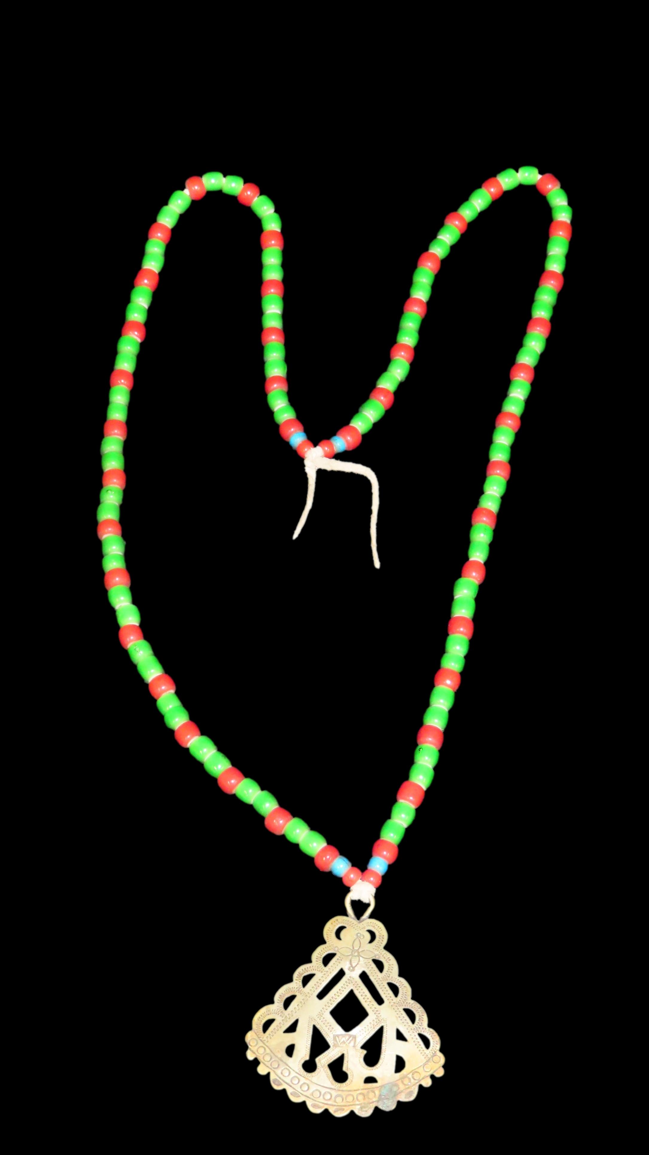 16 3/4″ Historic Necklace, Red and Green Beads with Metal Pendant