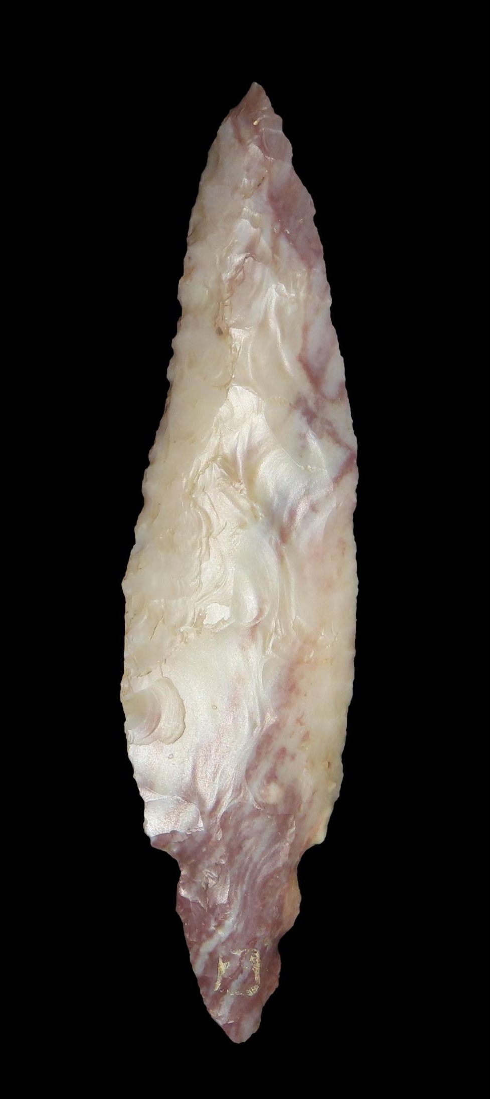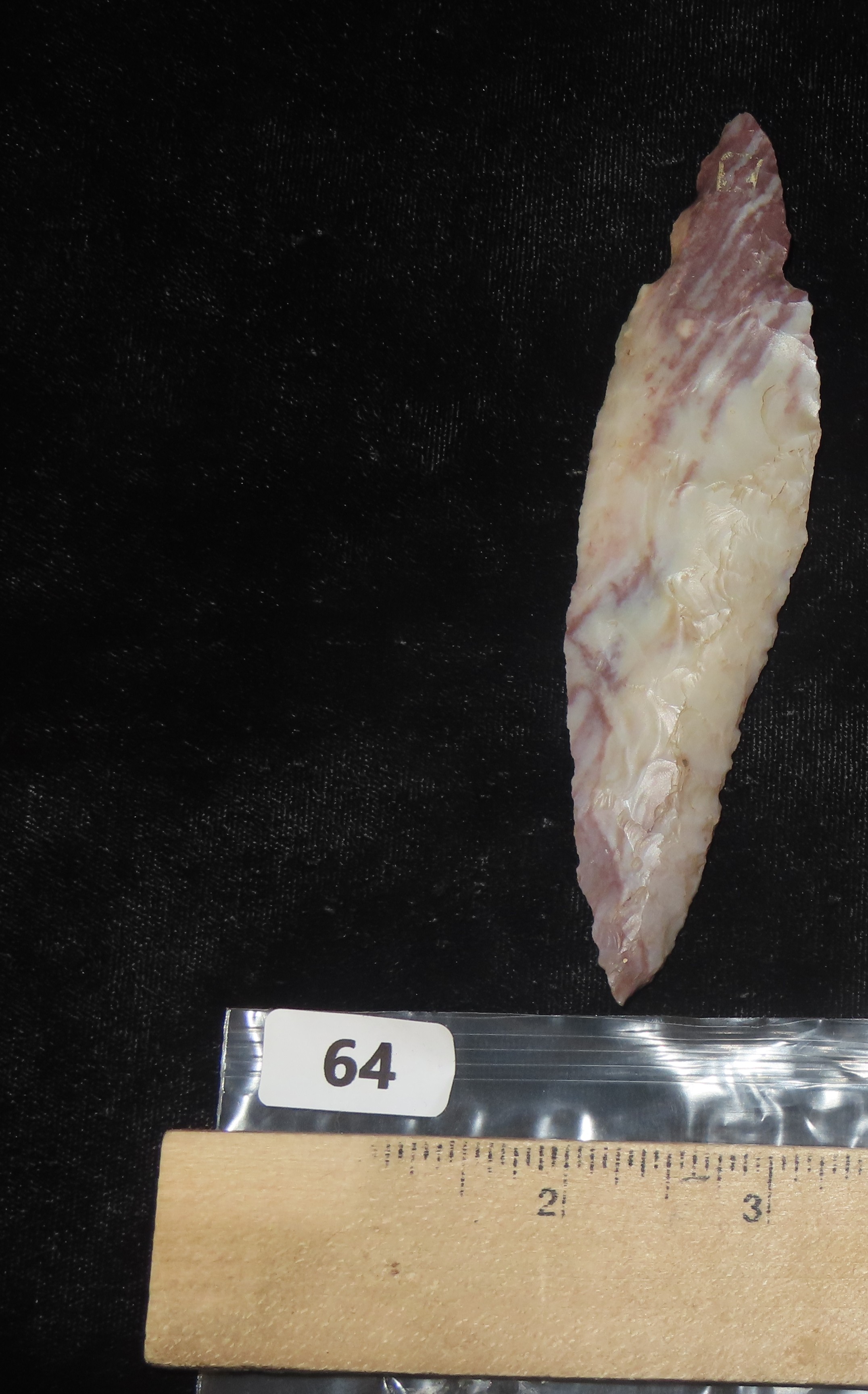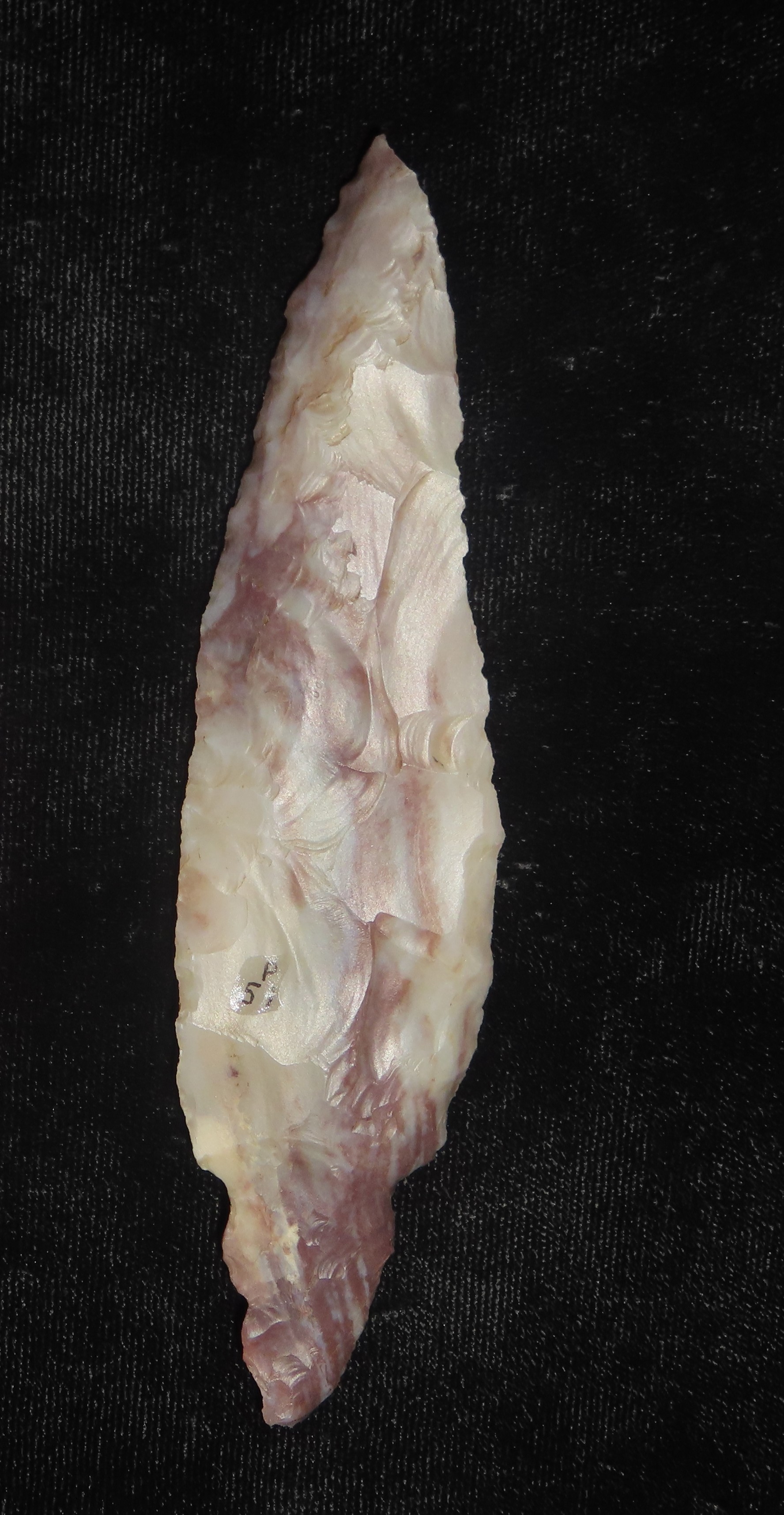 4 7/8″ Archaic Base Tang Blade, made of Alibates Flint, found in Mazatlan, MX in 1966