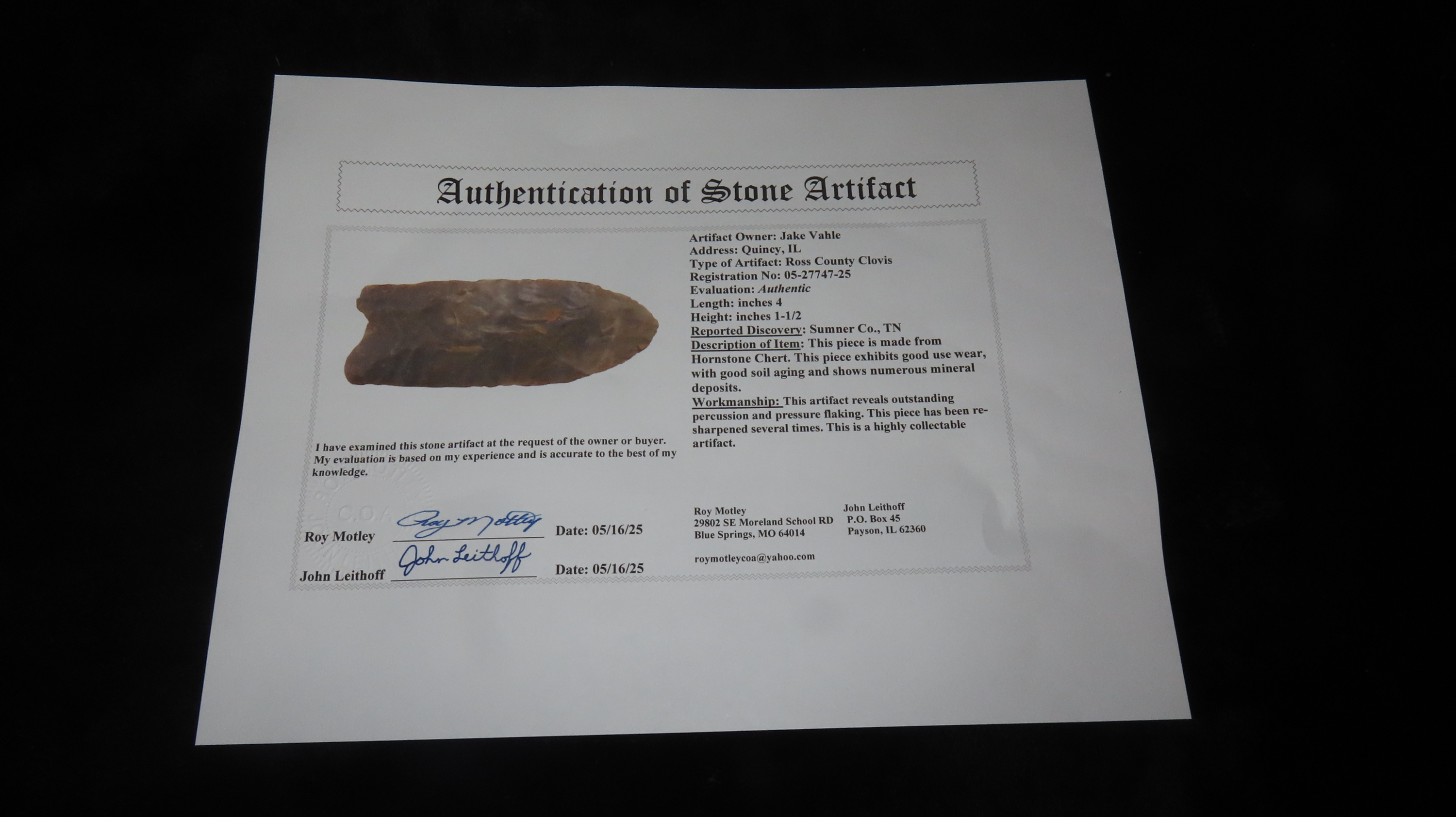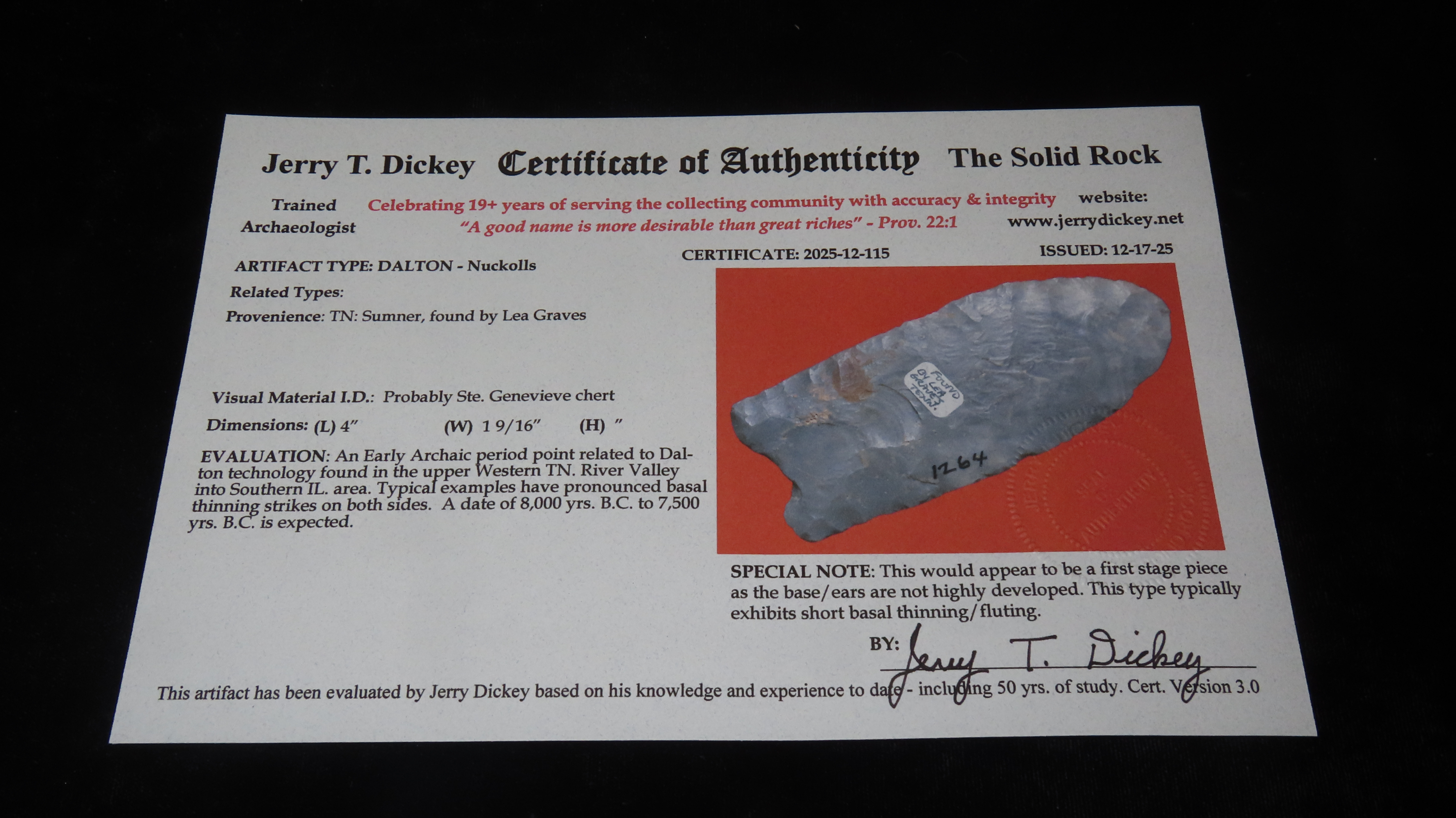 4″ x 1 9/16″ Nuckolls, Ste. Genevieve Chert, Tennessee, COA Dickey