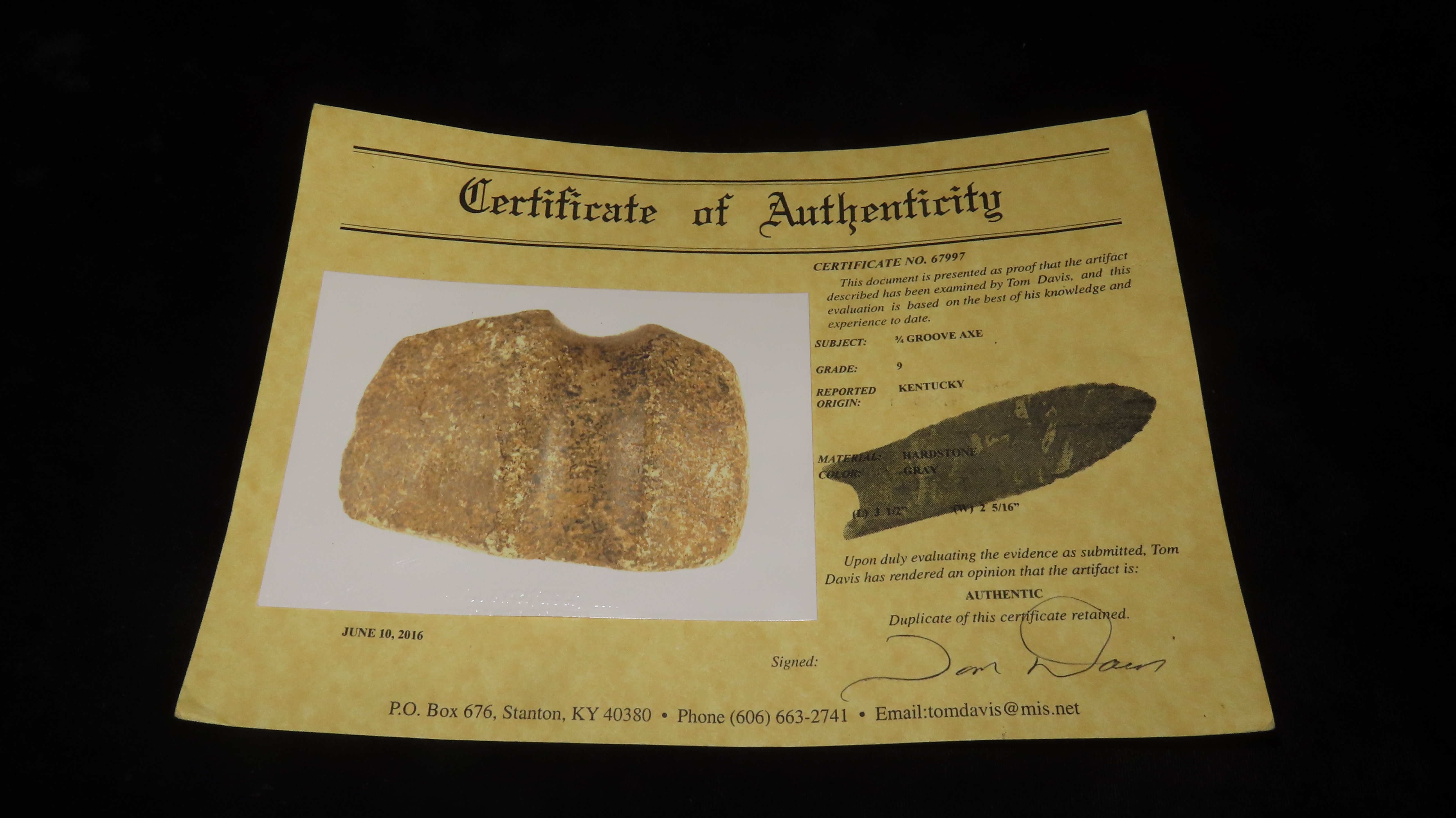 3 1/2″ x 2 5/16″ 3/4Groove Axe, Hardstone, Kentucky, COA Tom Davis