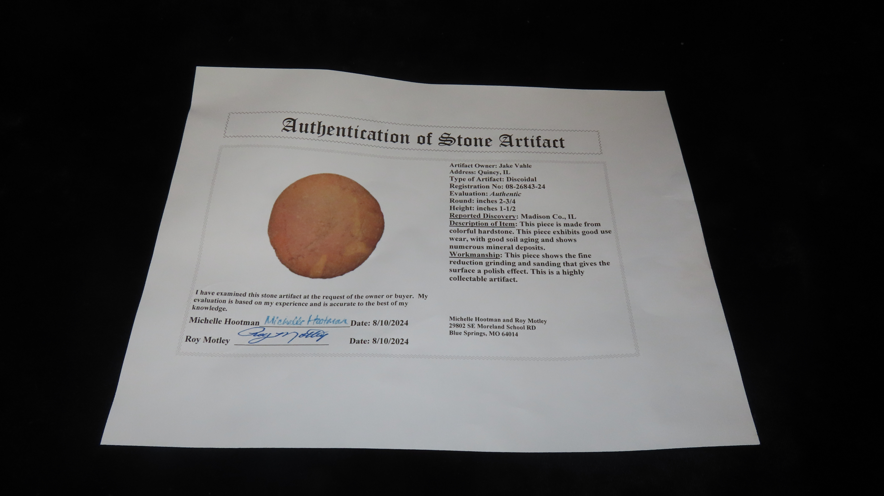 2 3/4″ x 1 1/2″ Discoidal, Colorful Hardstone, Madison Co., Illinois, COA Hootman and Motley