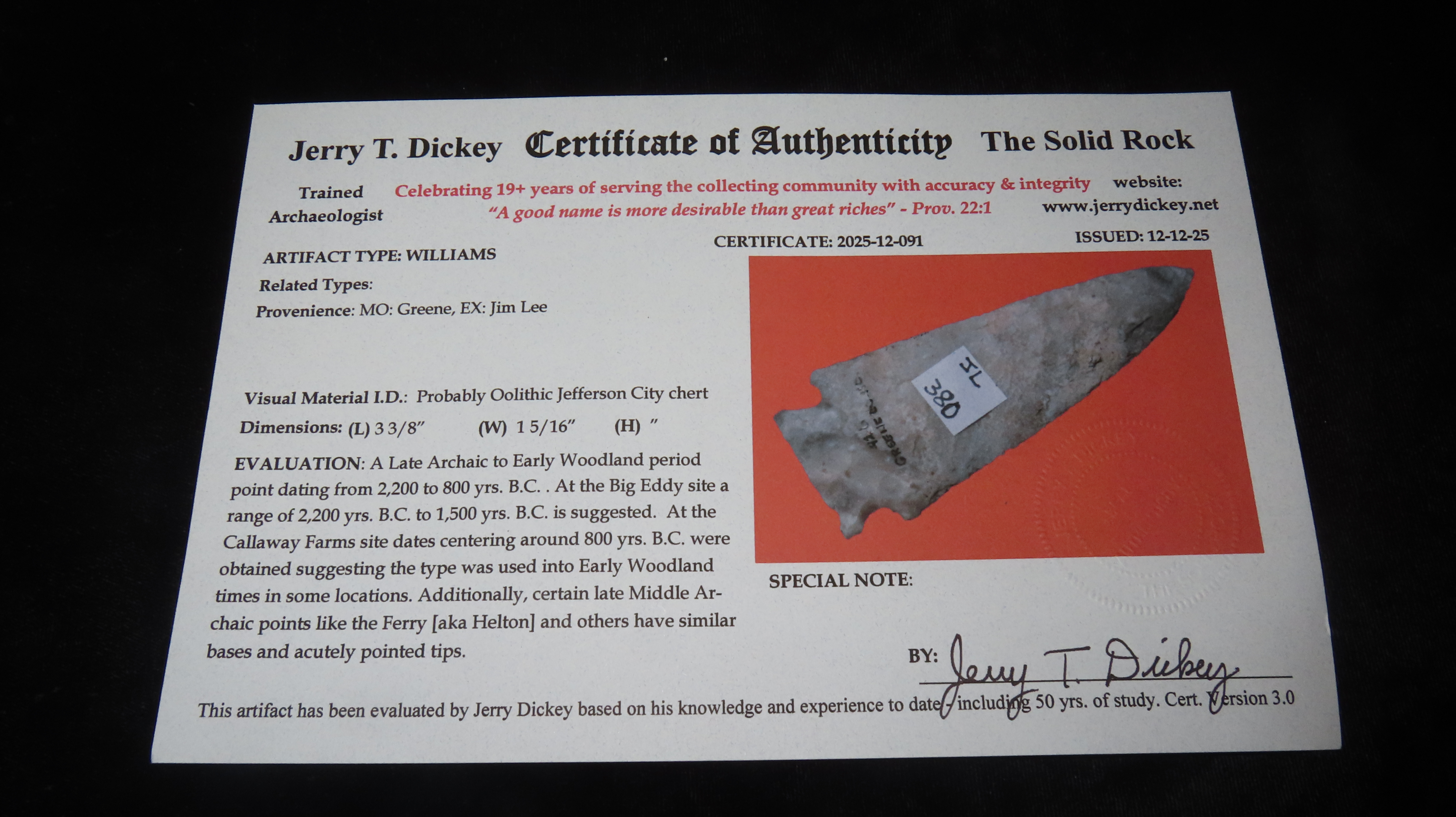 3 3/8″ x 1 5/16″ Williams, Dickey COA, Greene Co. Missouri, Oolithic Jefferson City Chert
