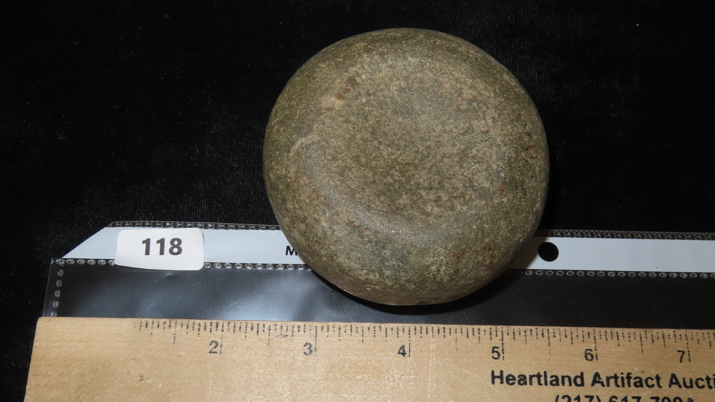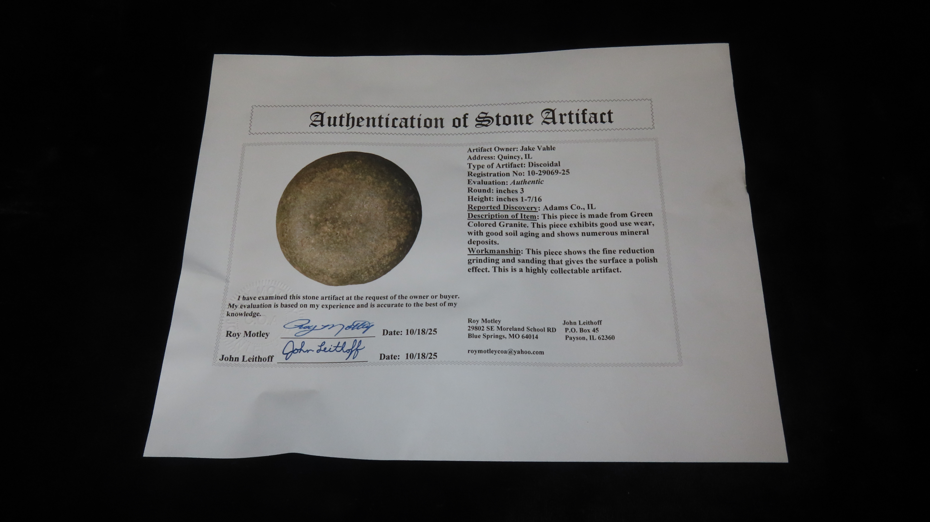 3 x 1 7/16" Discoidal, Green Colored Granite, Adams Co., Illinois, COA Motley and Leithoff