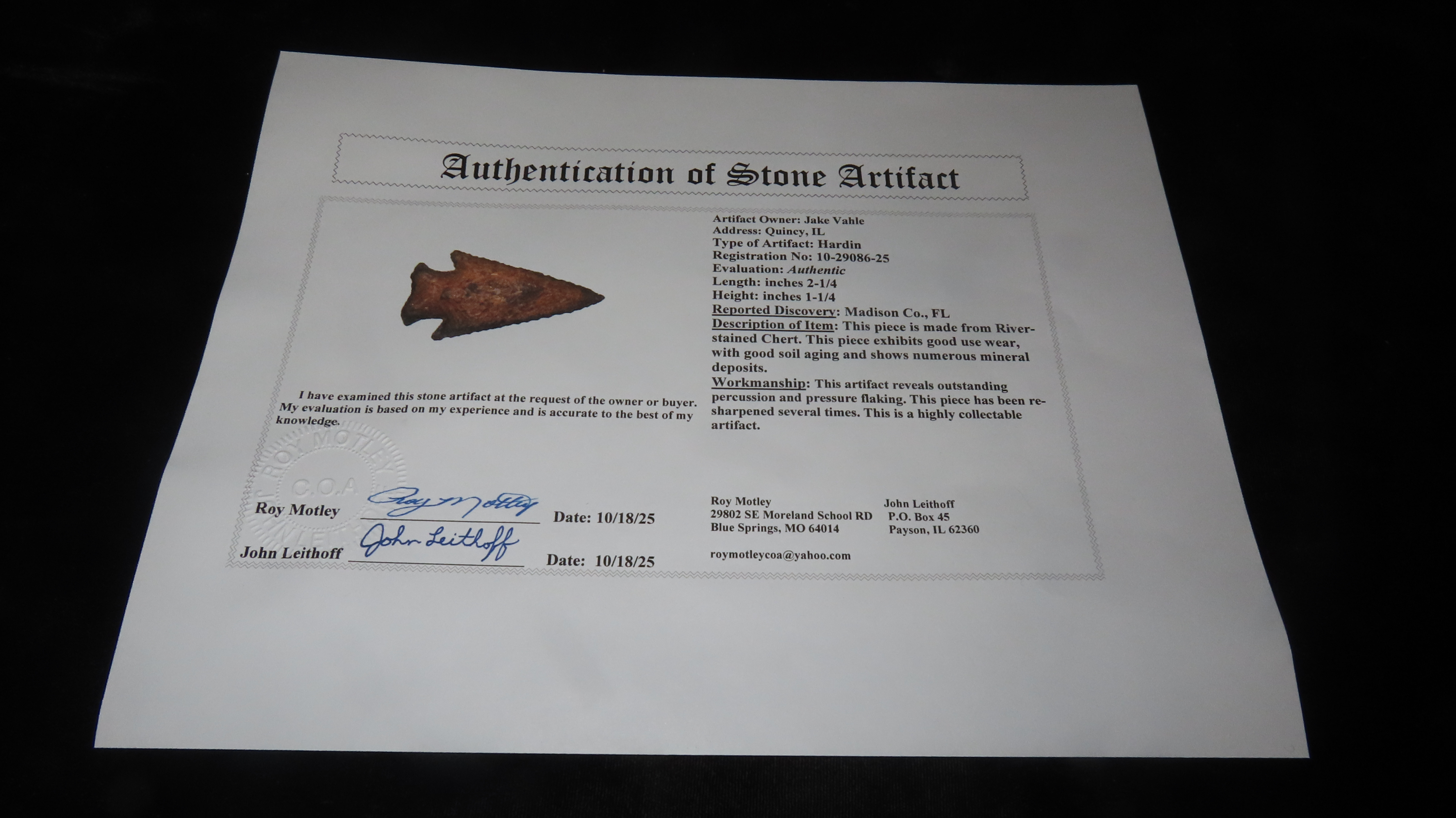 2 1/4″ x 1 1/4″ Hardin, Motley/Leithoff COA, River-stained Chert, Madison Co., Florida