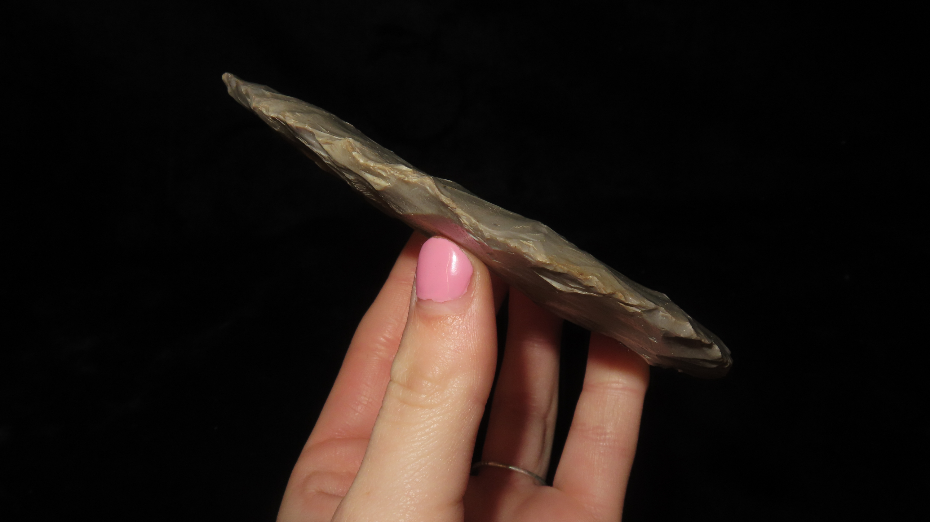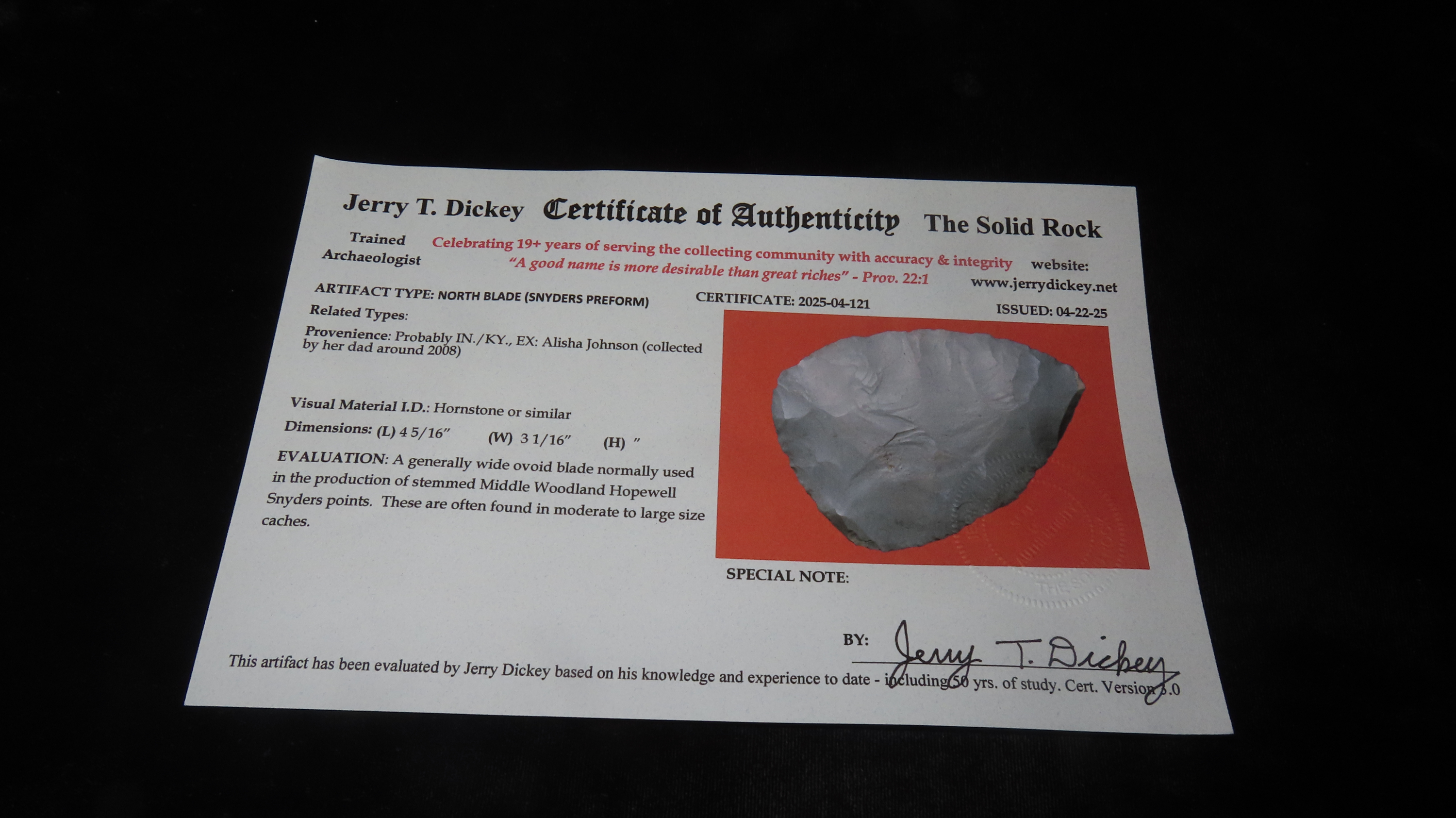 4 5/16″ x 3 1/16″ North Blade (Snyders Preform), Dickey COA, Hornstone or similar, Indiana/Kentucky, Ex. Alisha Johnson (collected by her dad around 2008)