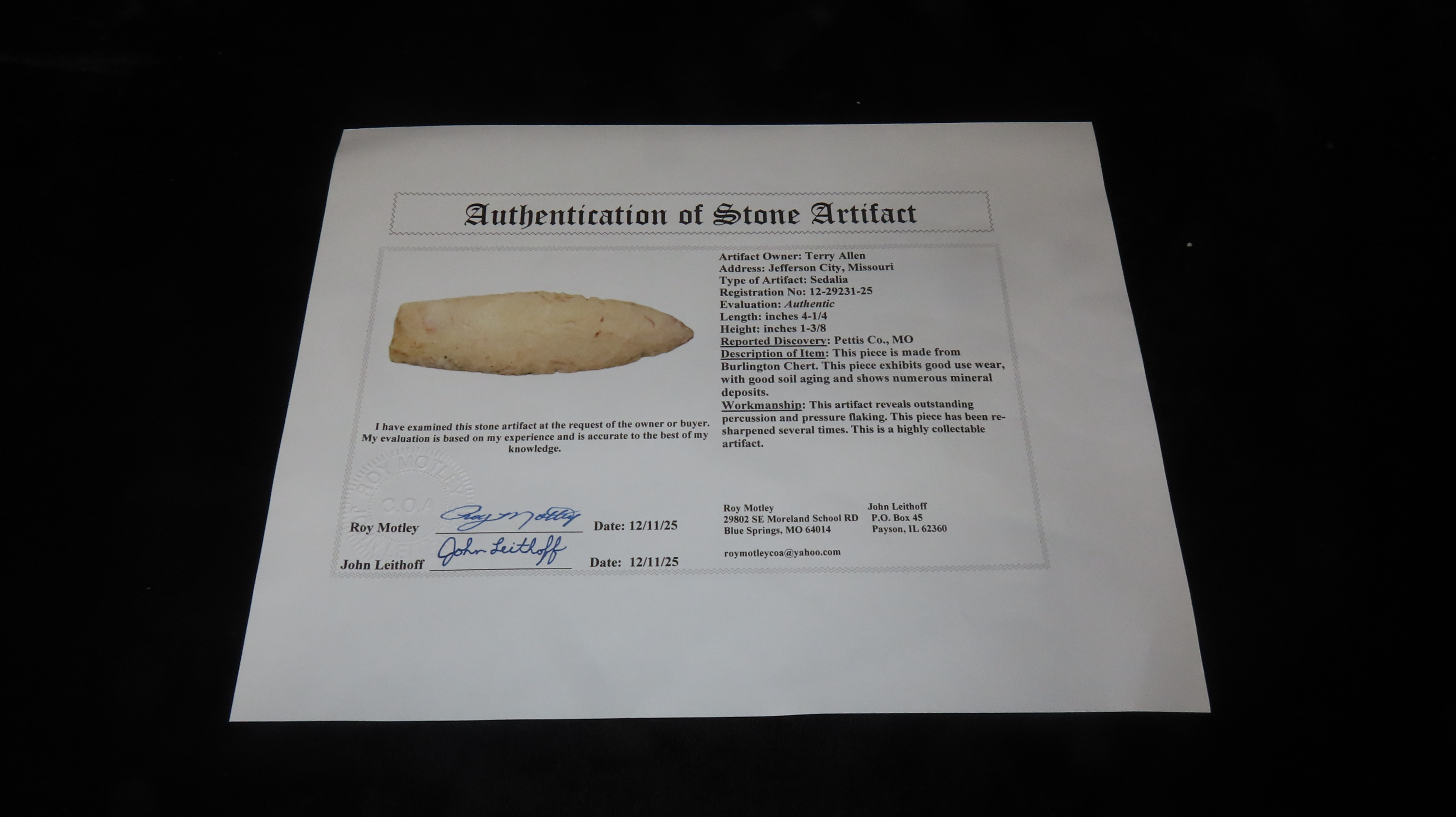 4 1/4″ x 1 3/8″ Sedalia, Burlington Chert, Pettis Co., Missouri, COA Motley and Leithoff, Ex. Terry Allen