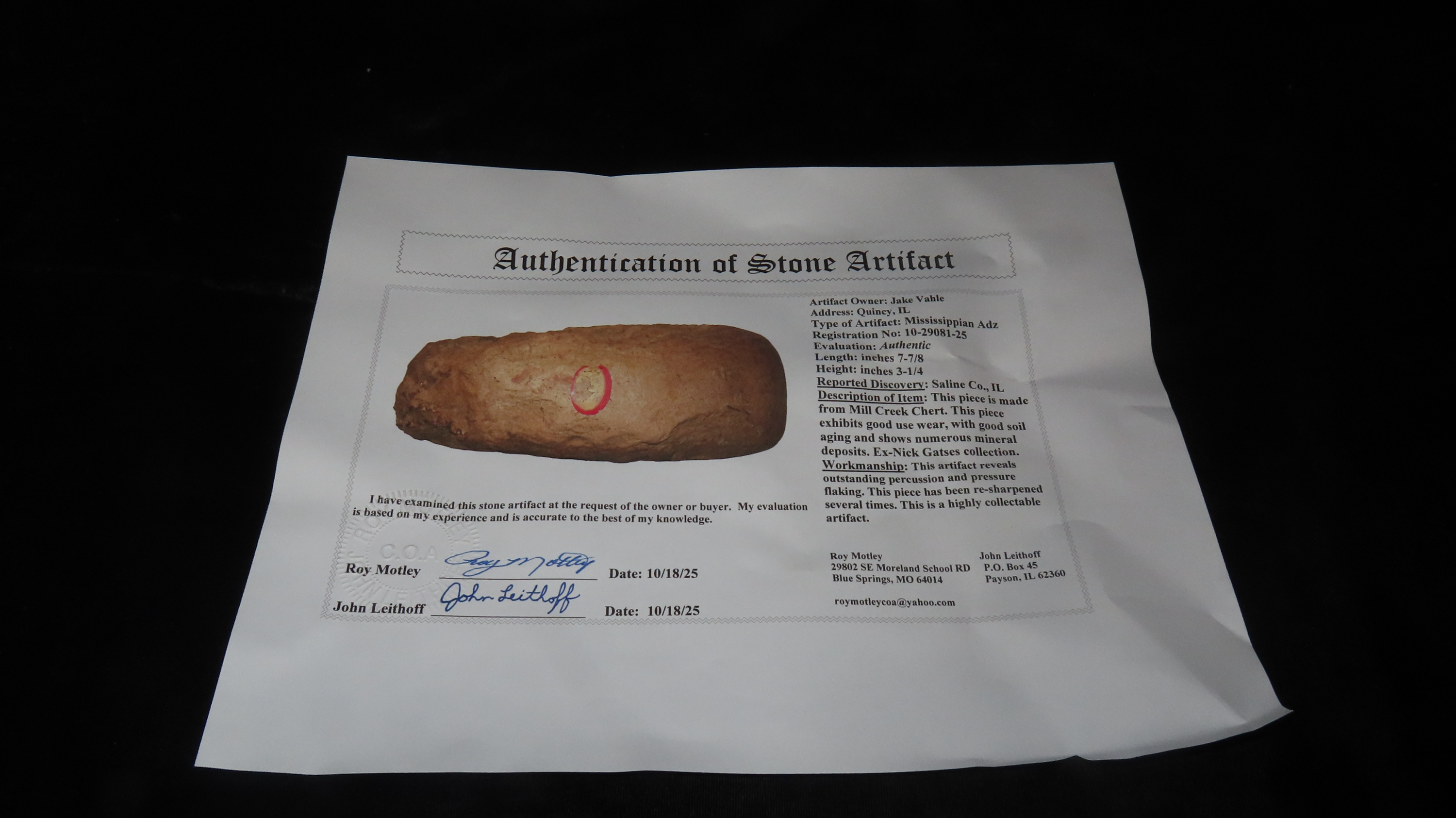 7 7/8″ x 3 1/4″ Mississippian Adze, Motley/Leithoff COA, Mill Creek Chert, nicely polished, Saline Co., Illinois