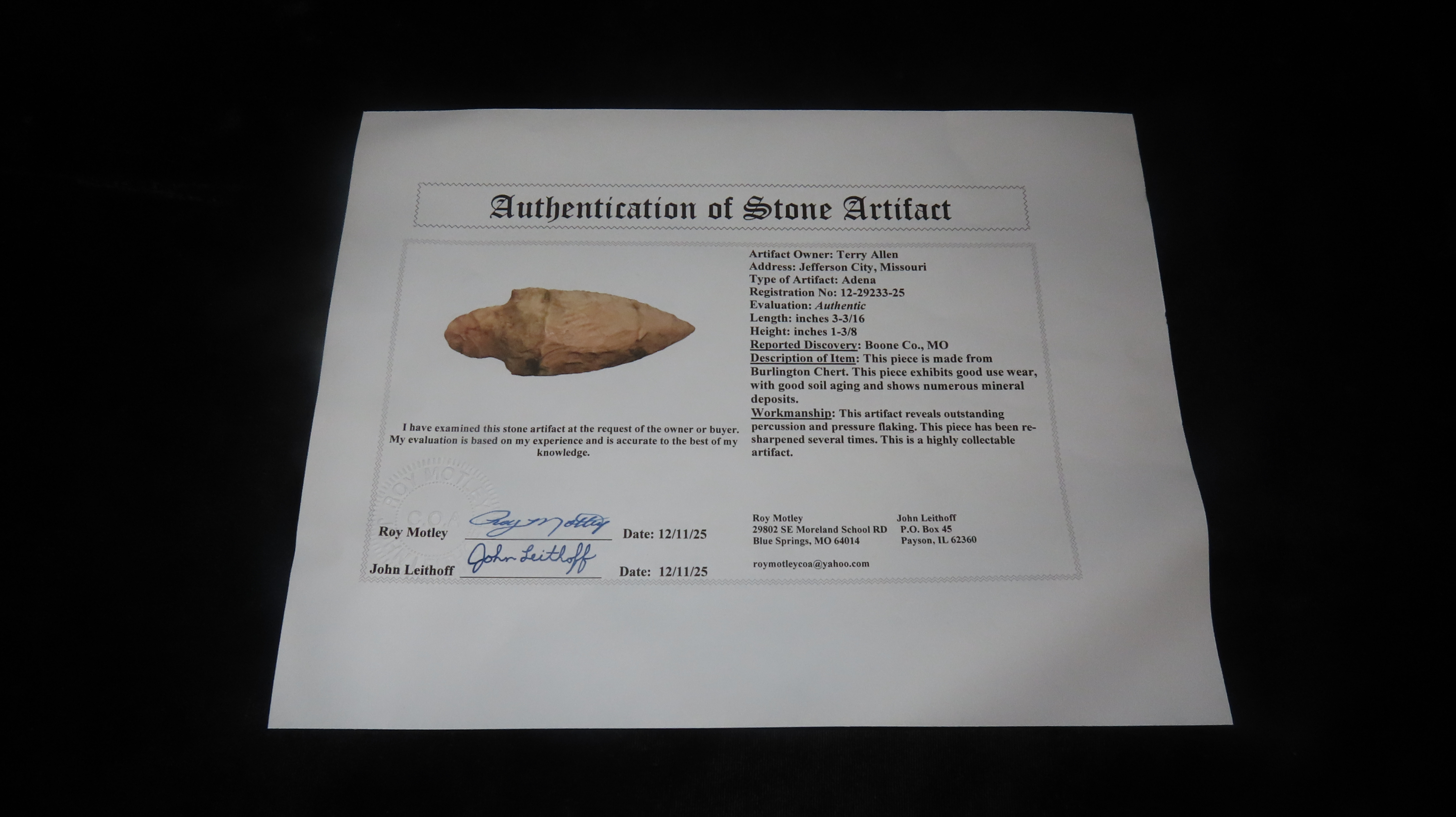 3 3/8″, Burlington Chert Adena, COA Motley, Boone Co., MO, Ex. Terry Allen