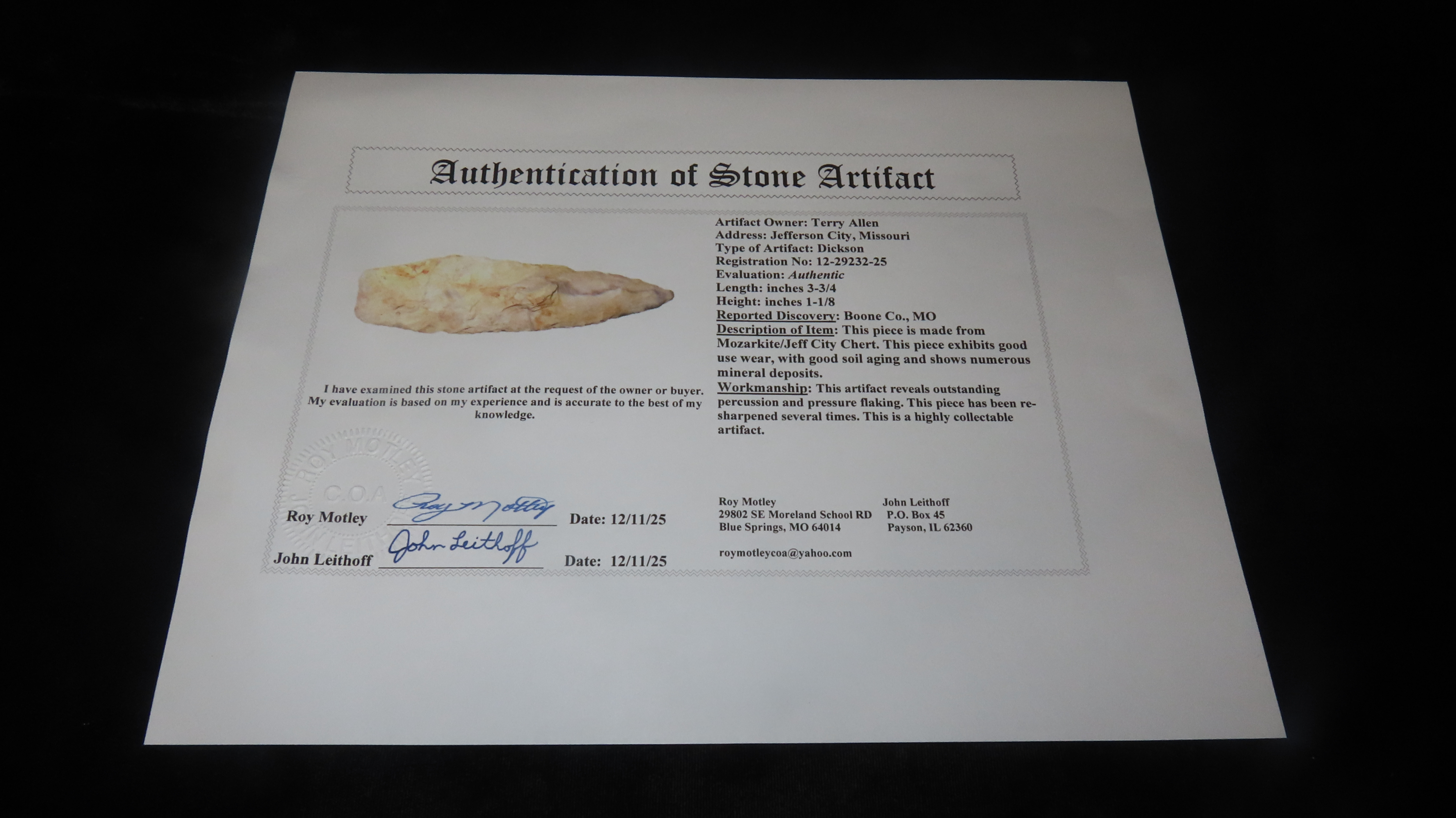 Dickson, 3 3/4″, Missouri, COA Roy Motley & John Leithoff, Mozarkite (Jeff City Chert), Boone County MO