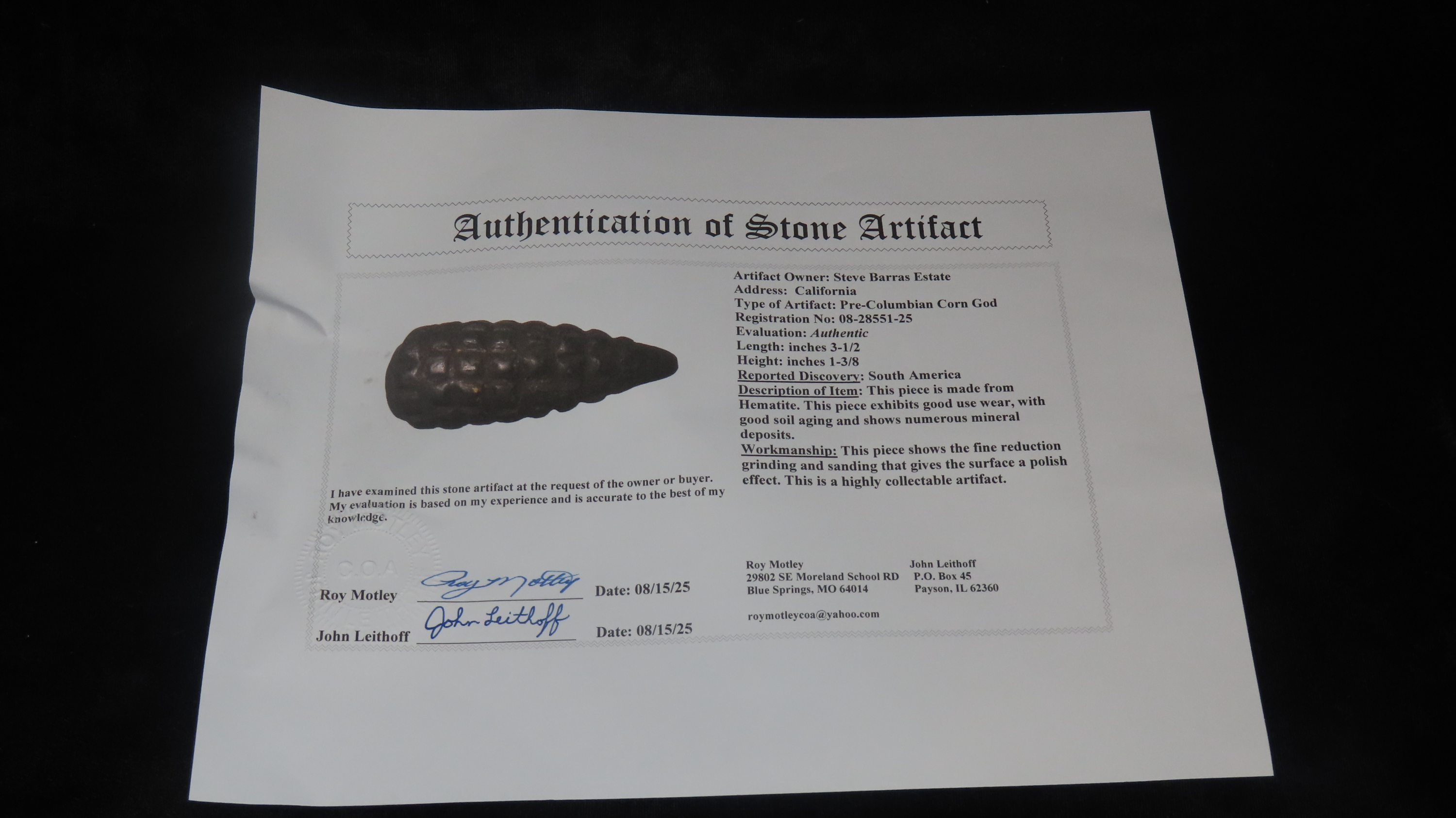 5 1/2″ Pre-Columbian Corn God, COA Roy Motley & John Leithoff, Made of Hematite, Found in South America, Ex. Steve Barras Estate