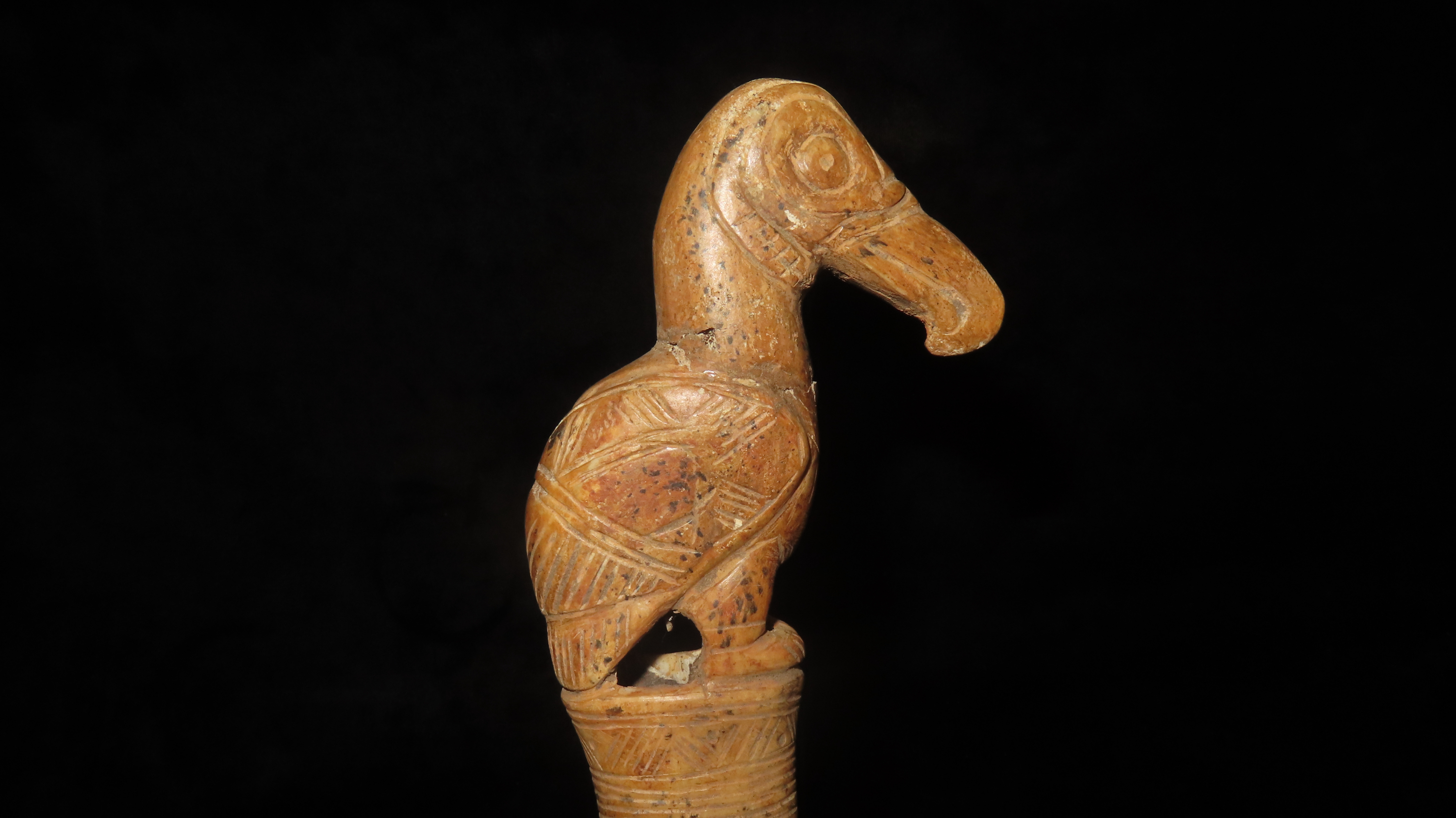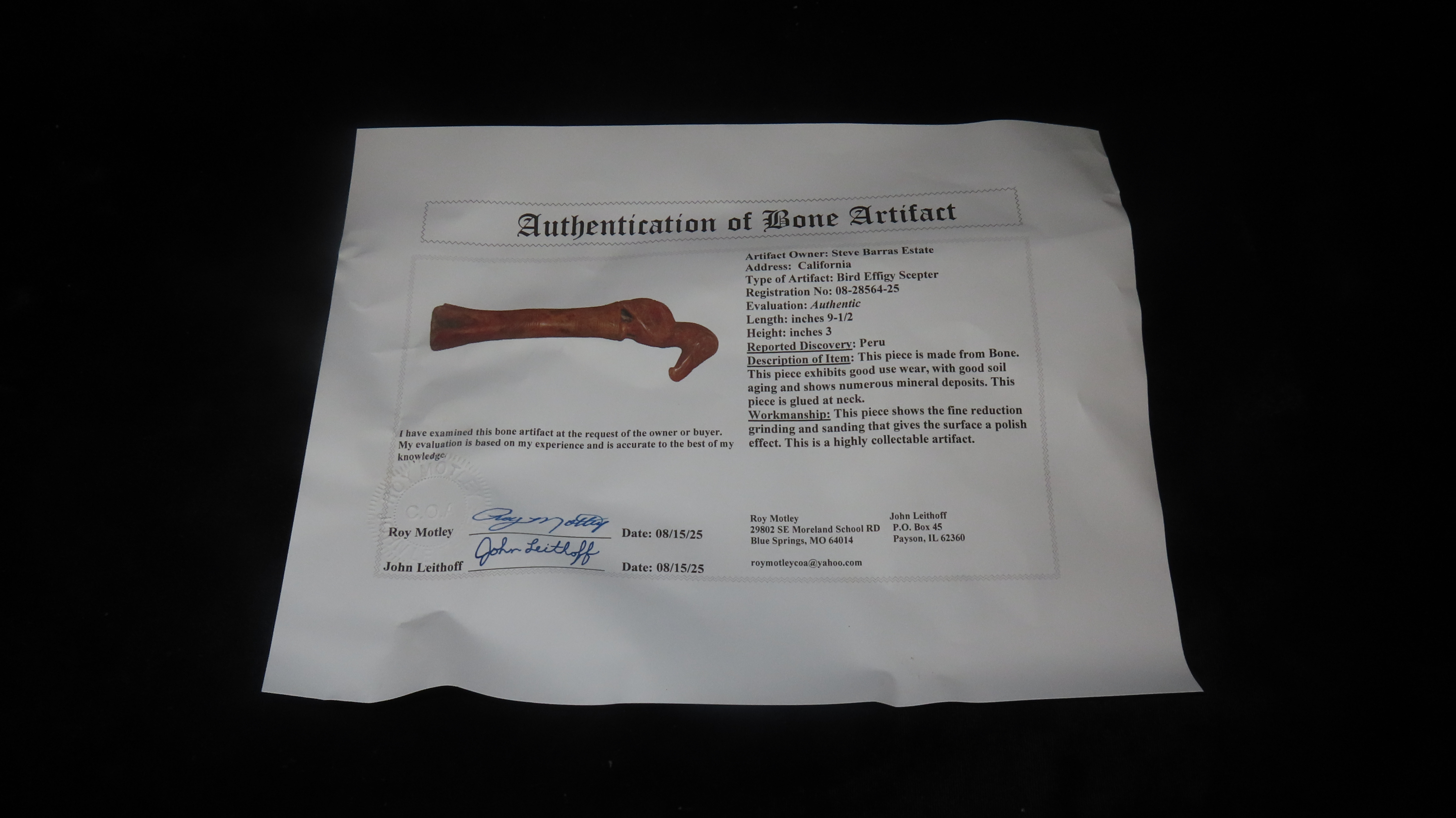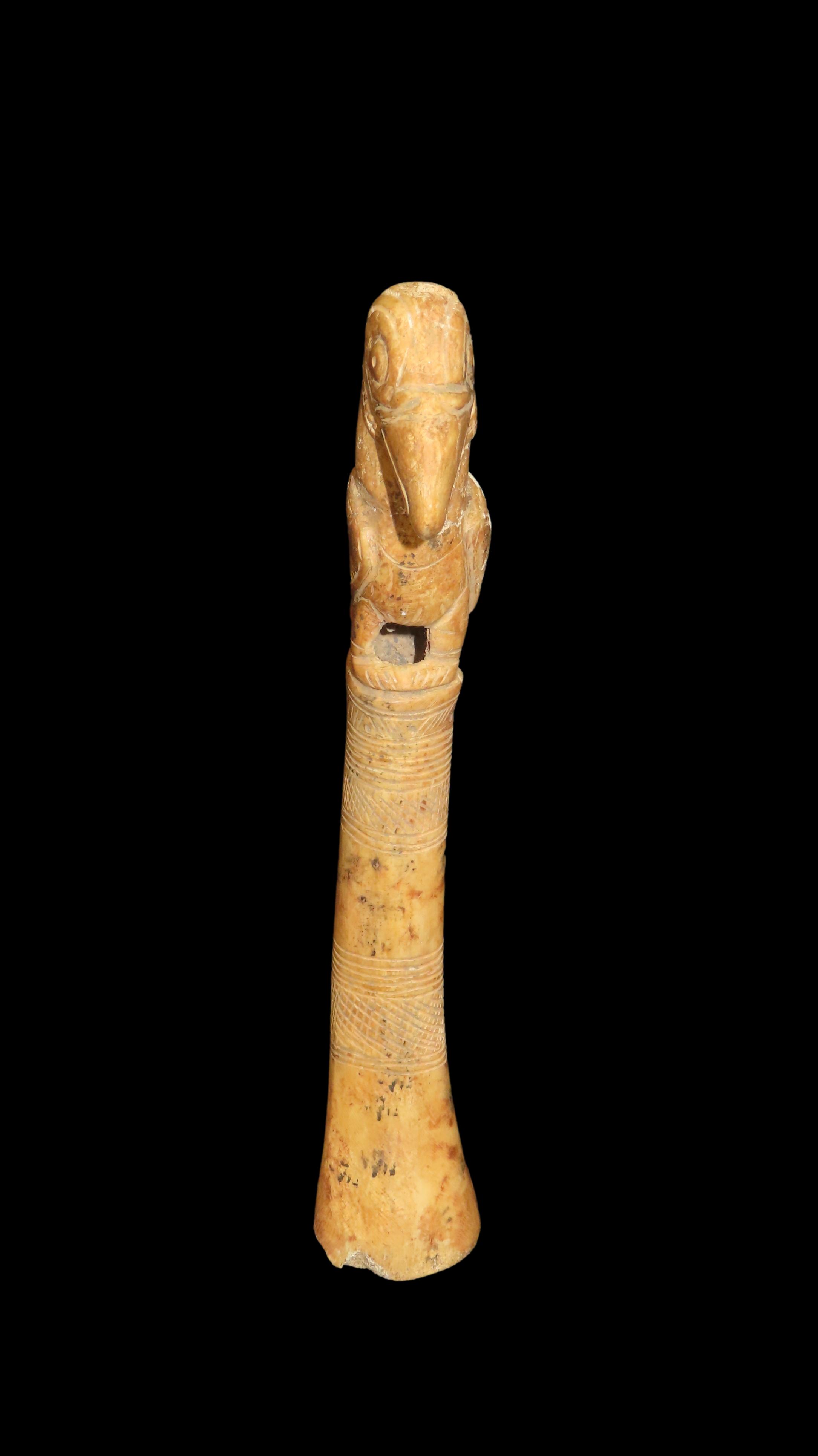9-1/2" Bird Effigy Scepter, COA Roy Motley & John Leithoff, Made of Bone, Found in Peru, Ex. Steve Barras Estate