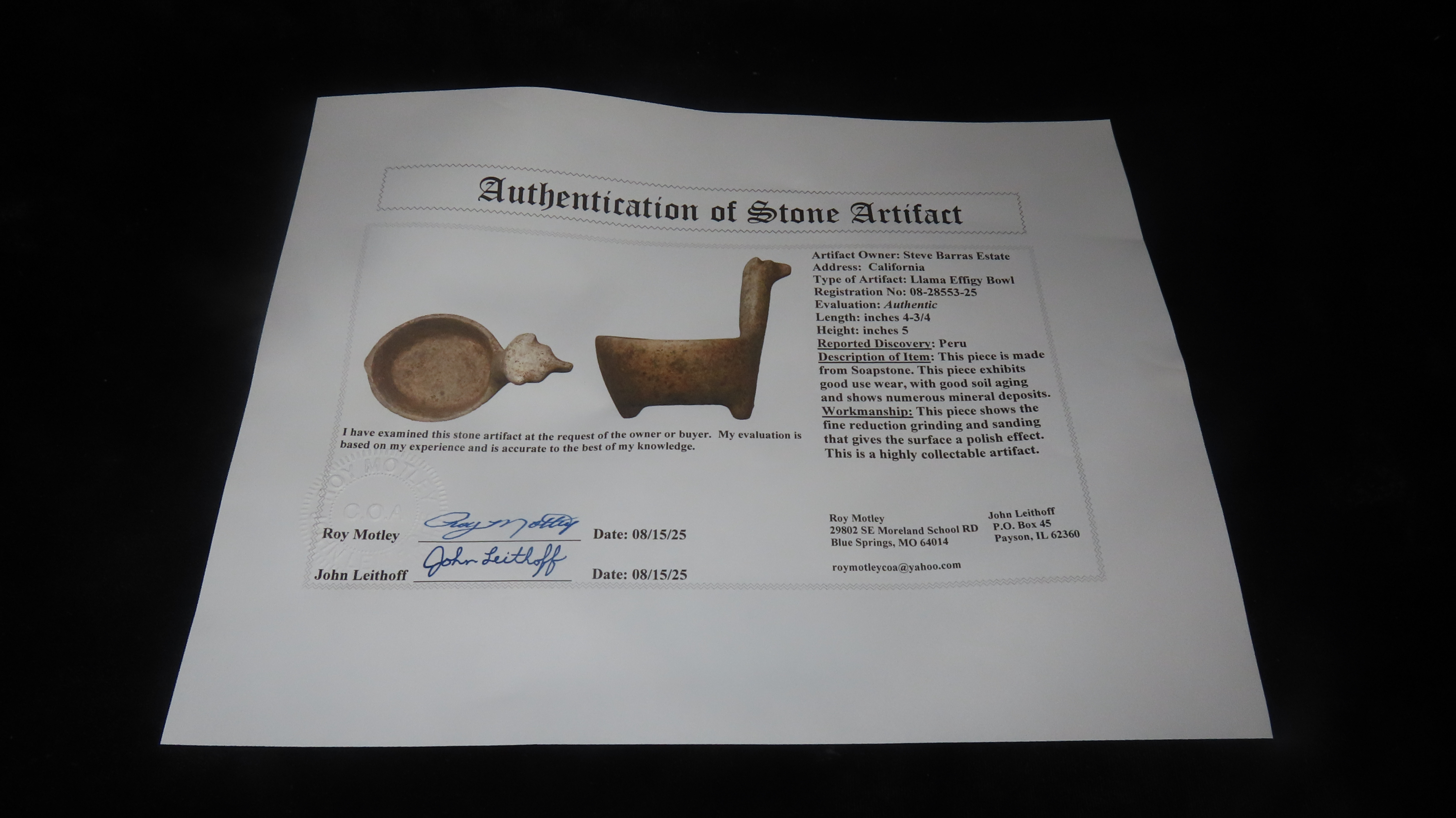 4 3/4″ x 5″ Llama Effigy Bowl, Soapstone, Motley/Leithoff COA, Reportedly found in Peru, Ex. Steve Barras Estate