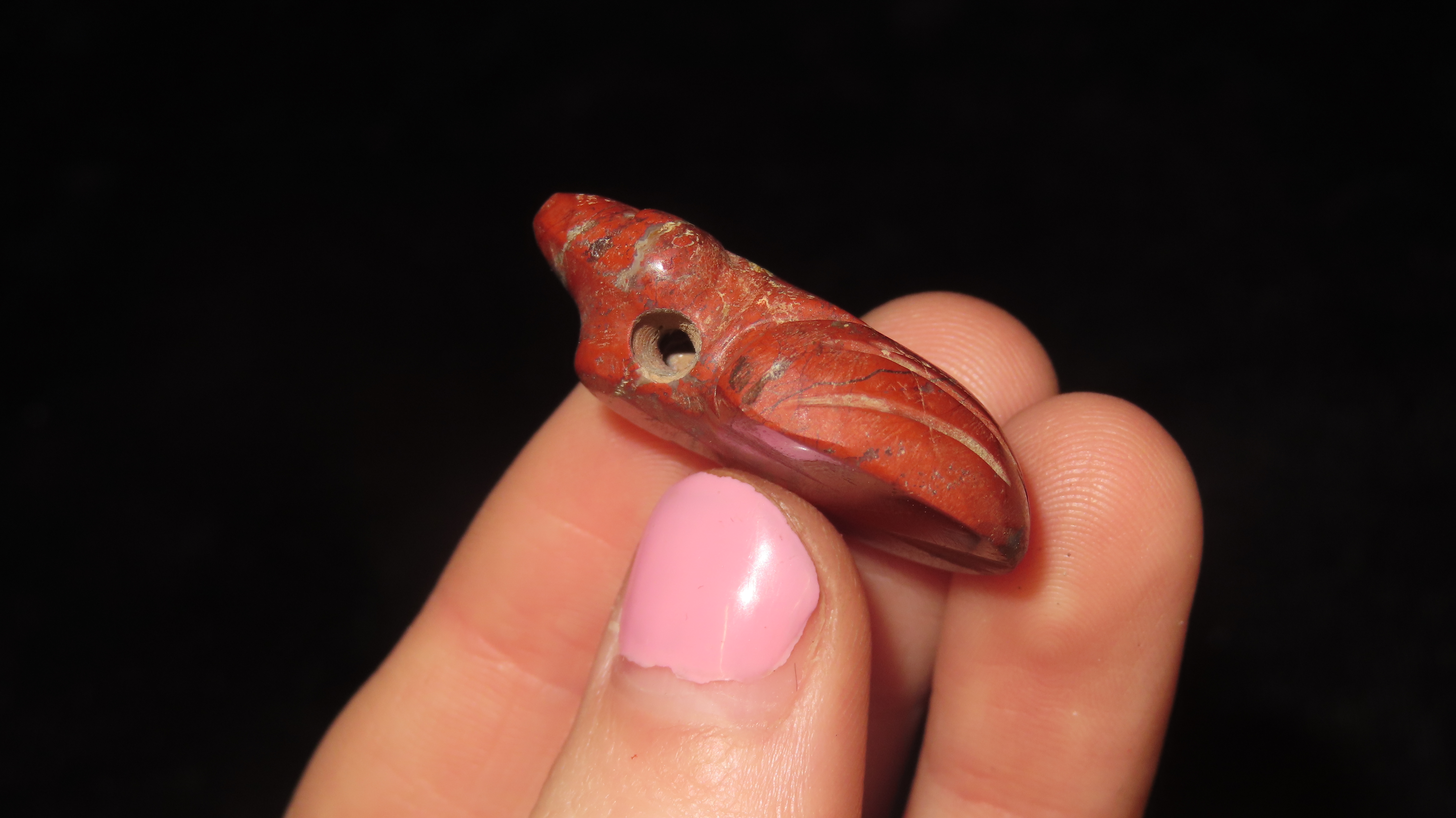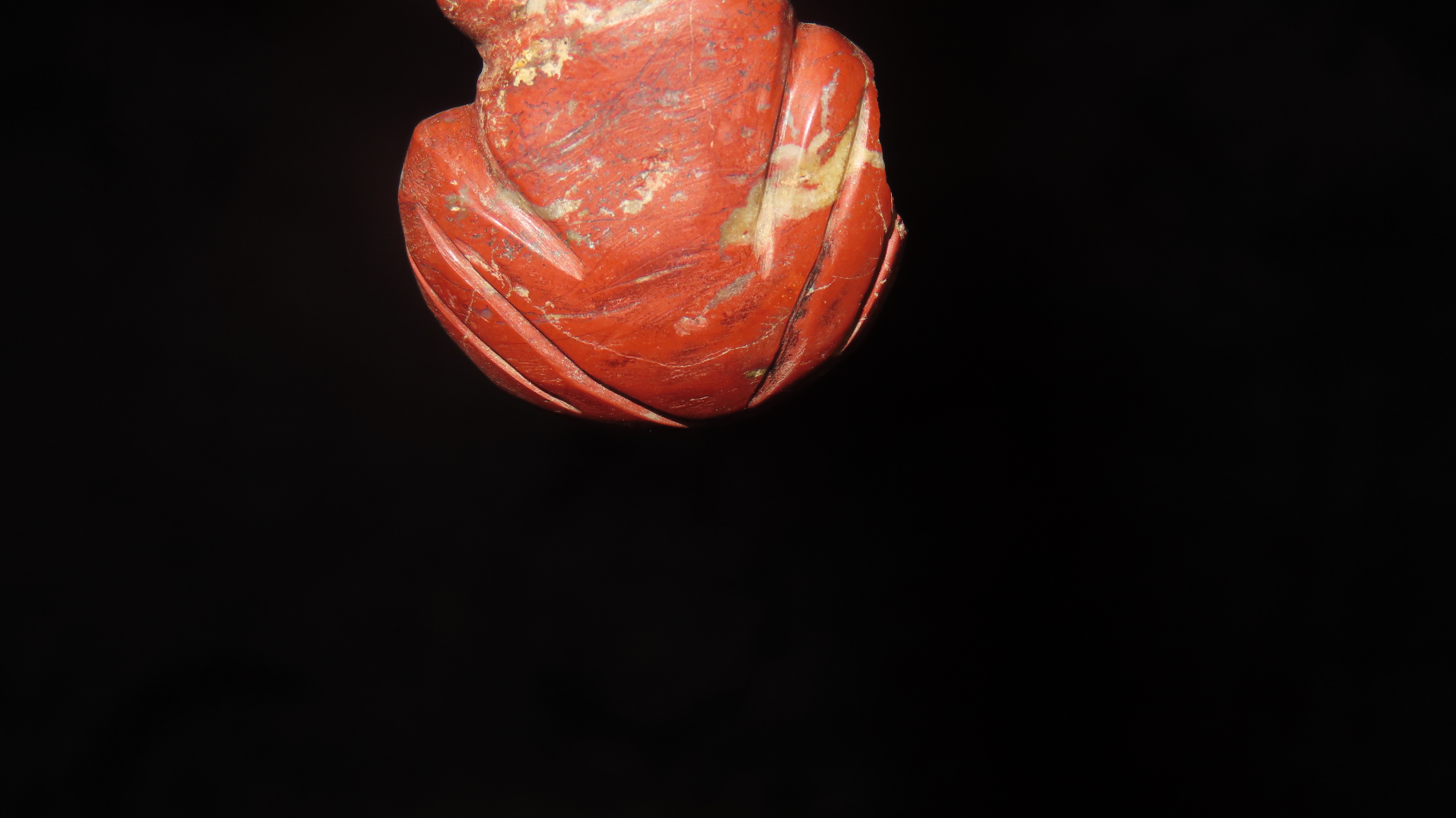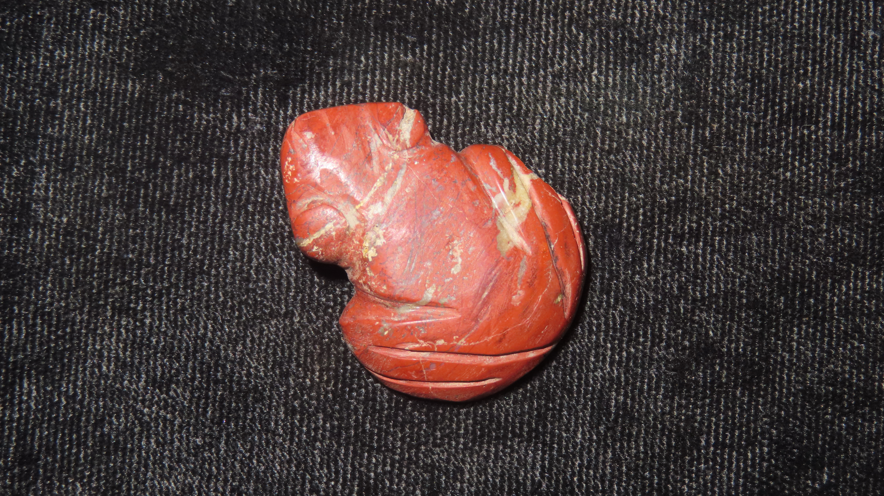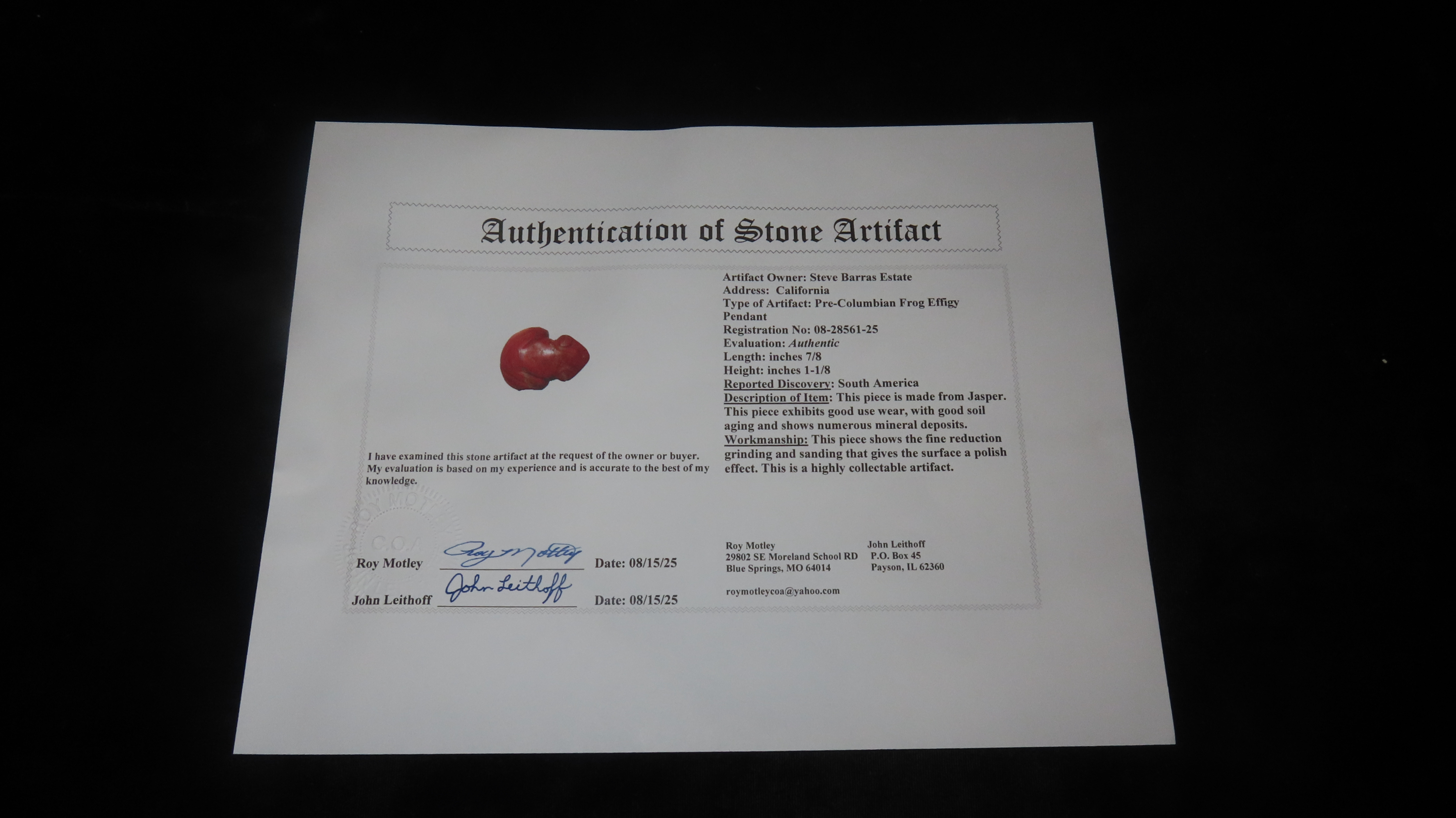 1 1/8″ Pre-Columbian Frog Effigy Pendant, Jasper, Motley/Leithoff COA, Reportedly found in South America, Ex. Steve Barras Estate