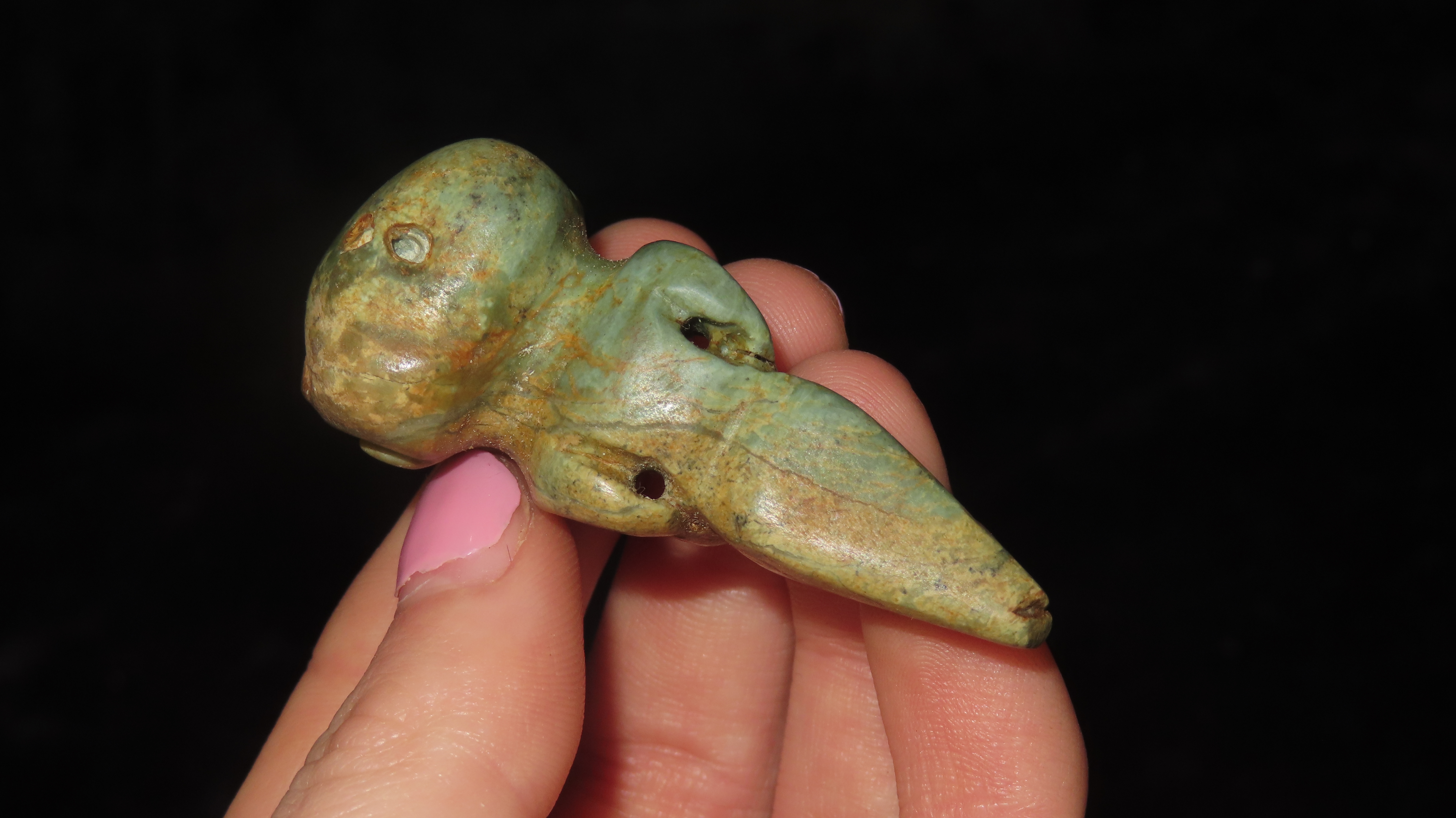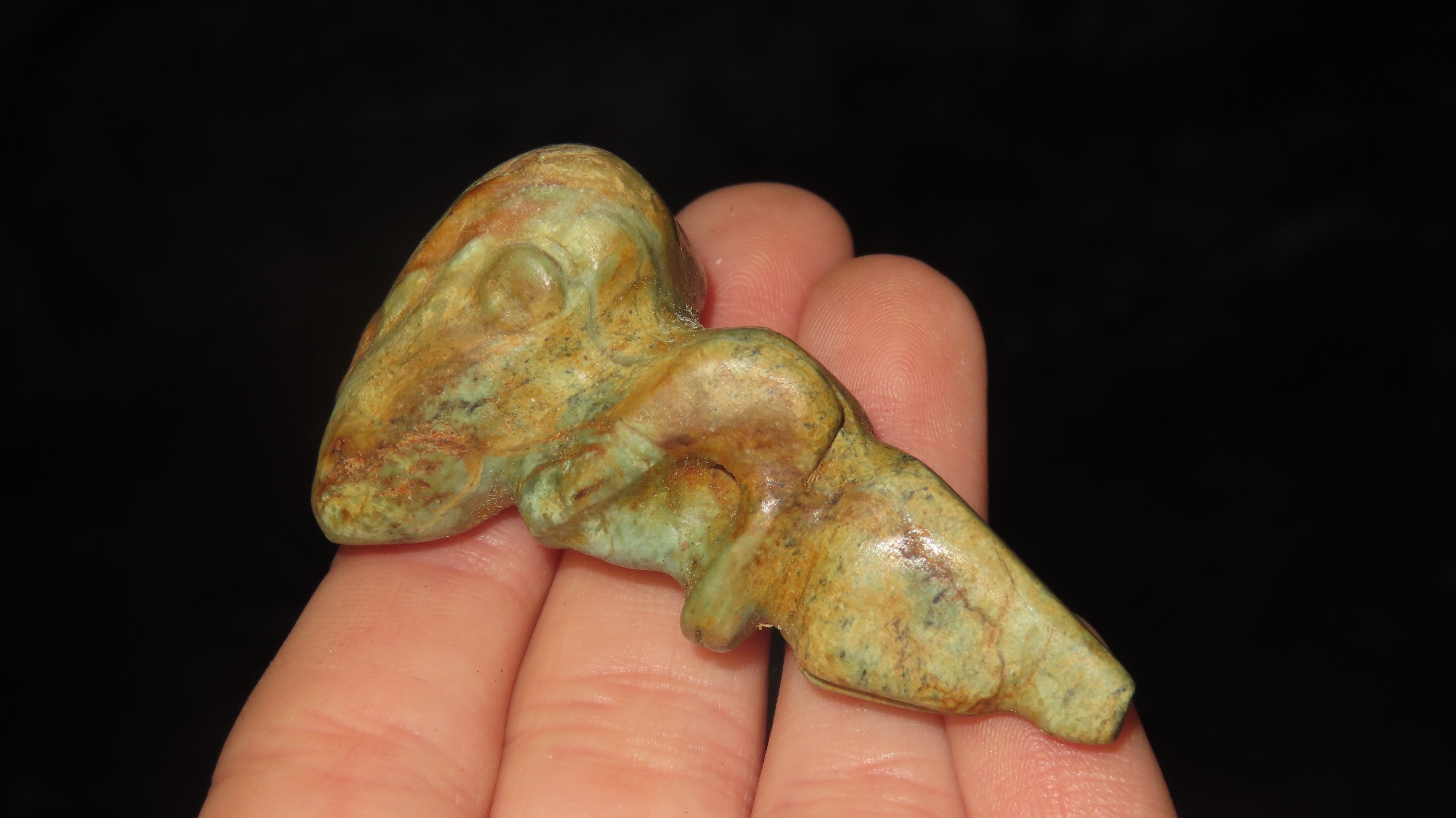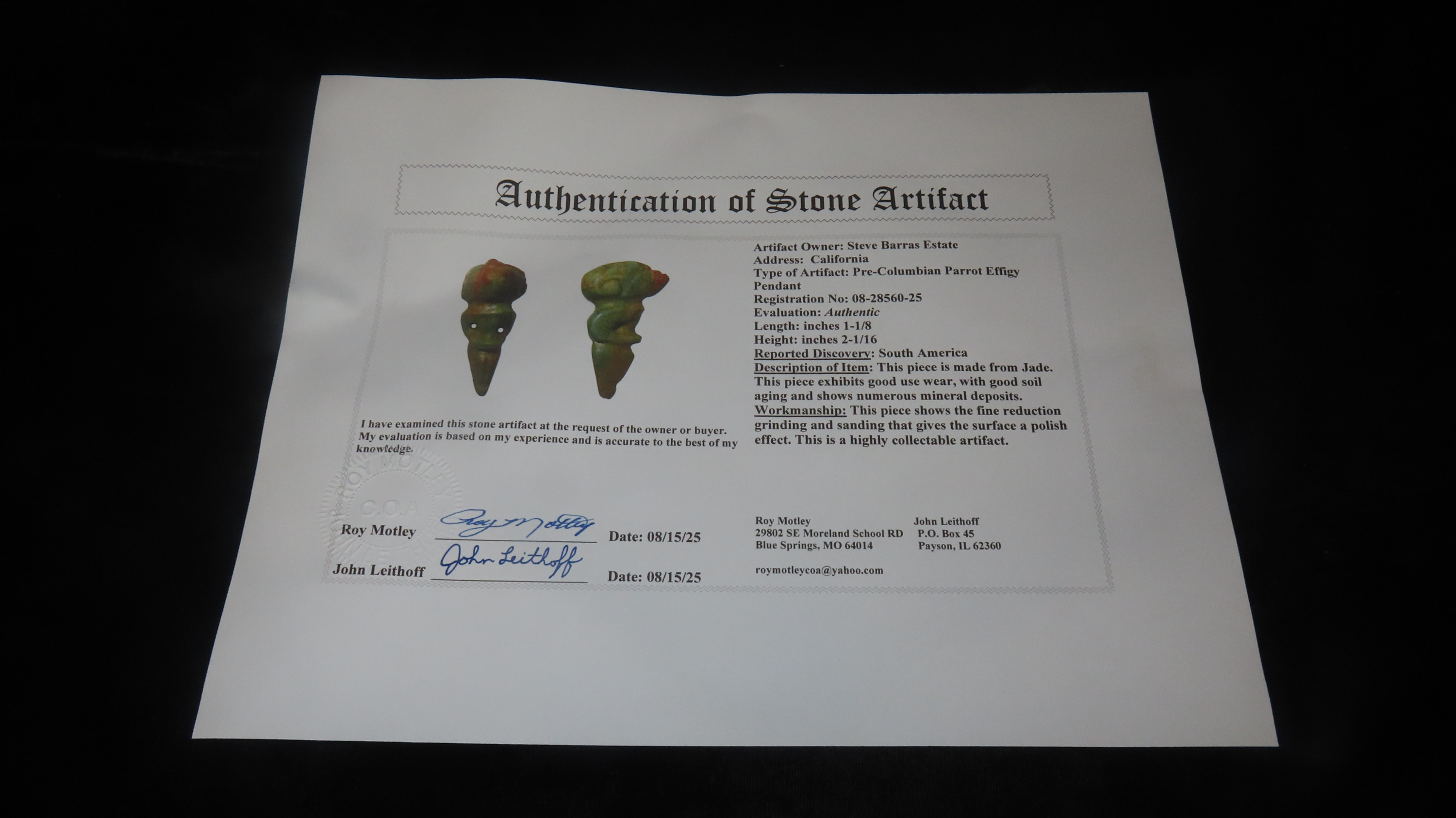 1 1/8″ x 2 1/16″ Pre-Columbian Parrot Effigy Pendant, Jade, Motley/Leithoff COA, Reportedly found in South America, Ex. Steve Barras Estate
