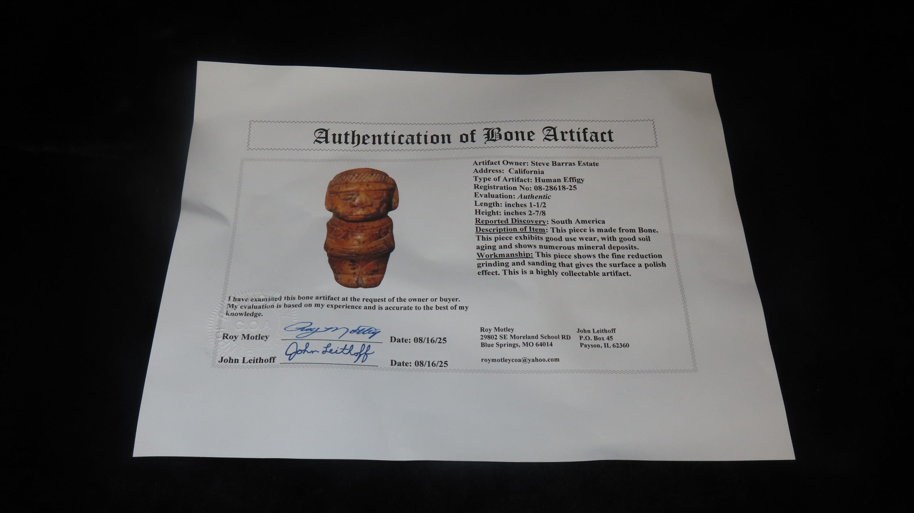 2 7/8″ x 2 7/8″ Human Effigy, Bone, Motley/Leithoff COA, Reportedly found in South America, Ex. Steve Barras Estate