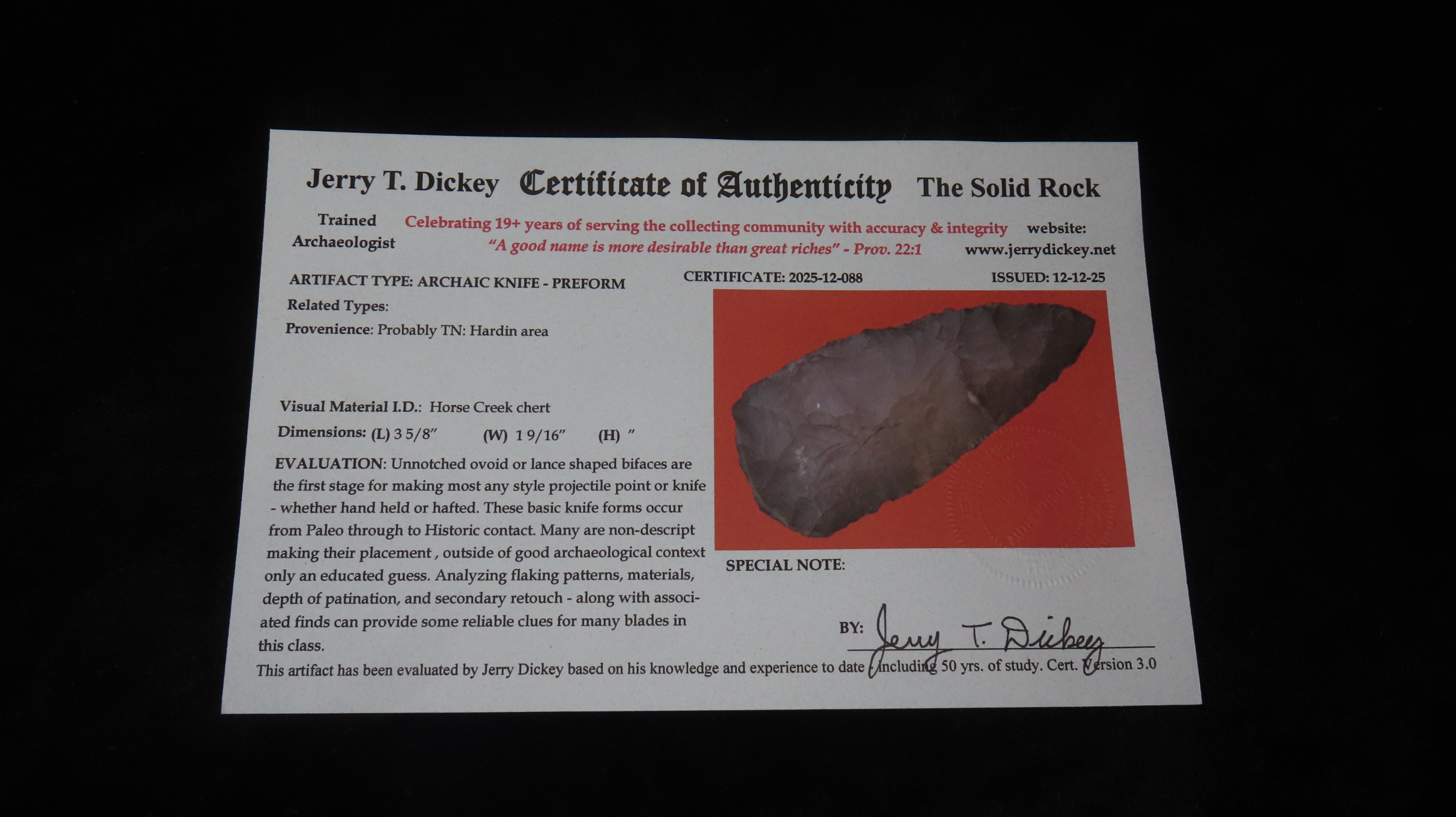 3 5/8″ x 1 9/16″ Archaic Knife – Preform, Horse Creek Chert, Tennessee, COA Dickey