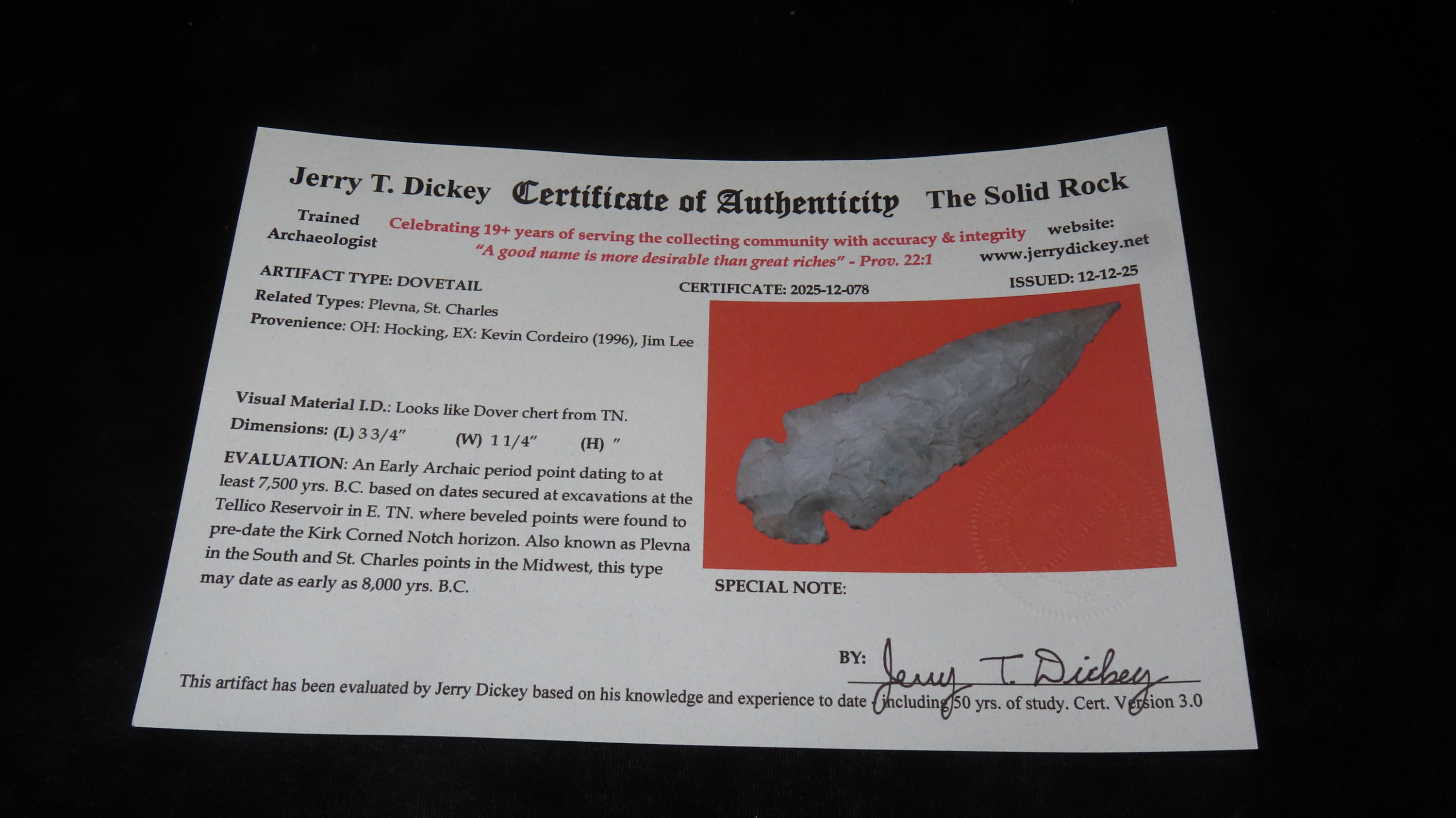 3 3/4″ x 1/14″ Dovetail, Dover Chert, Ohio, COA Dickey
