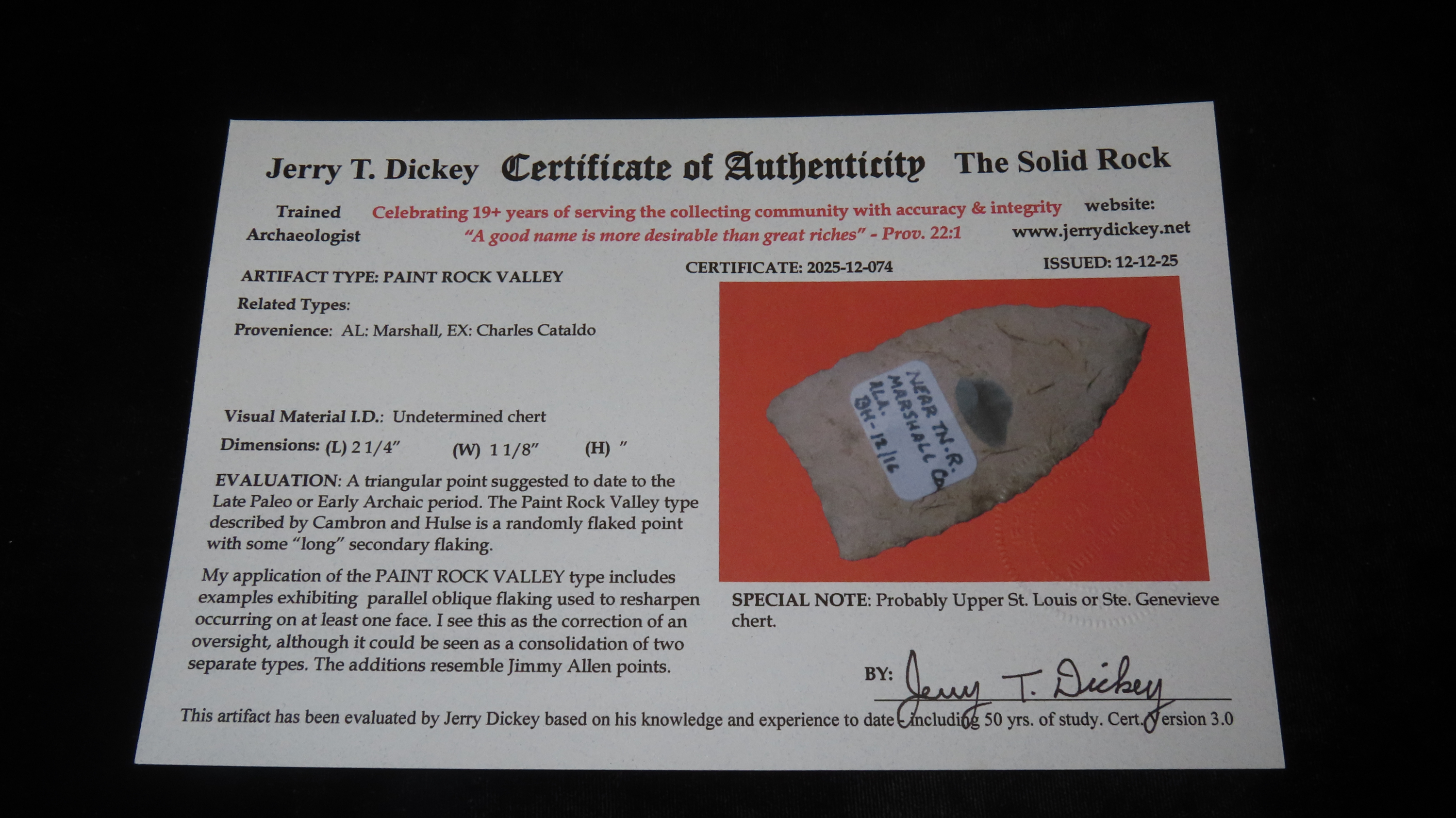 2 1/4″ x 1 1/8″ Paint Rock Valley, Undetermined Chert, Alabama, COA Dickey