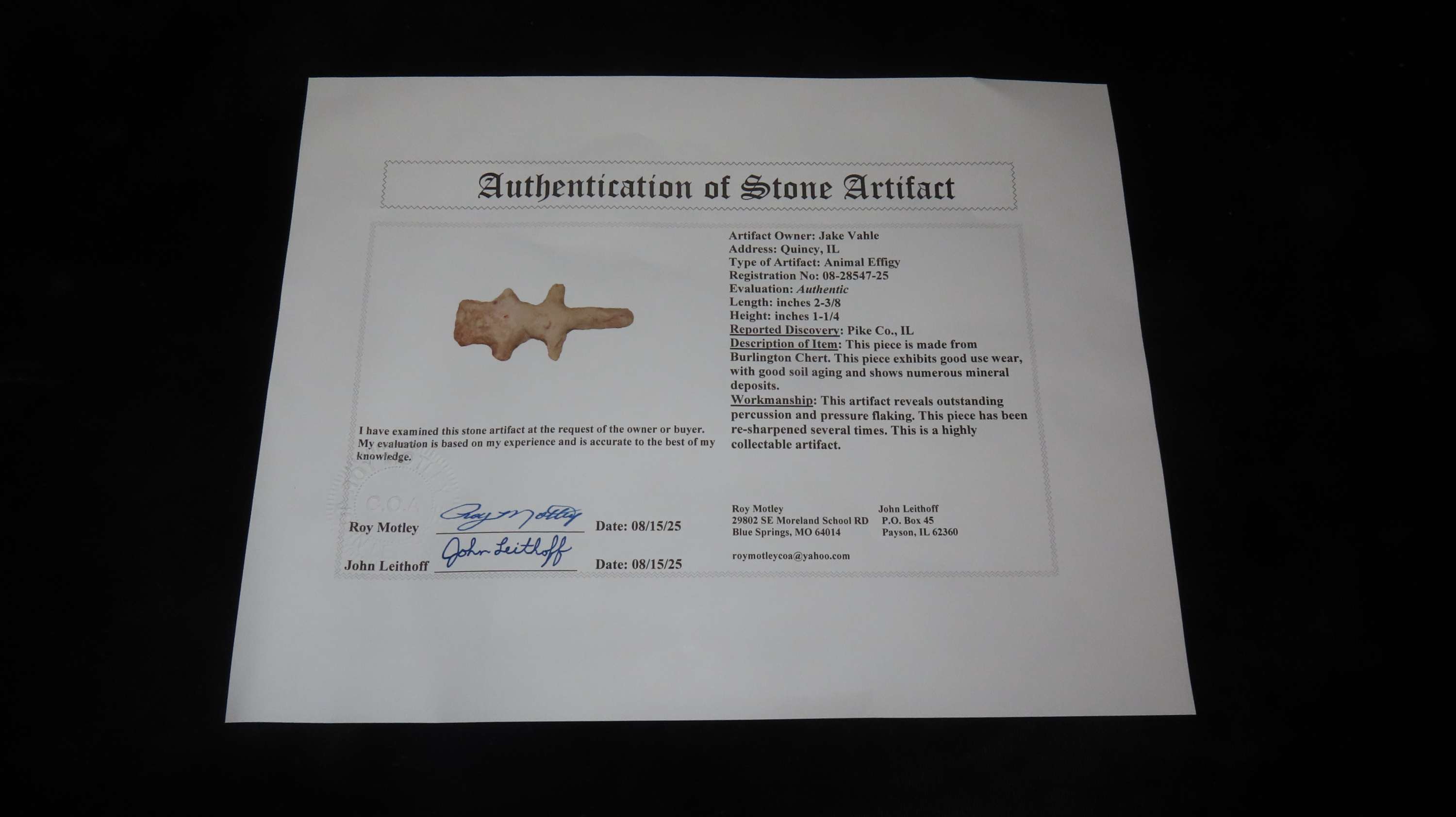 2 3/8″ x 1 1/4″ Animal Effigy, Burlington Chert, Pike Co., Illinois, COA Motley and Leithoff