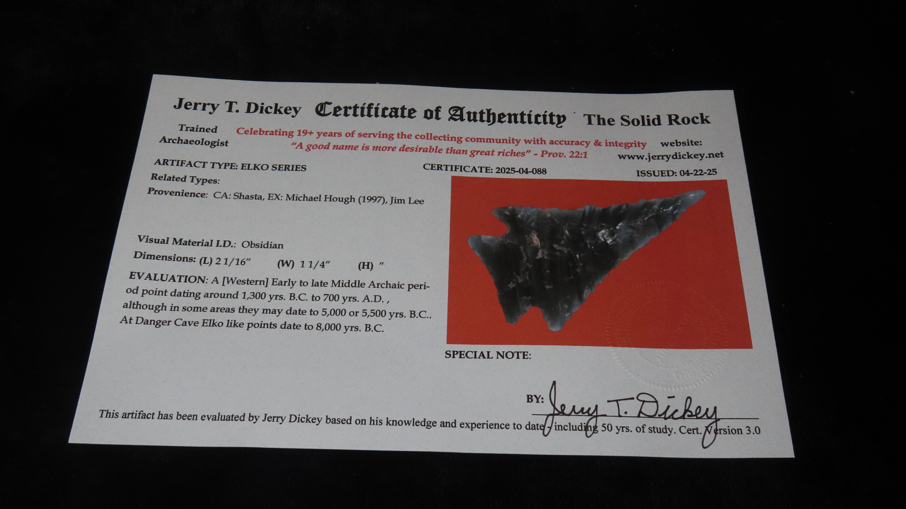 2 1/16″ x 1 1/4″ Elko Series, Obsidian, Shasta California, COA Dickey