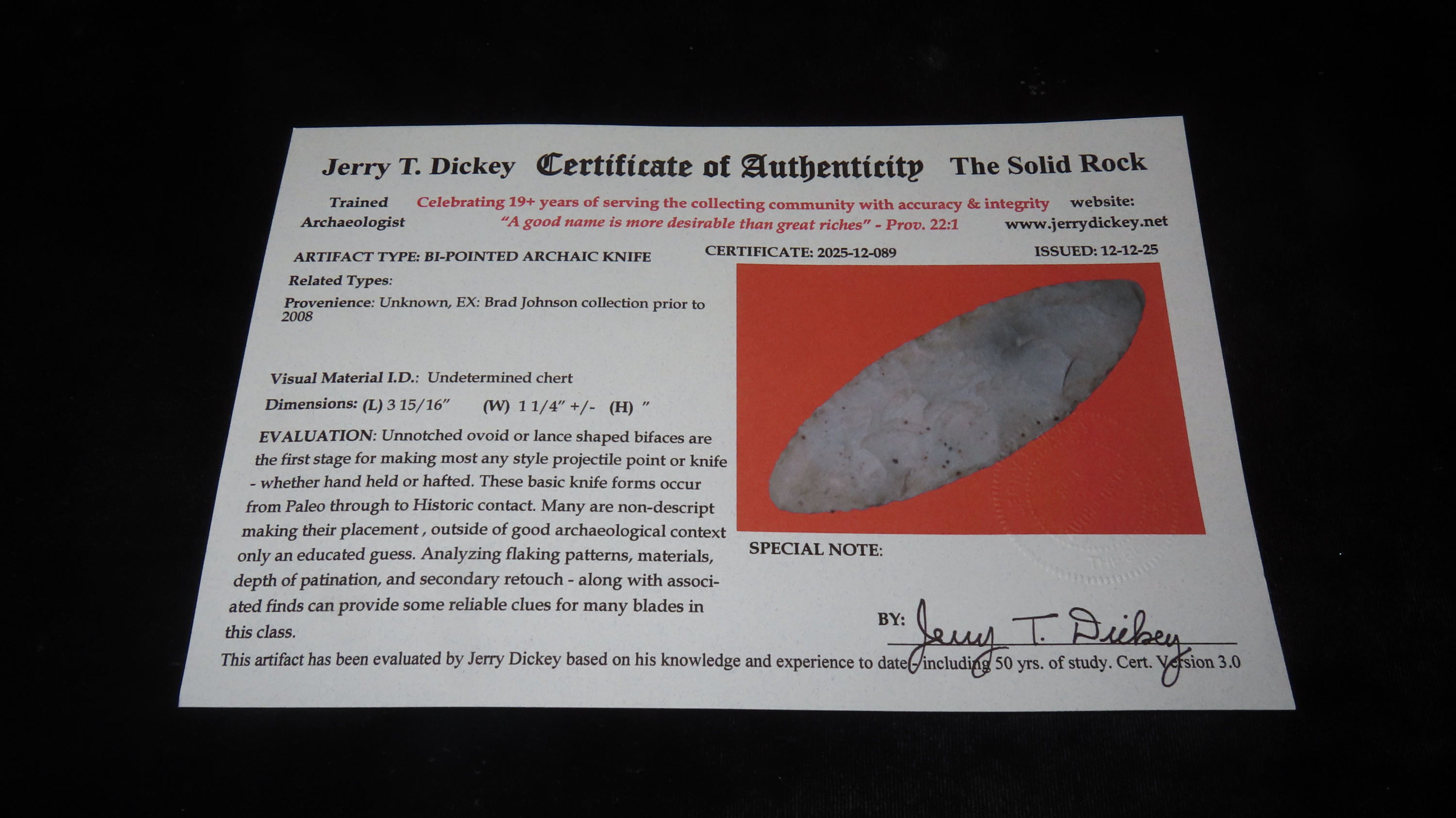 3 15/16″ x 1 1/4″ Bi-Pointed Archaic Knife, Undetermined Chert, COA Dickey