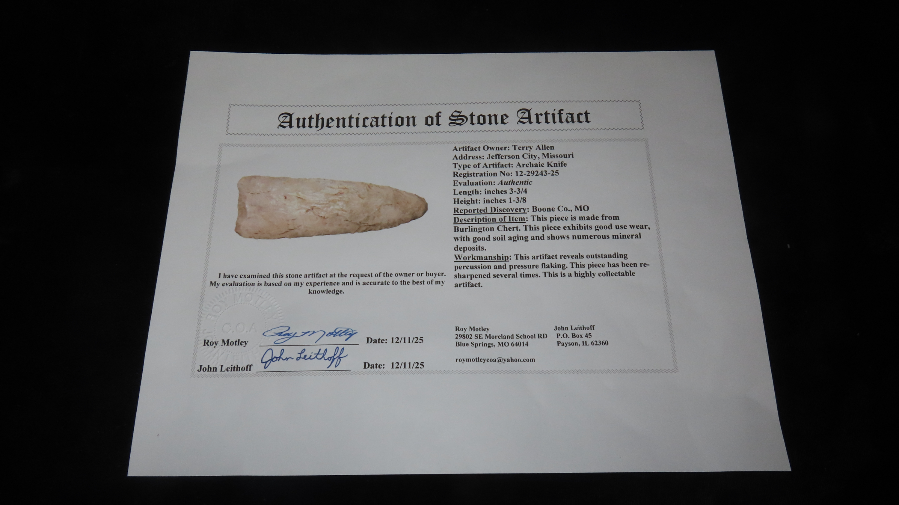 3 3/4″ x 1 3/8″ Archaic Knife, Burlington Chert, Boone Co., Missouri, COA Motley and Leithoff