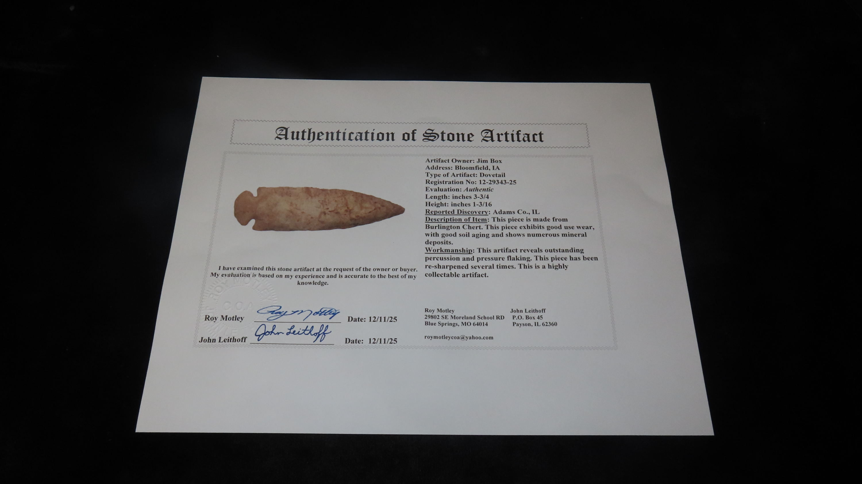 3 3/4″ x 1 3/16″ Dovetail, Motley COA, Found in Adams County, Illinois