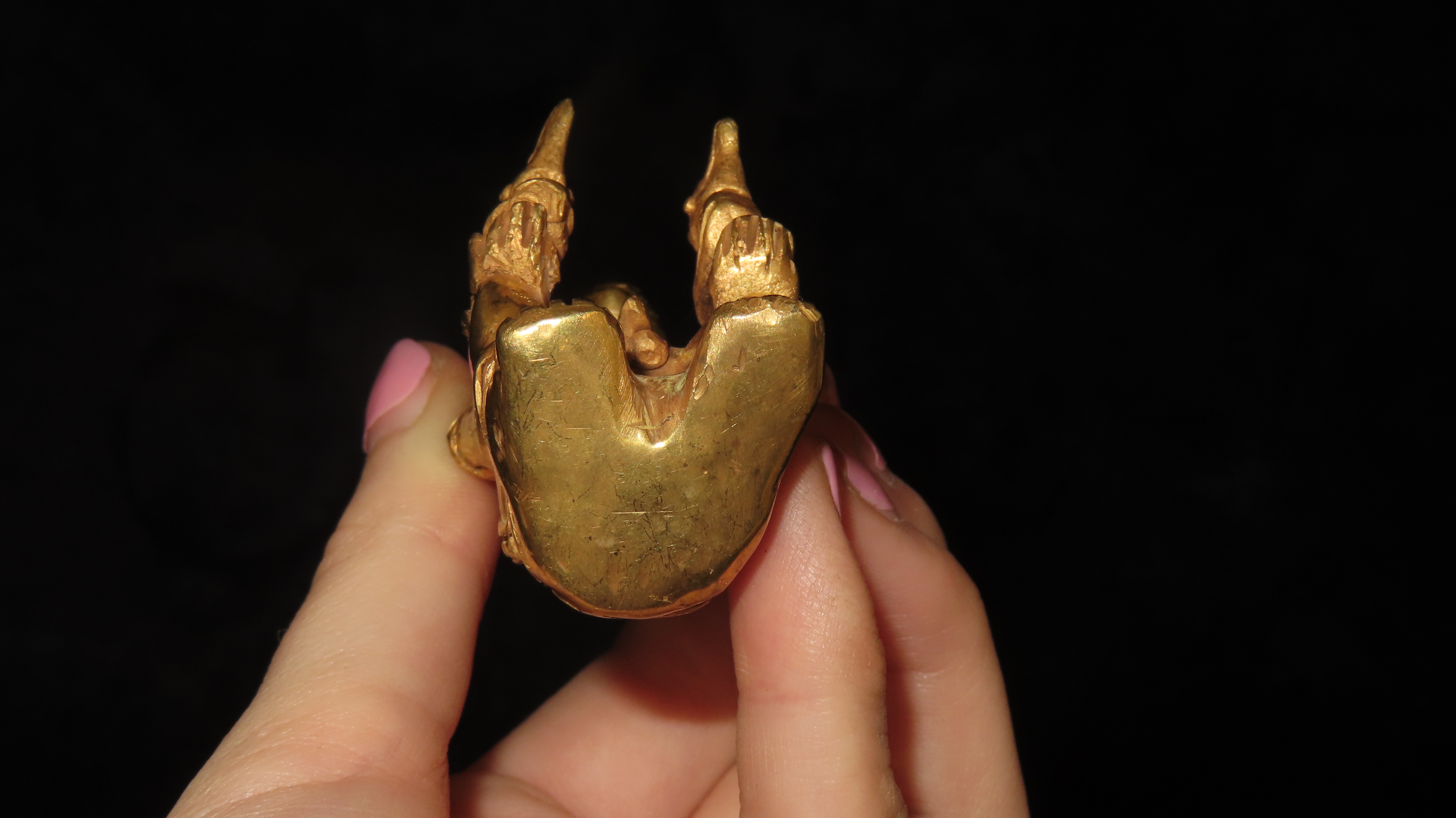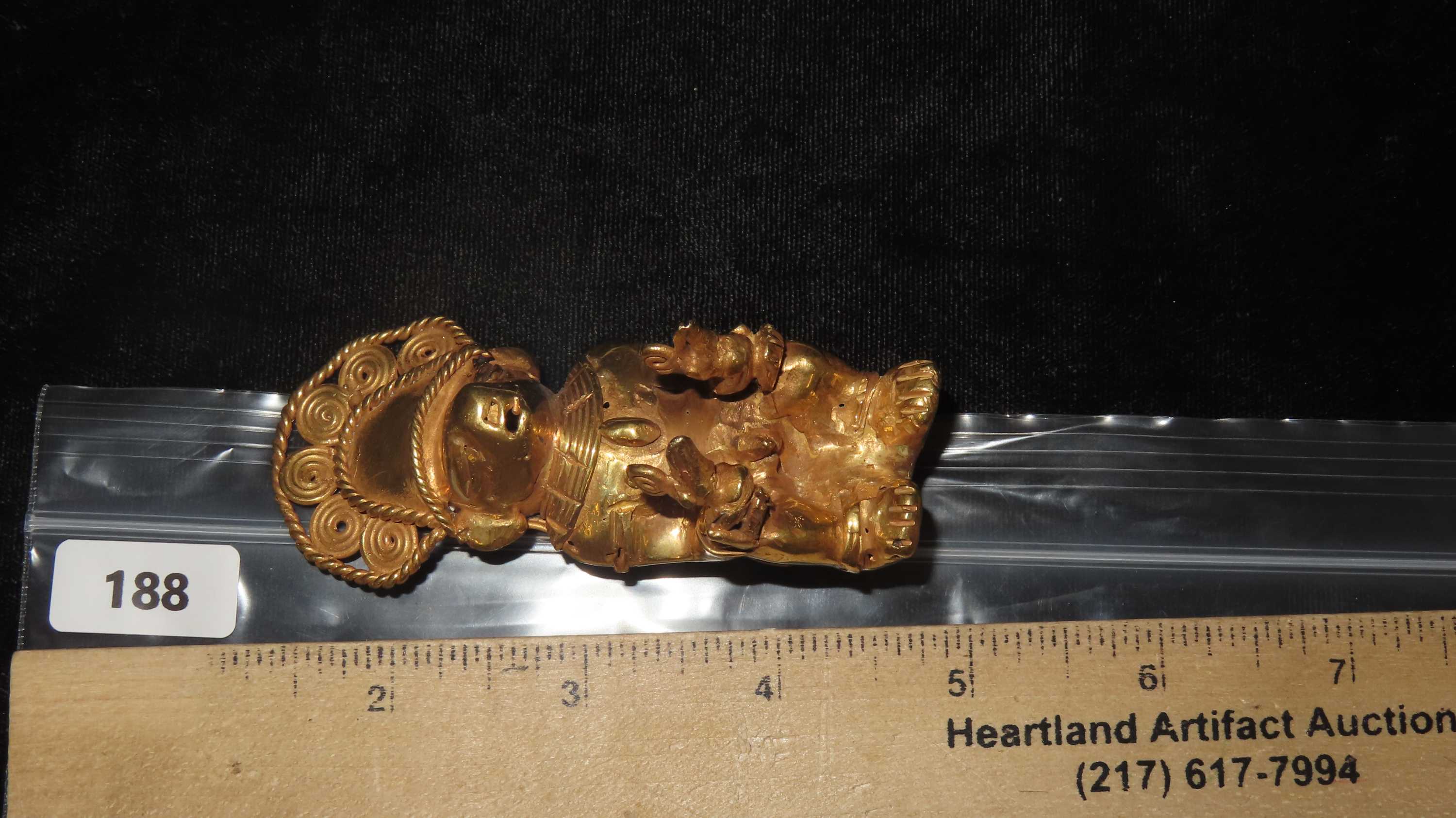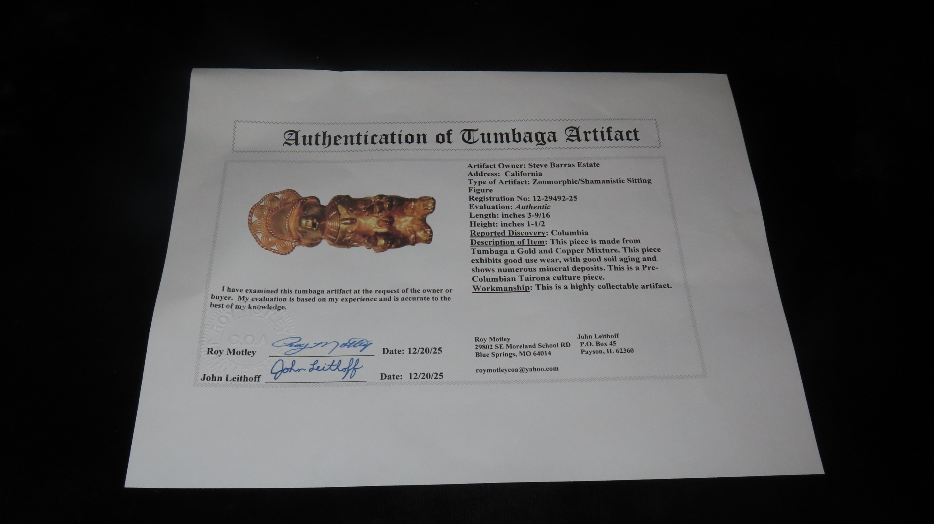 3 9/16″ x 1 1/2″ Zoomorphic/Shamanistic Tumbaga Sitting Figure. Gold and Copper Mixture. Columbia. COA Motley and Leithoff. Exact Gold Contents Unknown