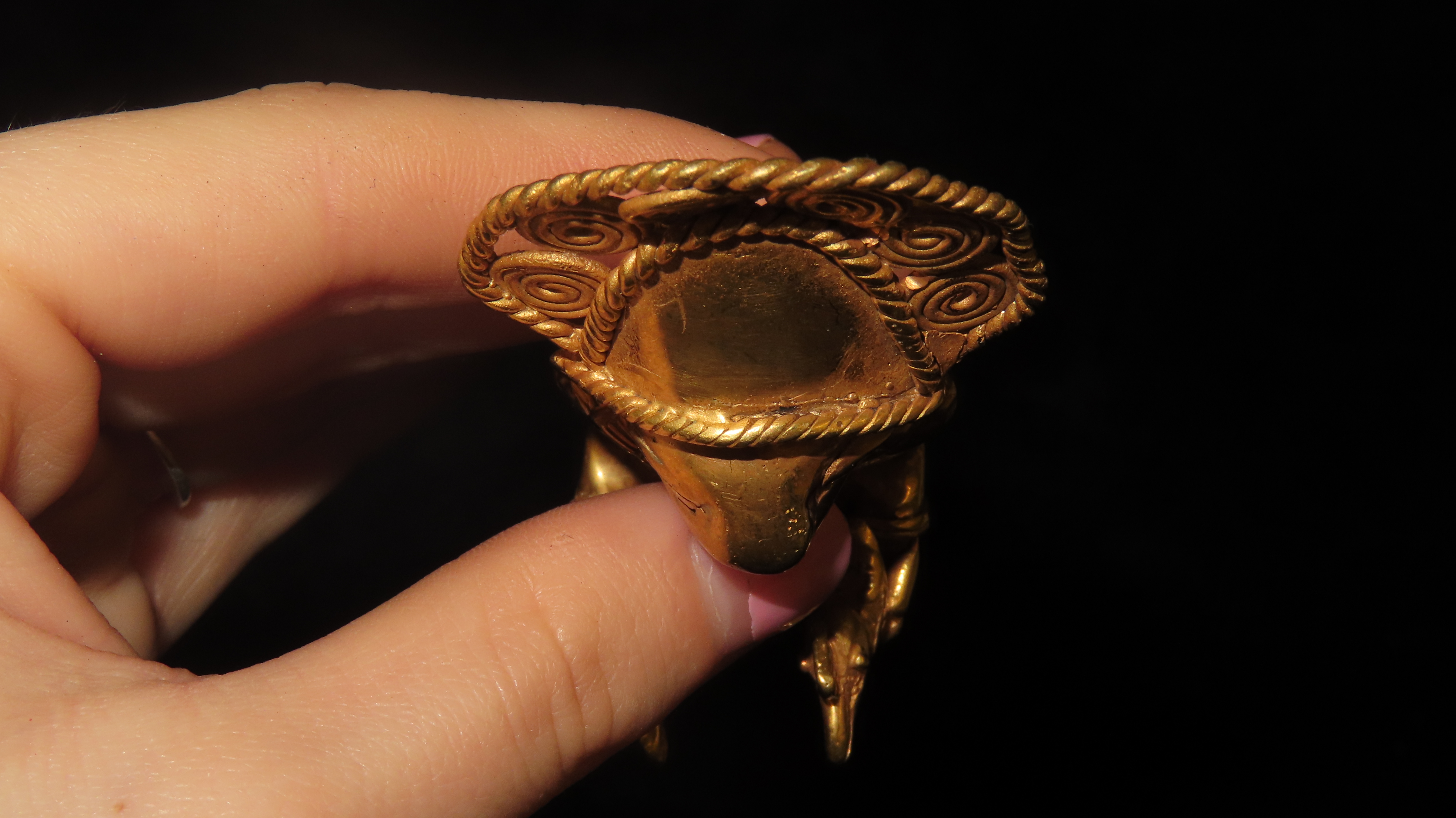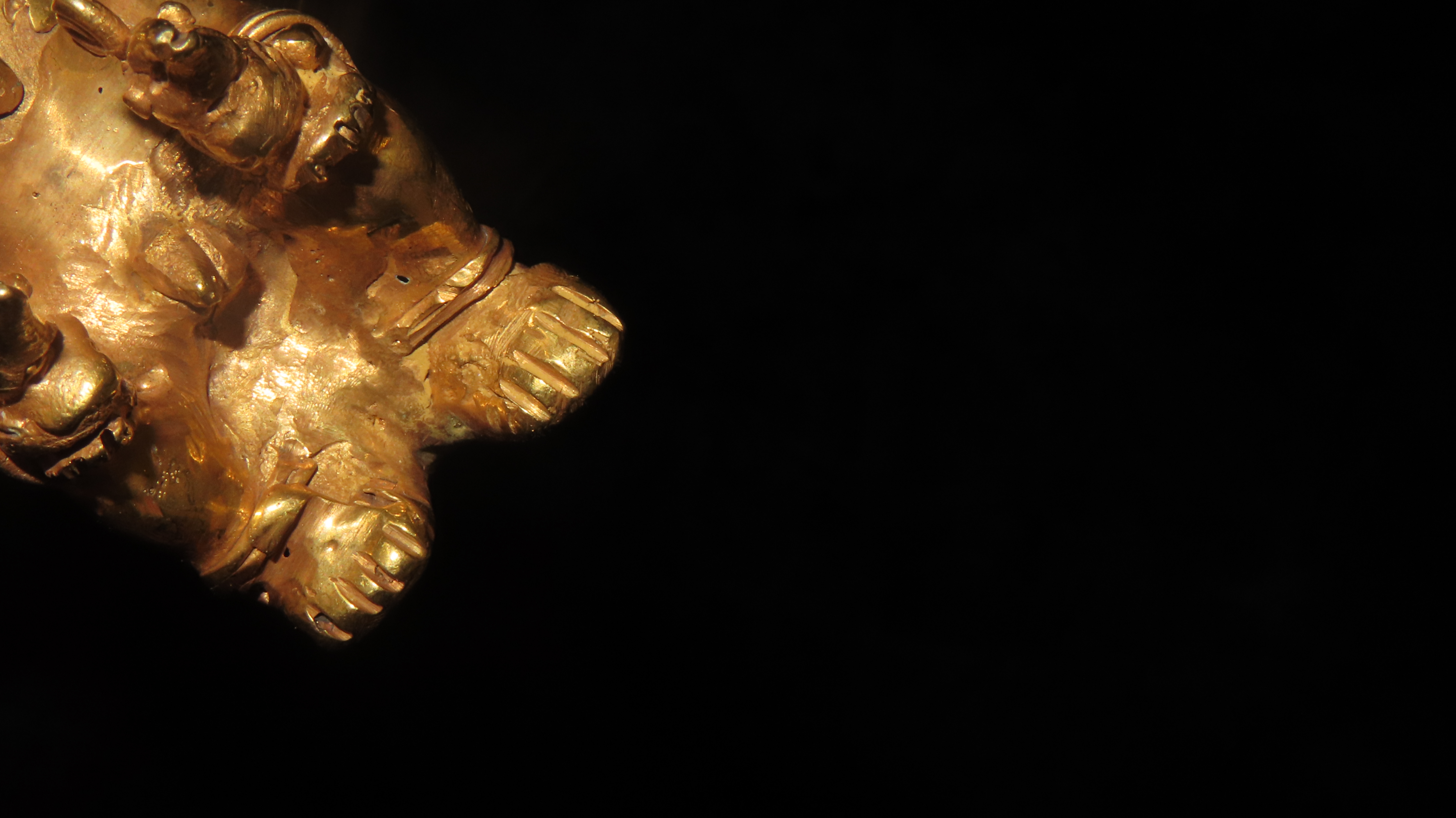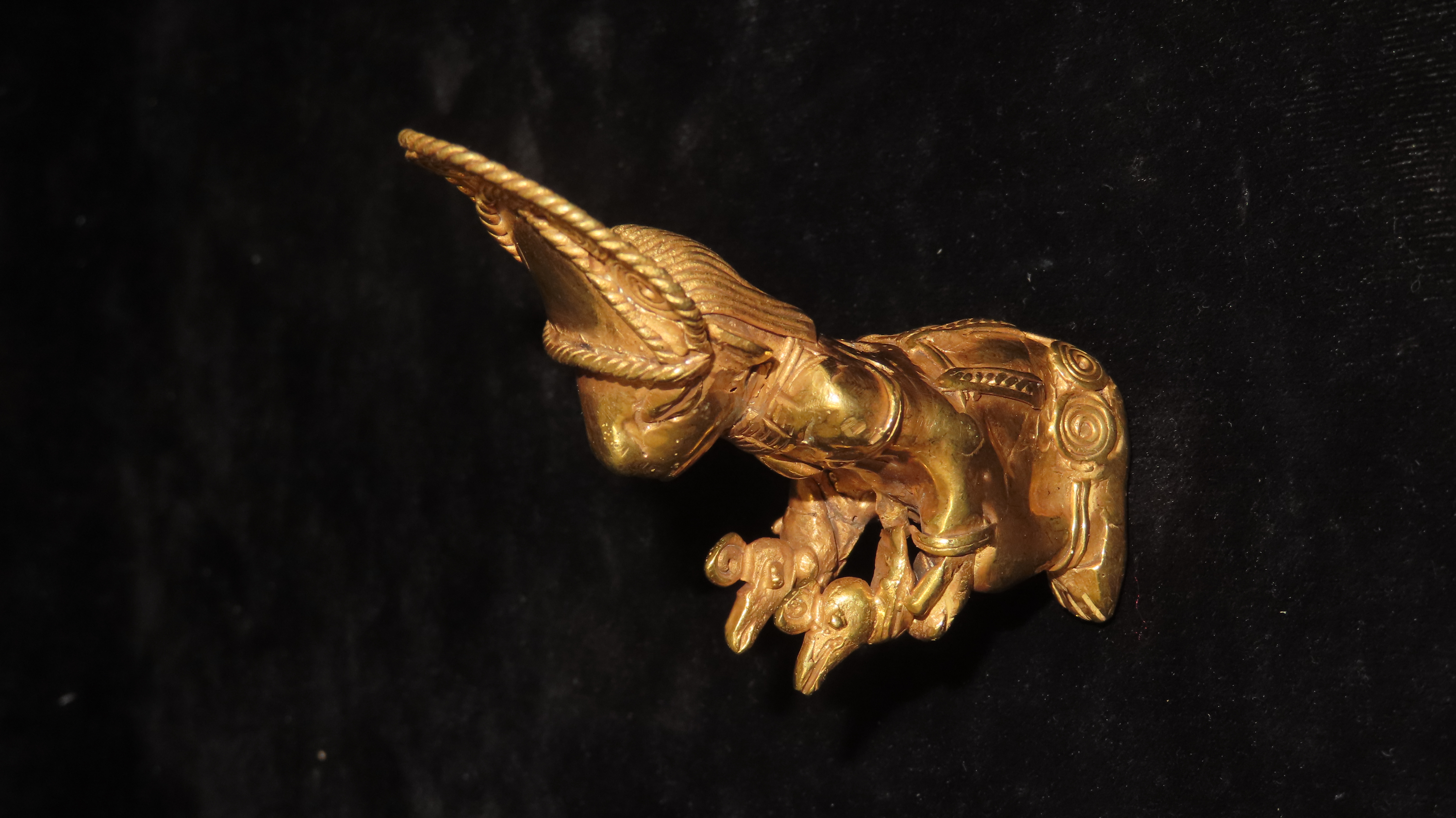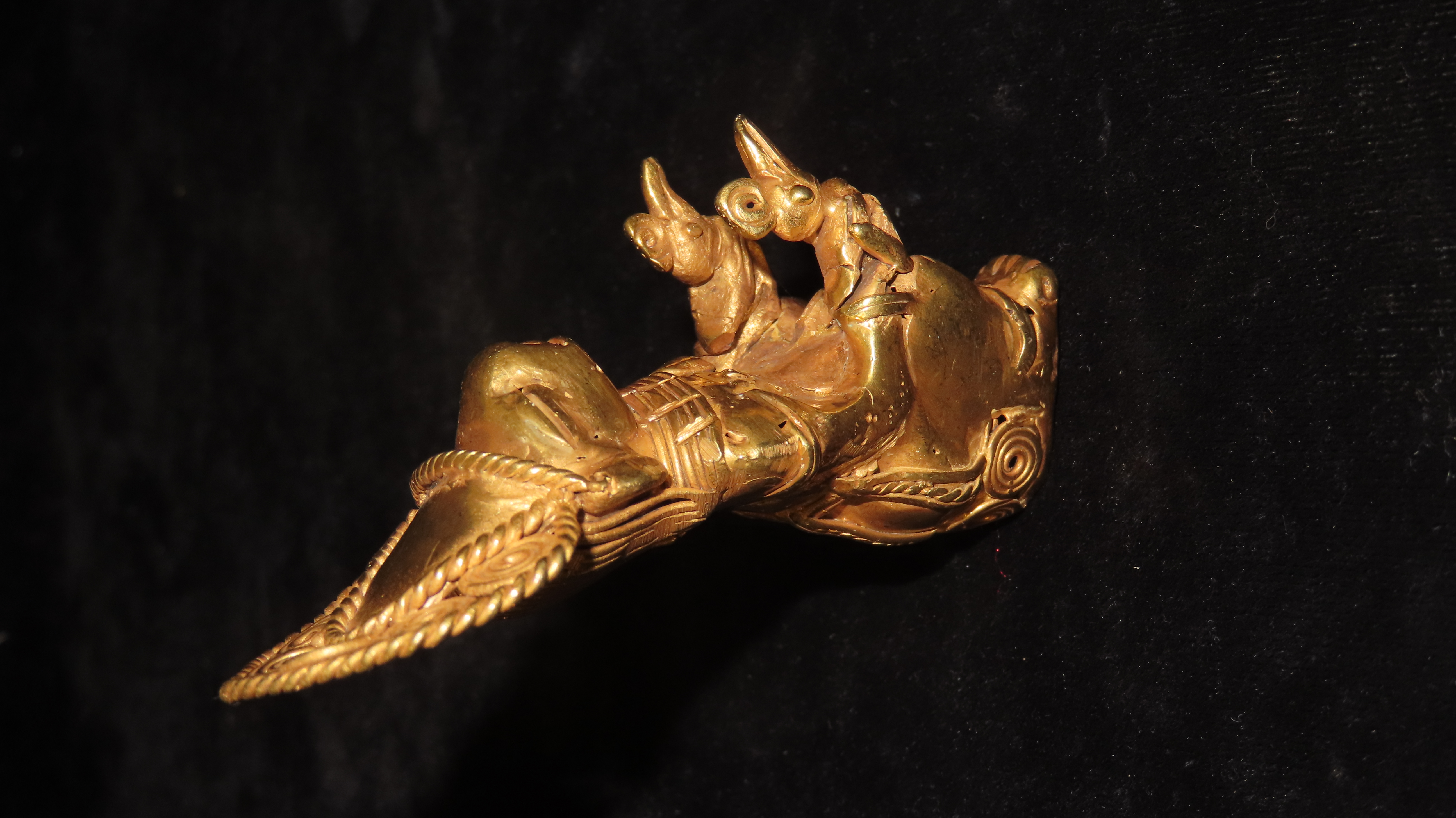 3 9/16″ x 1 1/2″ Zoomorphic/Shamanistic Tumbaga Sitting Figure. Gold and Copper Mixture. Columbia. COA Motley and Leithoff. Exact Gold Contents Unknown