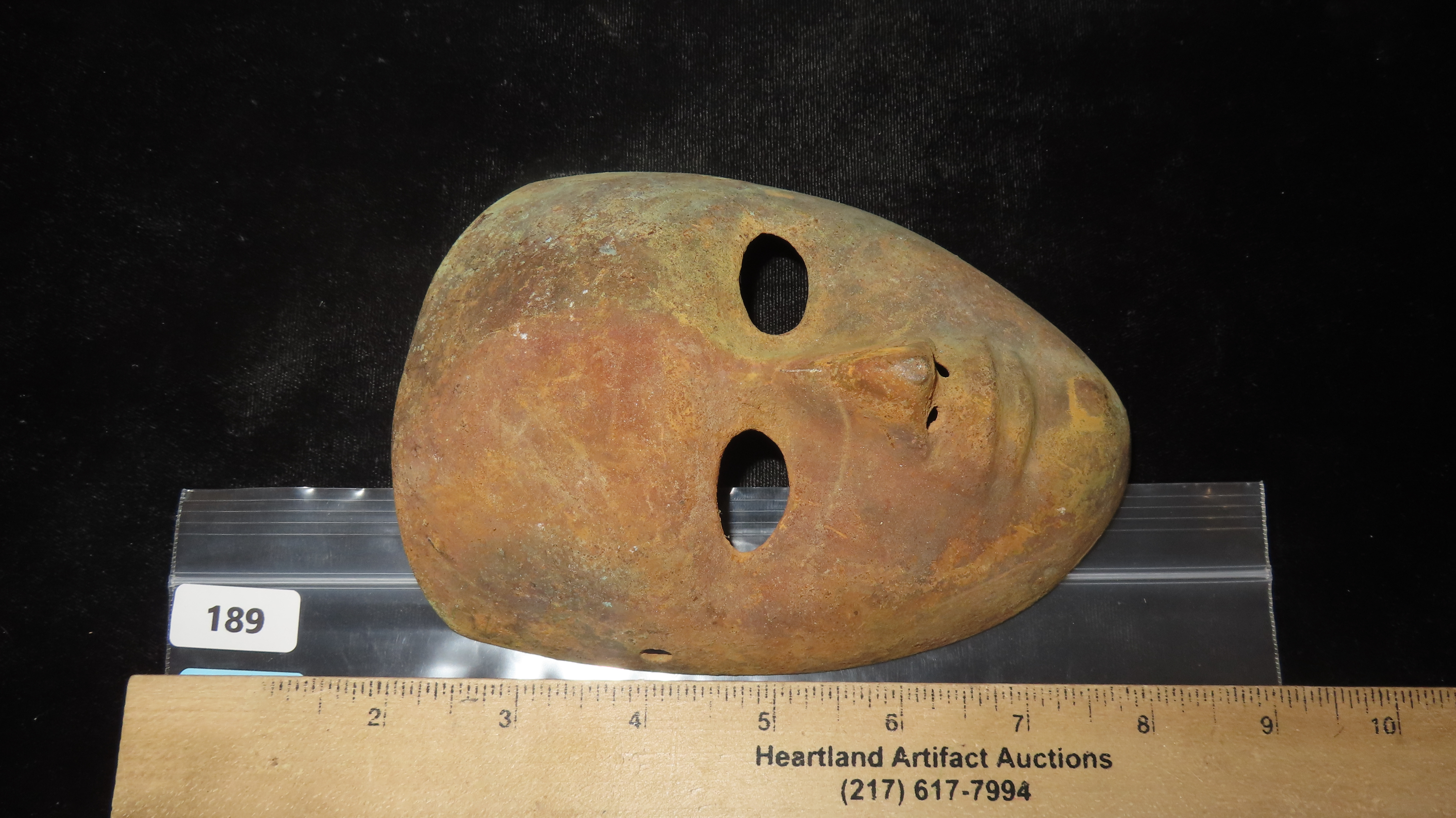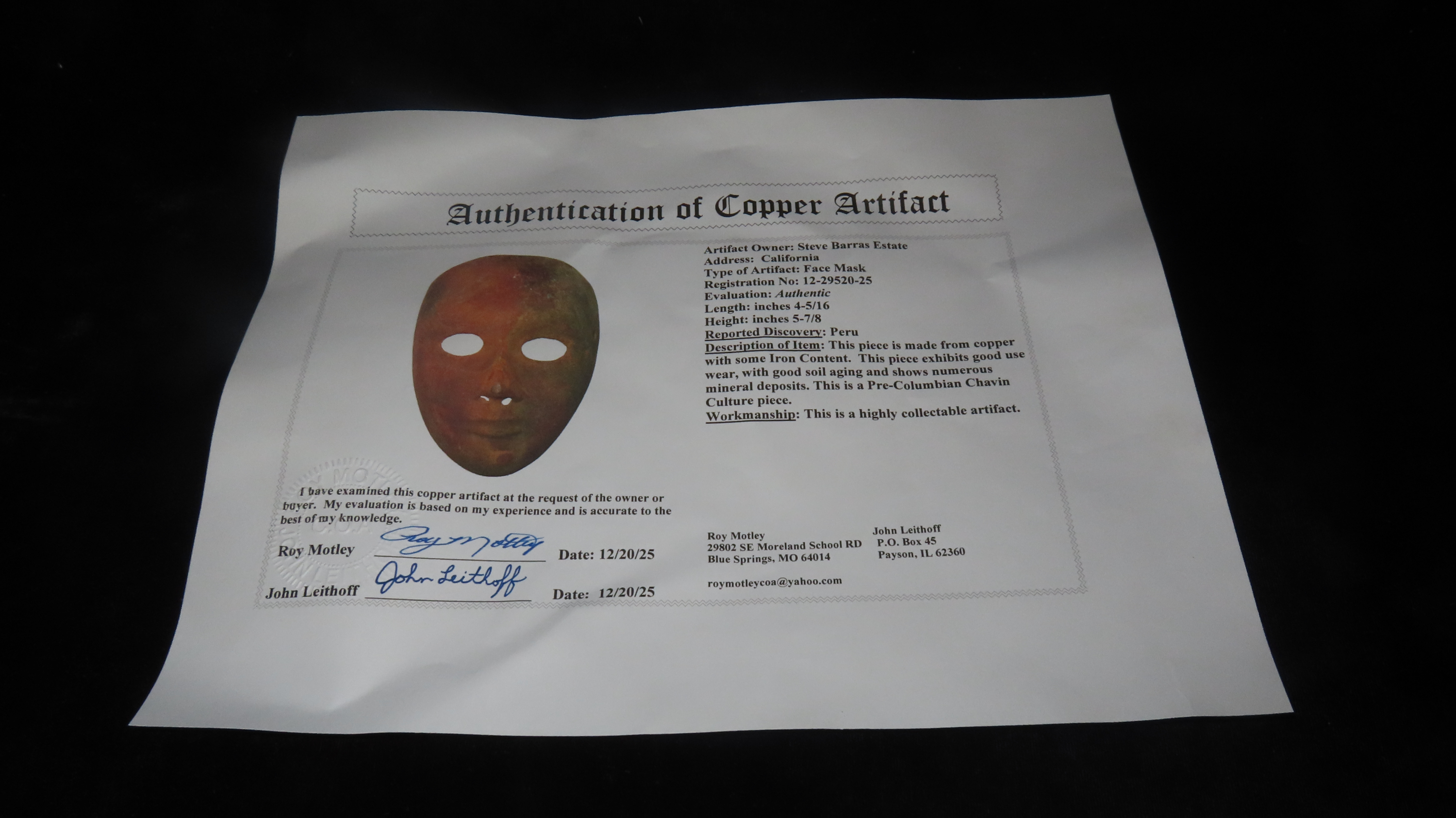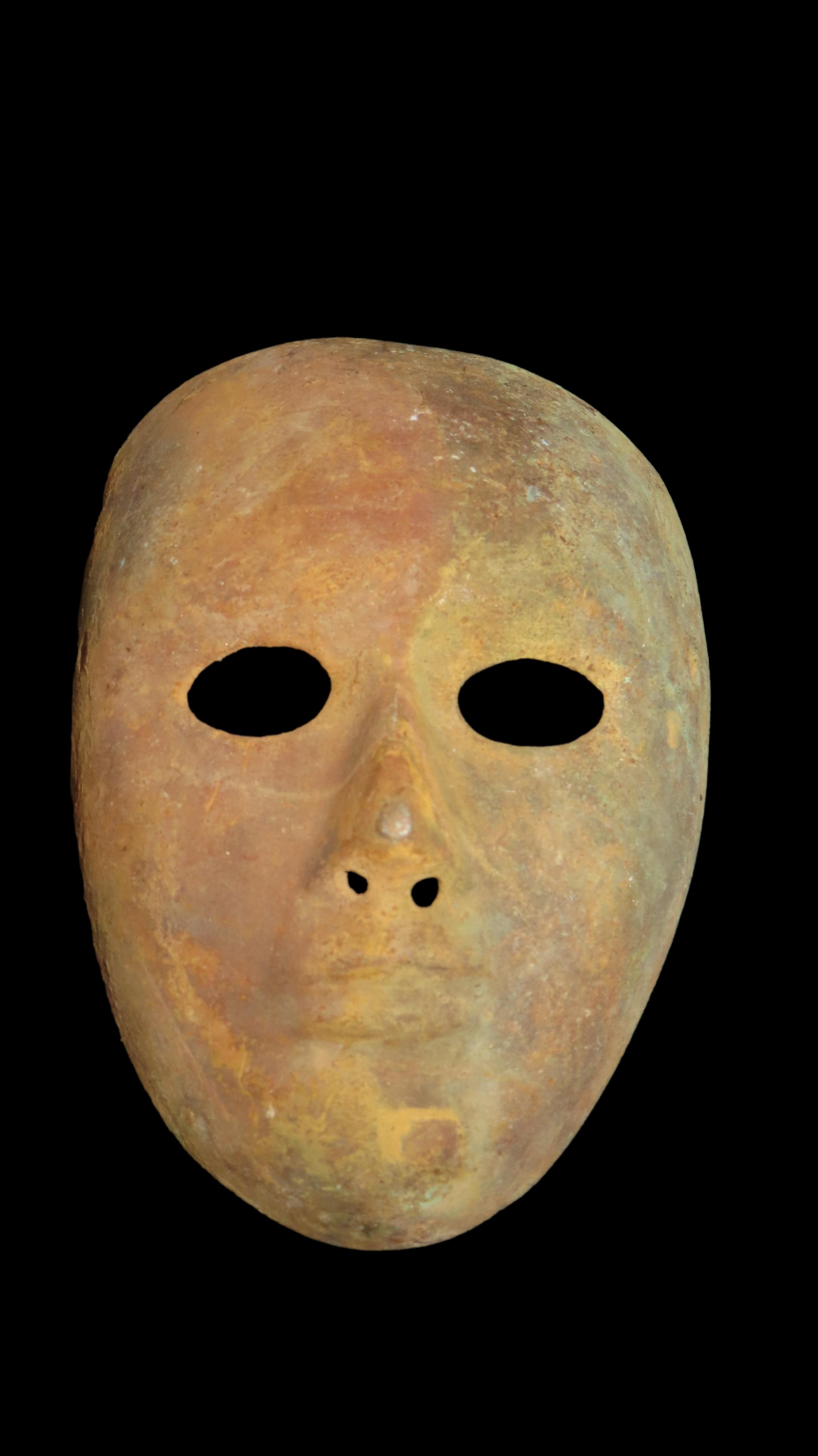 4 5/16″ x 5 7/8″ Face Mask. Copper with some Iron Content. Peru. COA Motley and Leithoff.