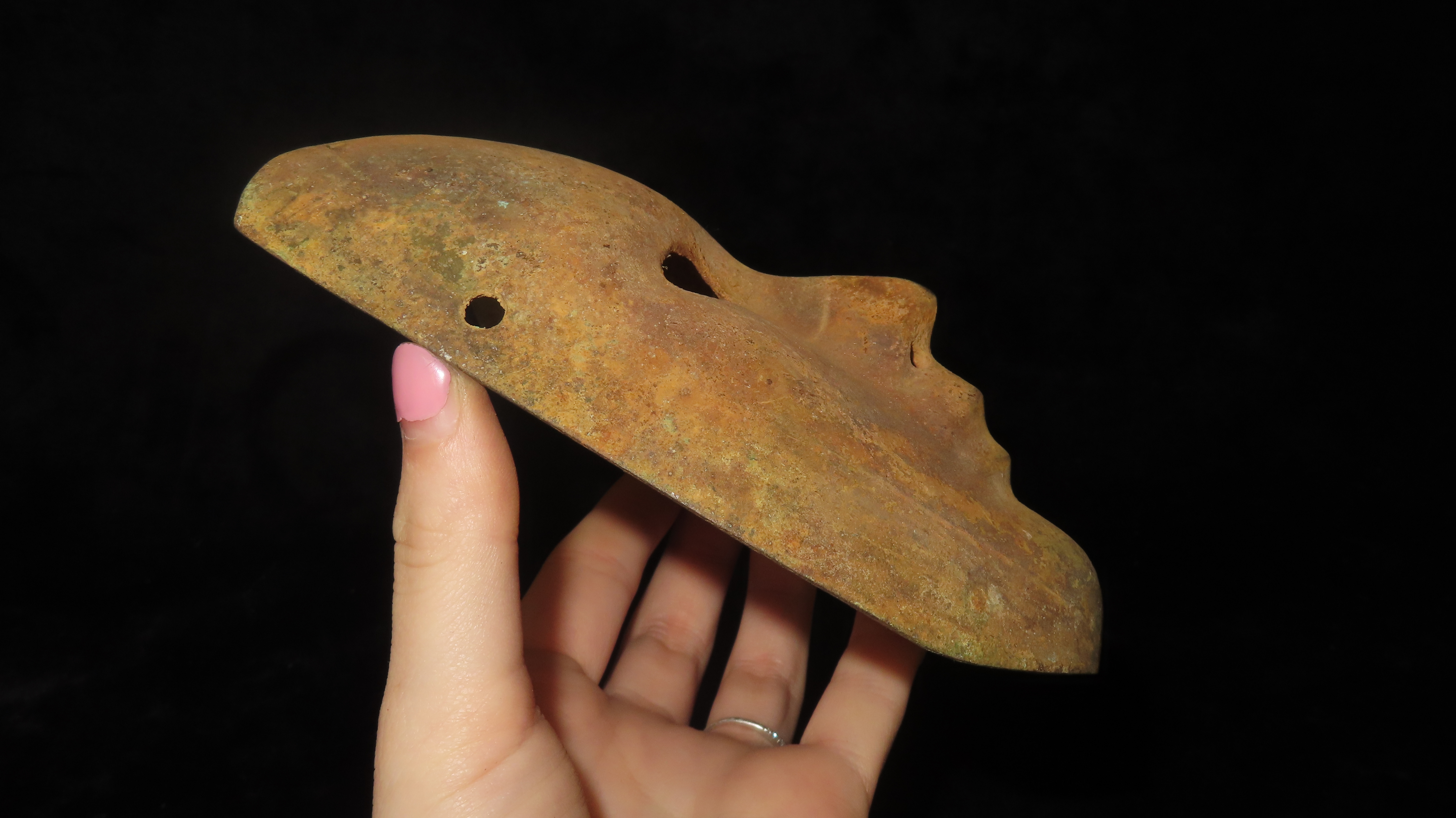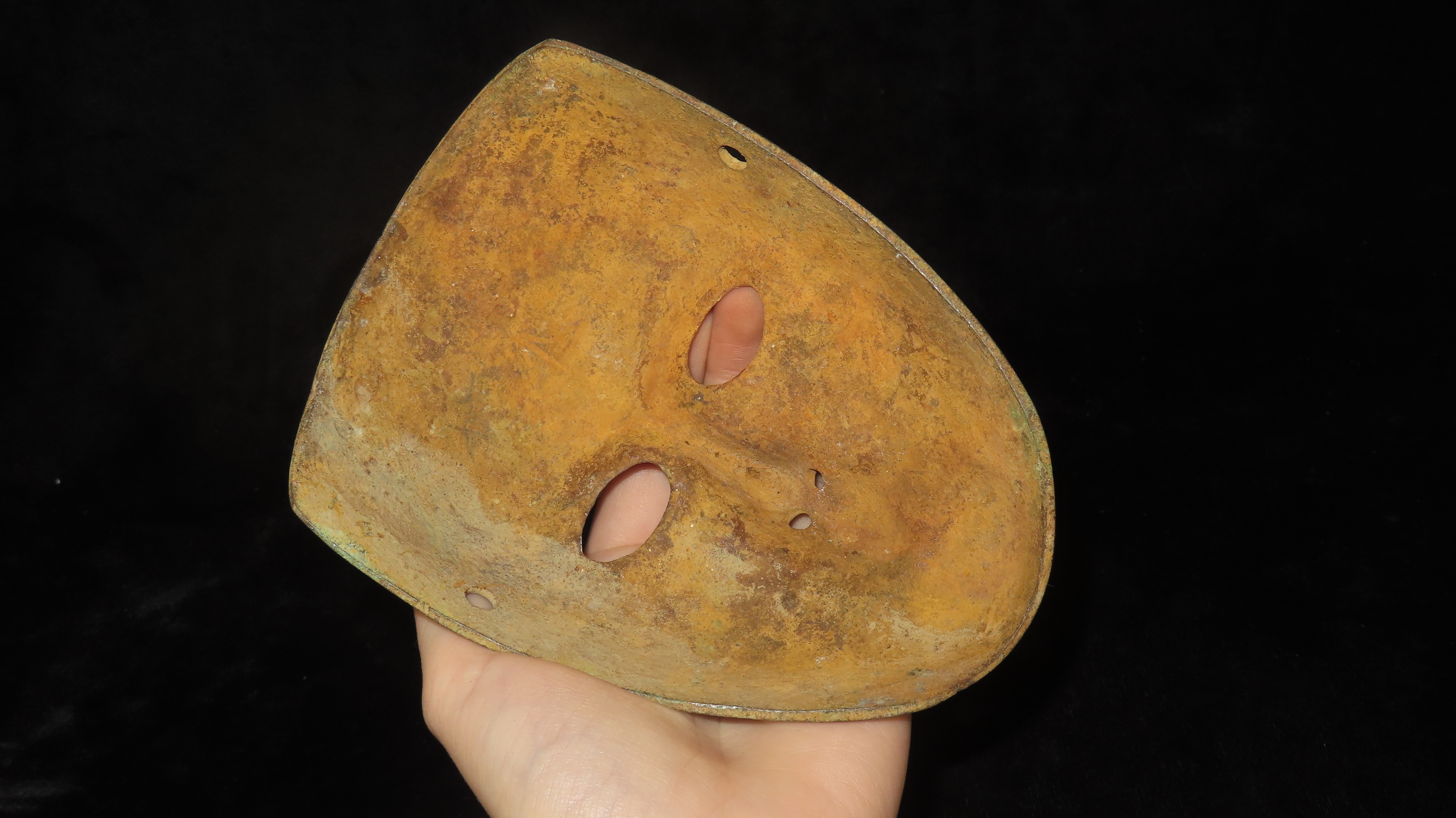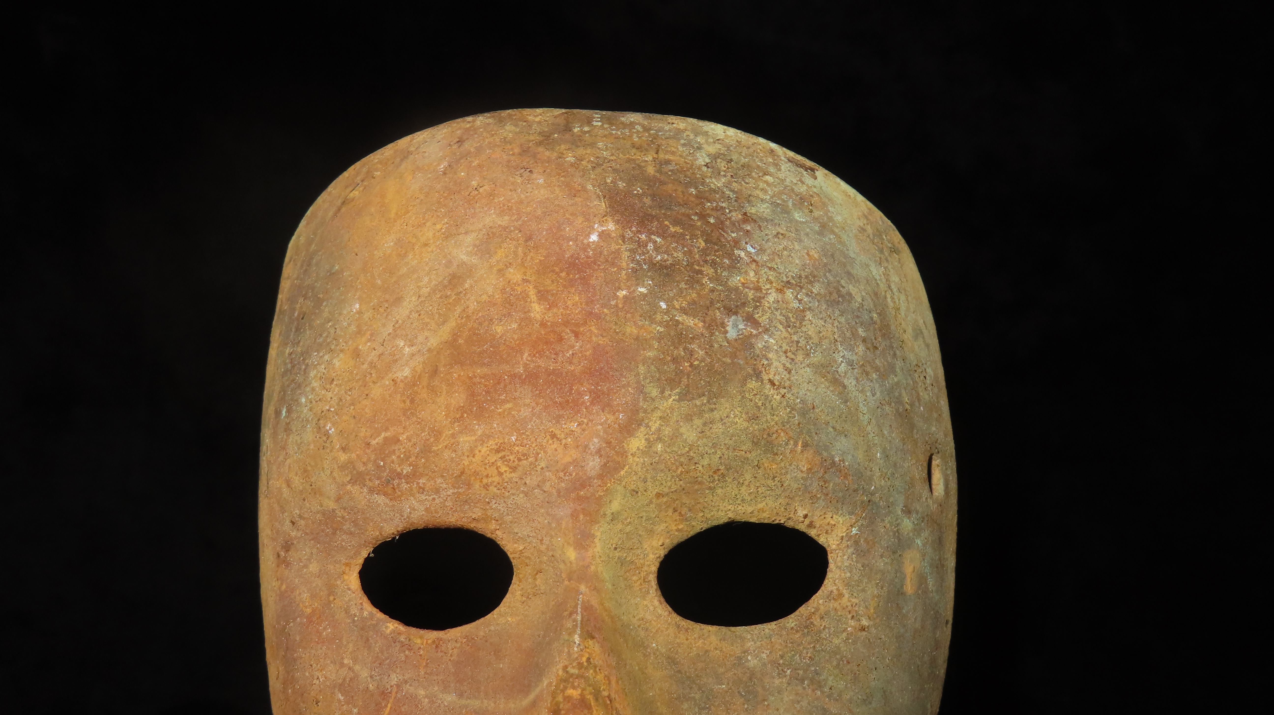 4 5/16″ x 5 7/8″ Face Mask. Copper with some Iron Content. Peru. COA Motley and Leithoff.