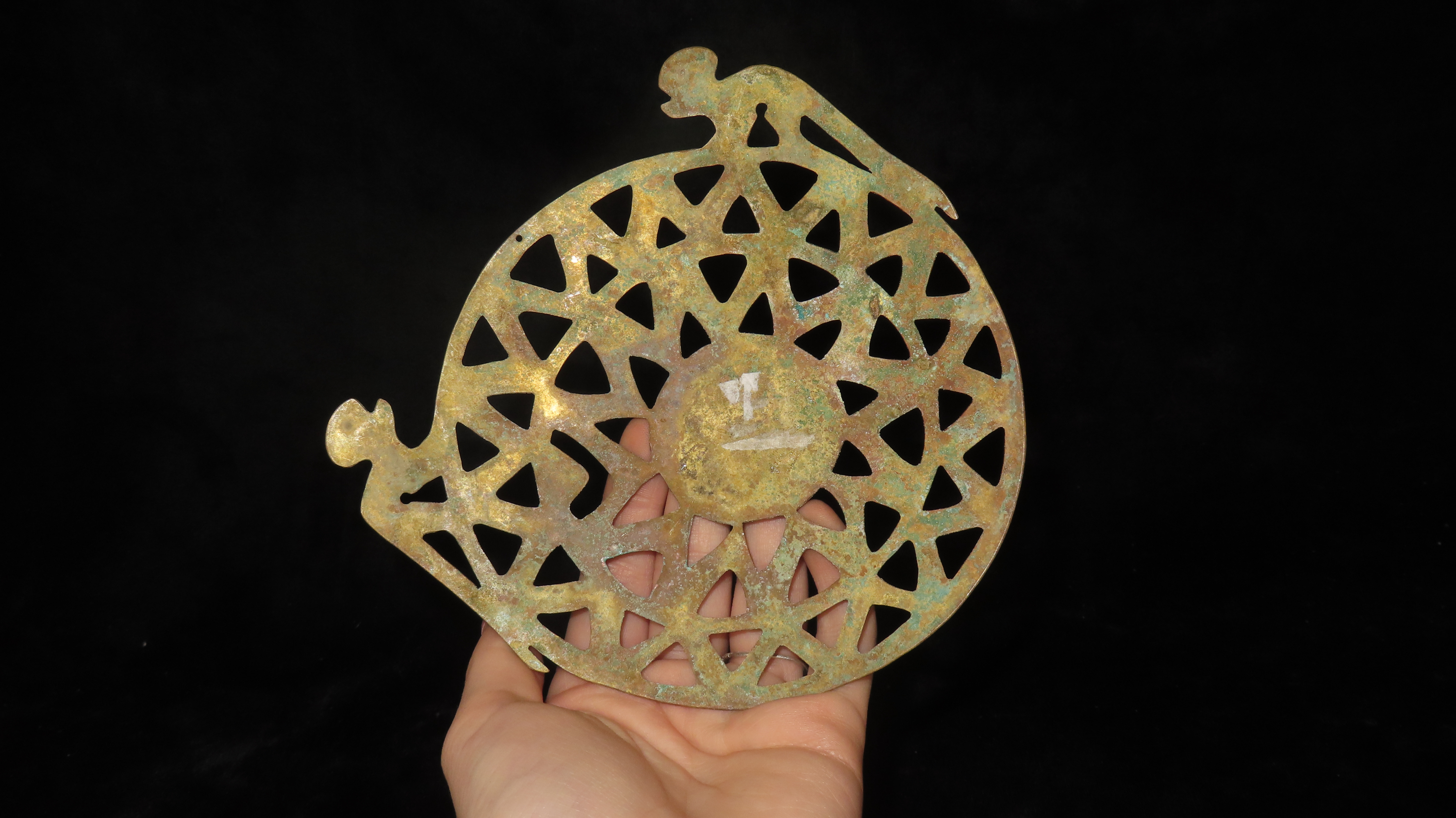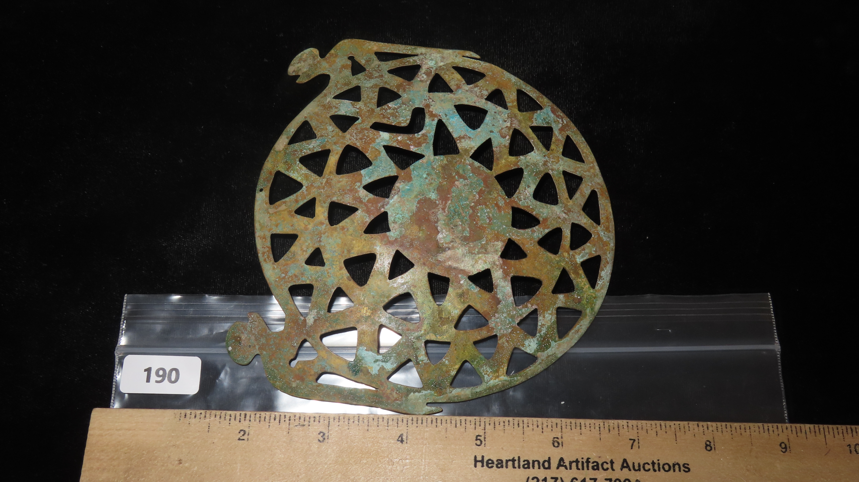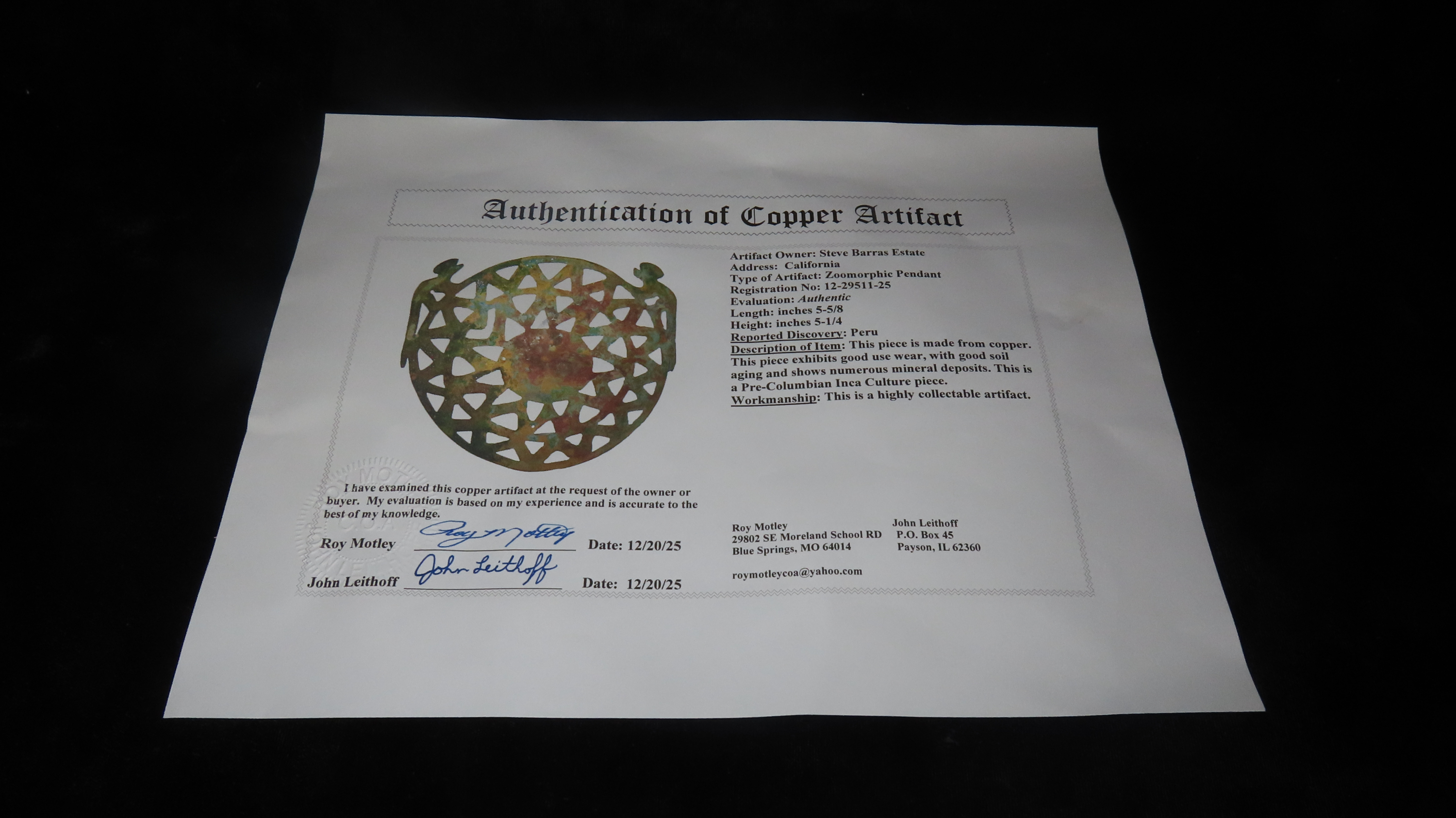 5 5/8″ x 5 1/4″ Zoomorphic Pendant. Copper. Peru. COA Motley and Leithoff.