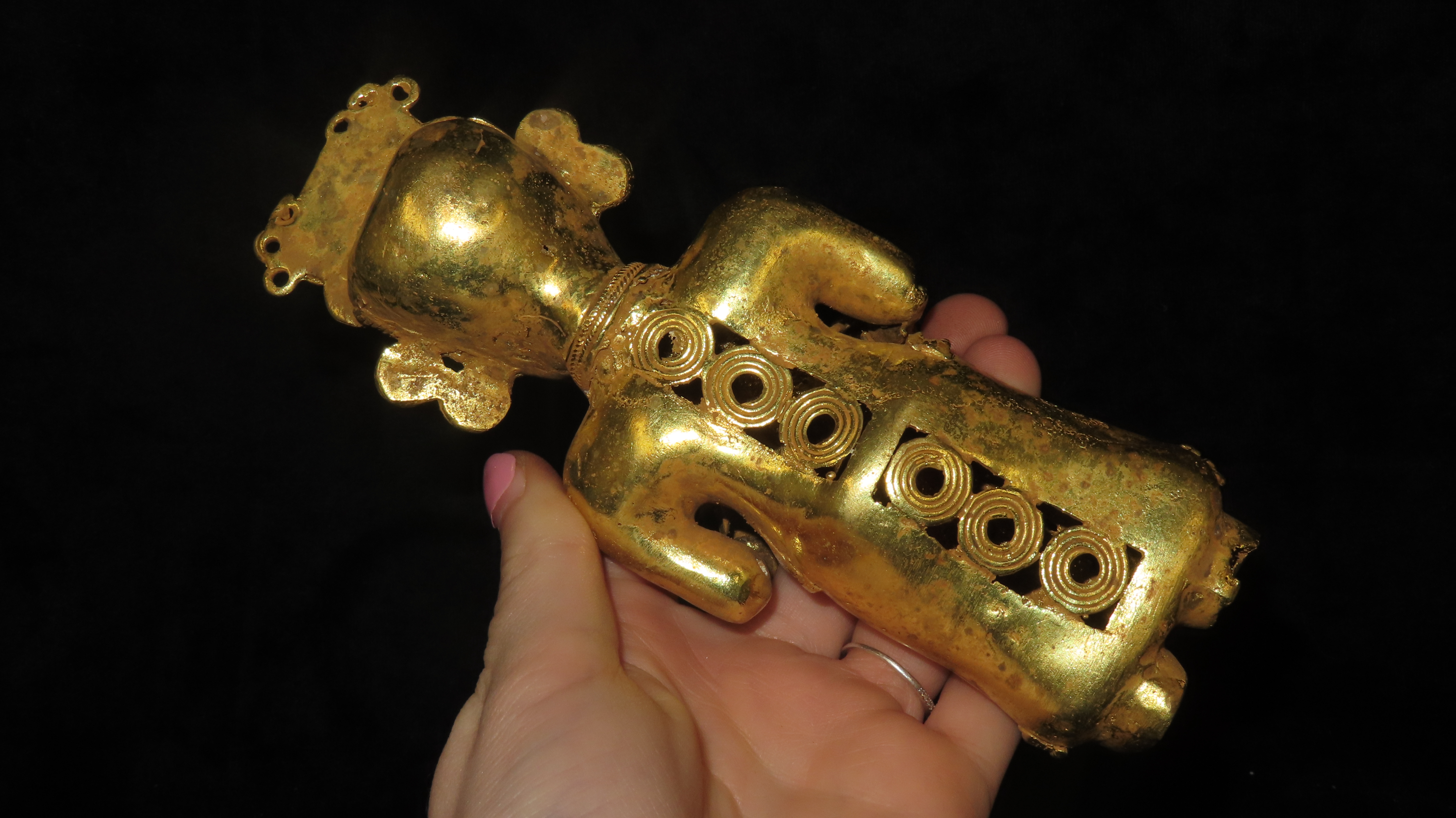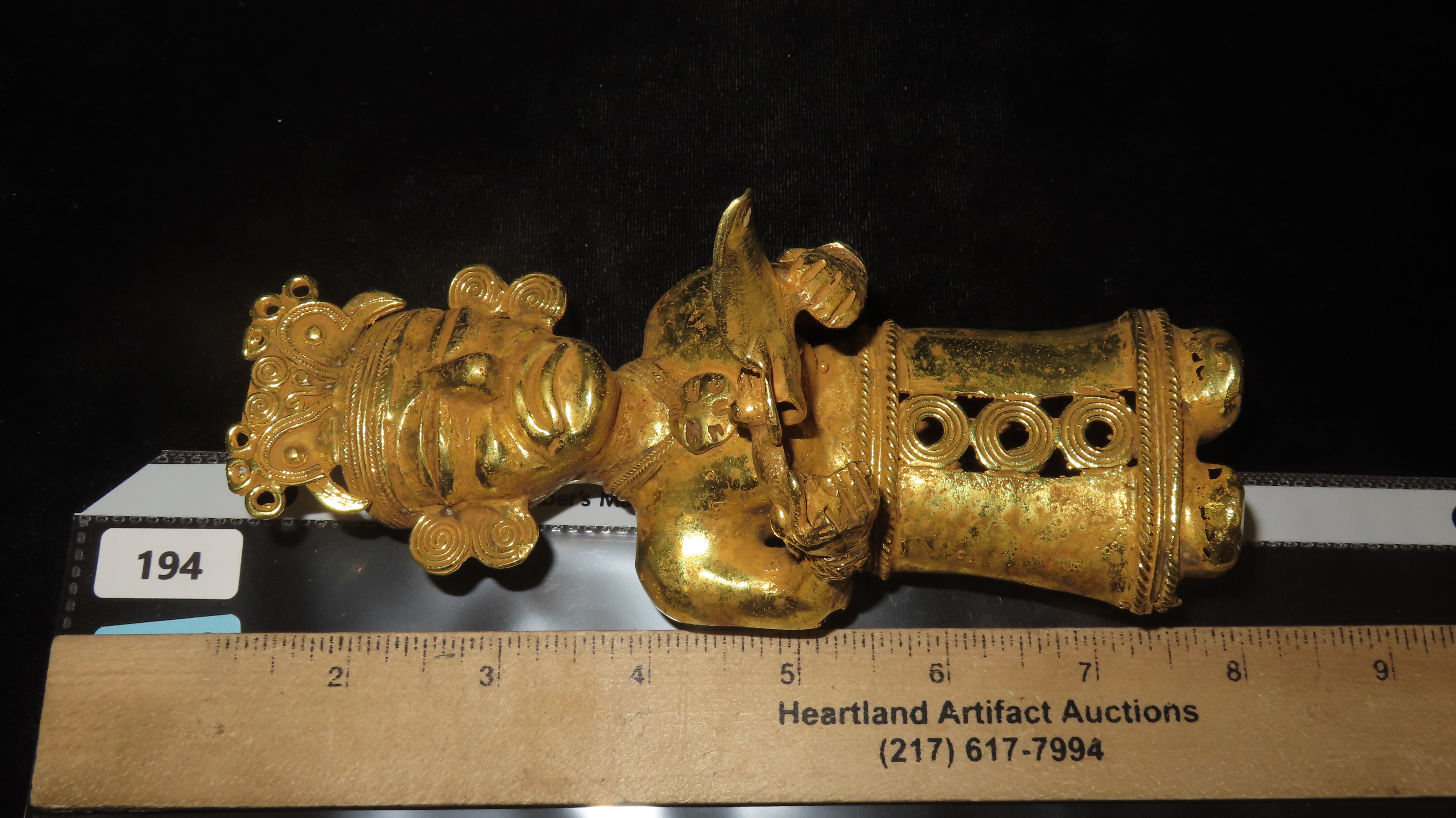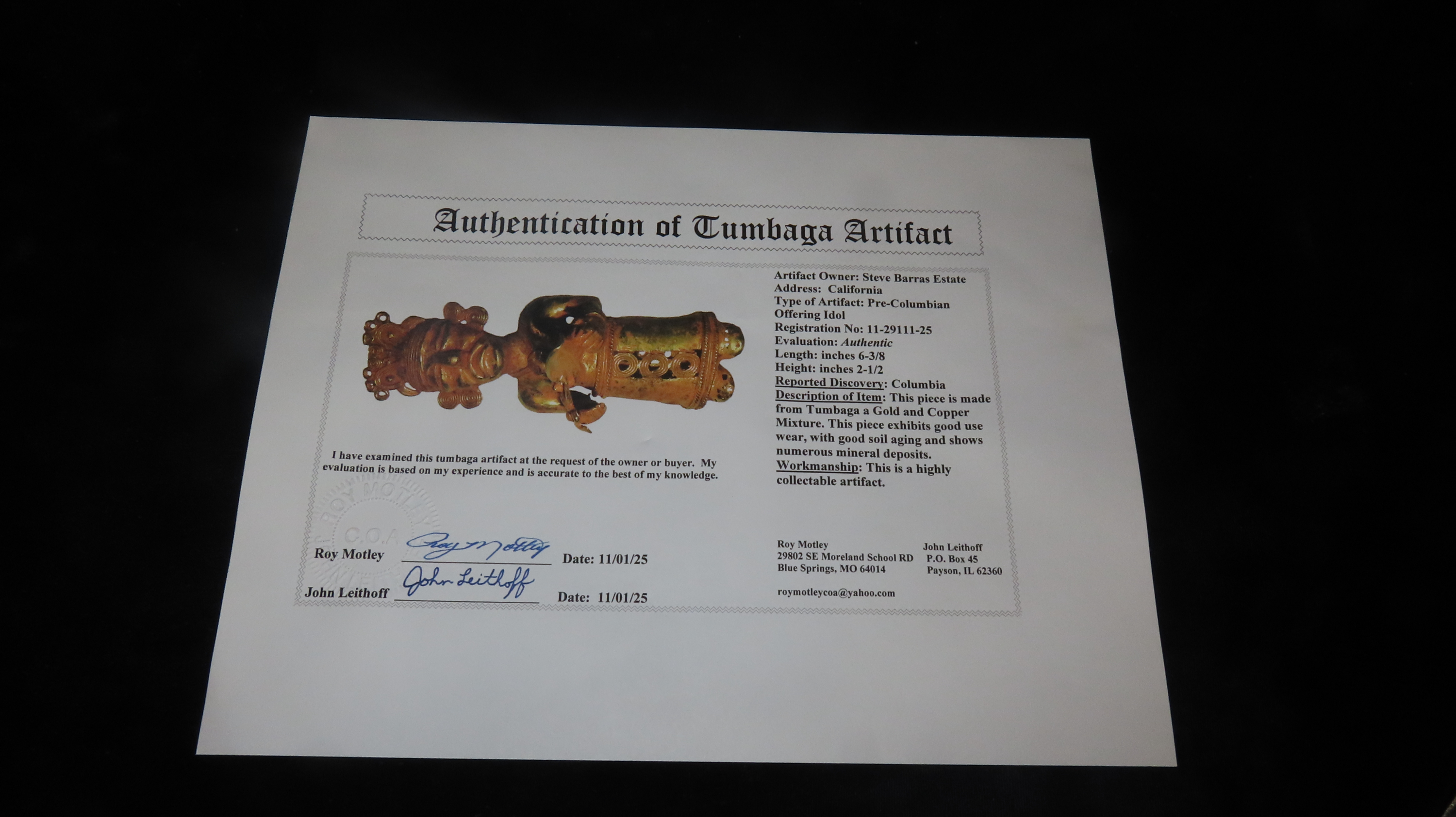 6 3/8″ x 2 1/2″ Pre-Columbian Tumbaga Offering Idol. Gold and Copper Mixture. Columbia. COA Motley and Leithoff. Exact Gold Contents Unknown.