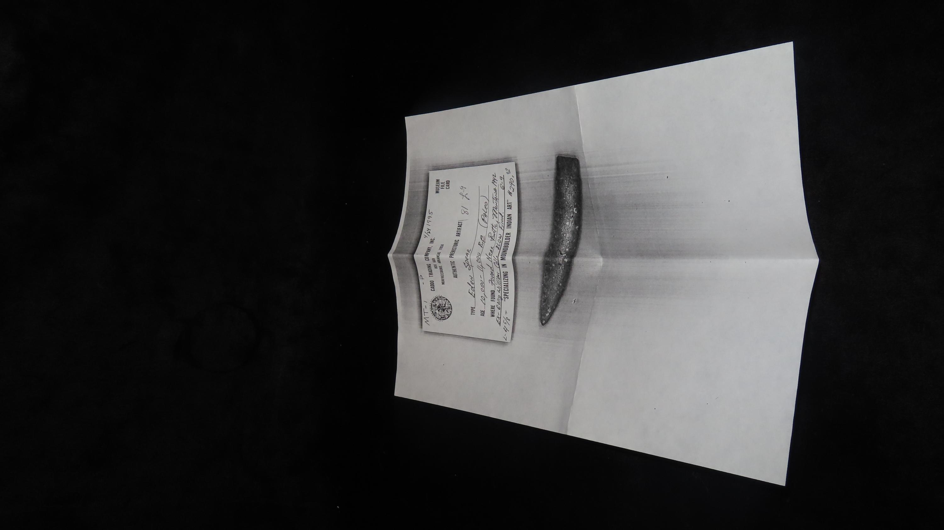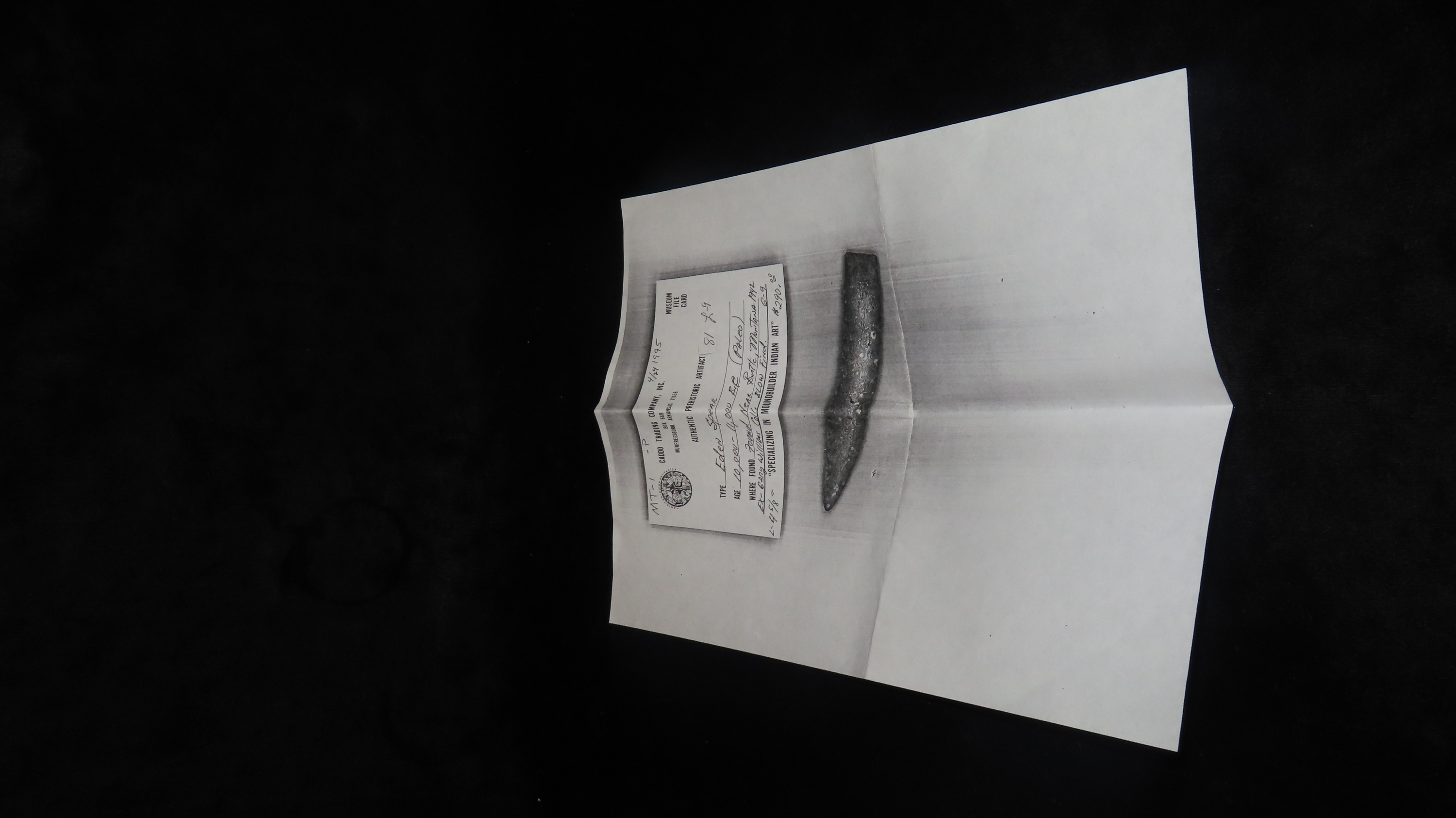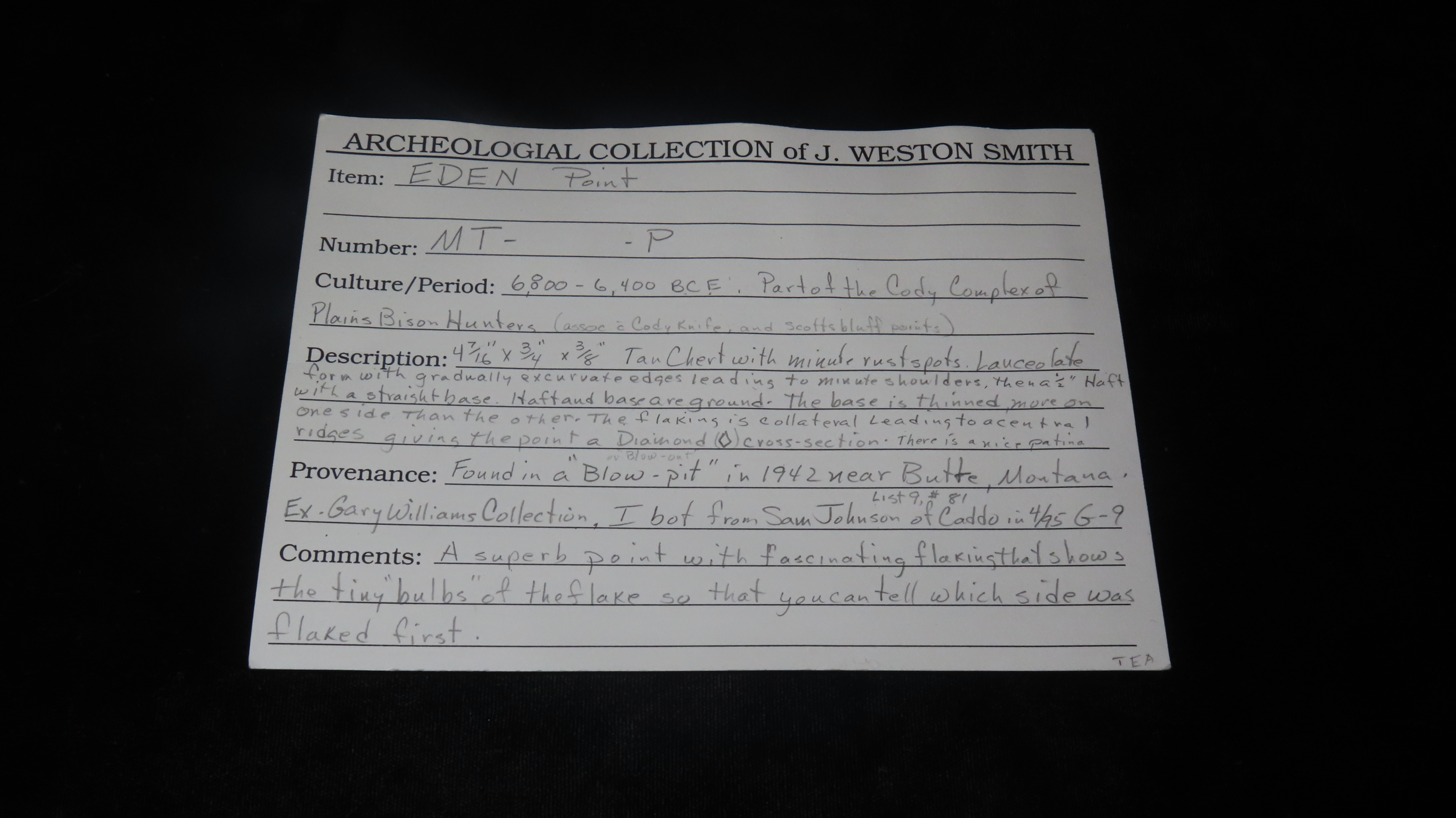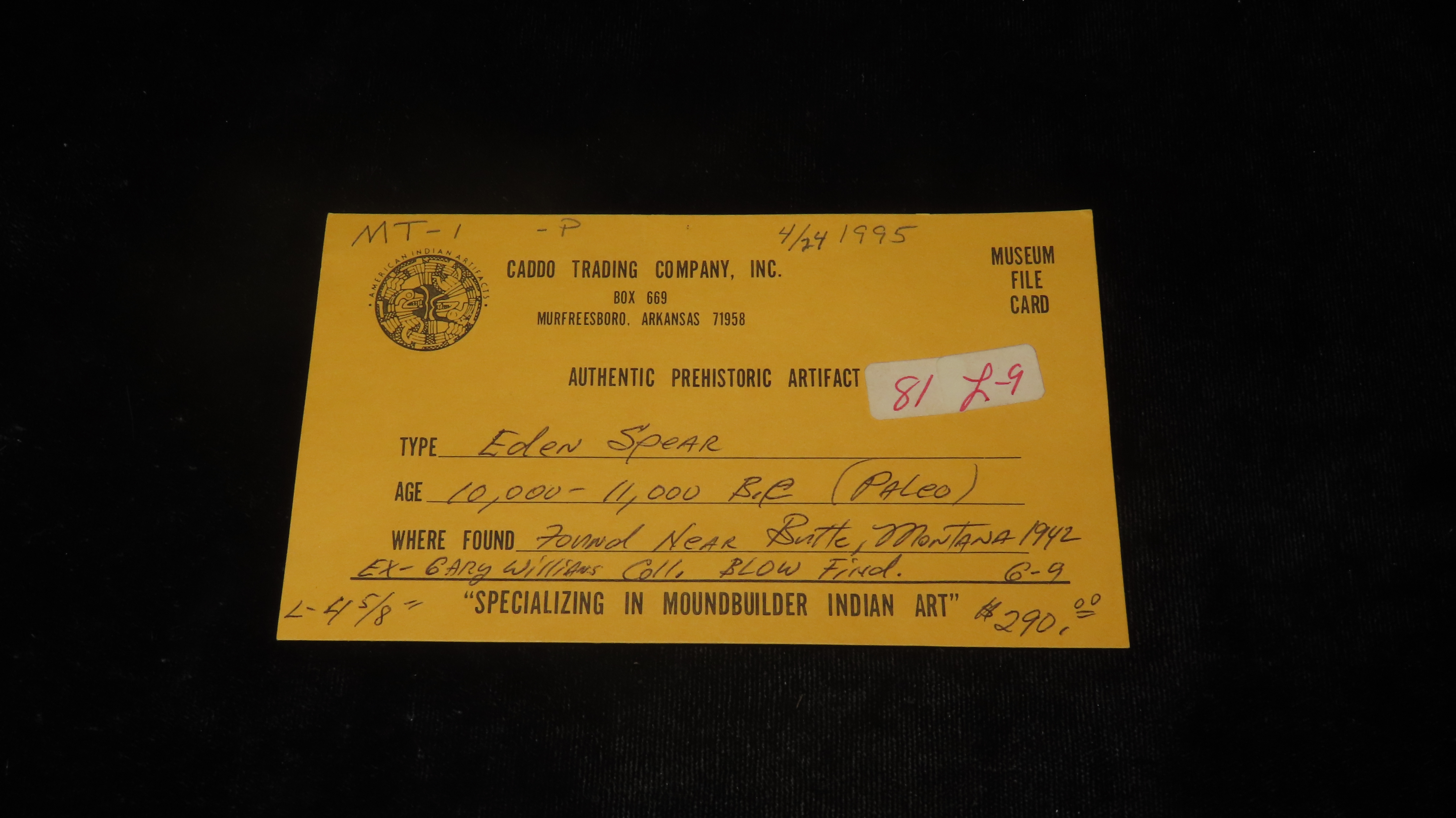 4 5/8″ Eden Spear, Caddo Trading Company Museum File Card/COA, Found Near Butte, Montana, in 1942, Ex. Gary Williams Collection, Ex. Sam Johnson
