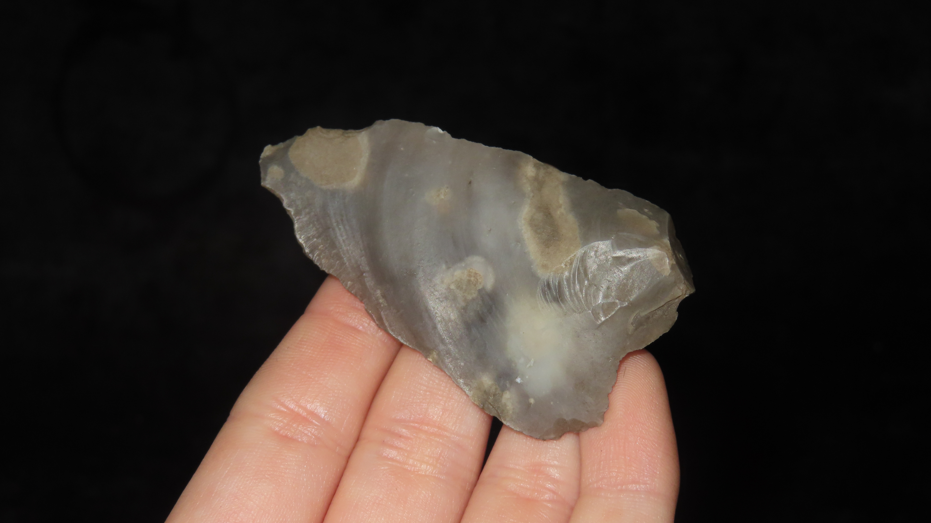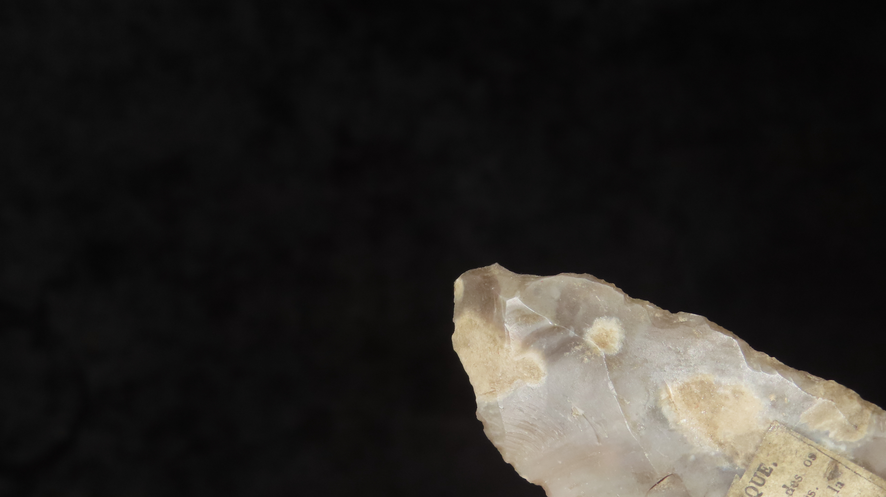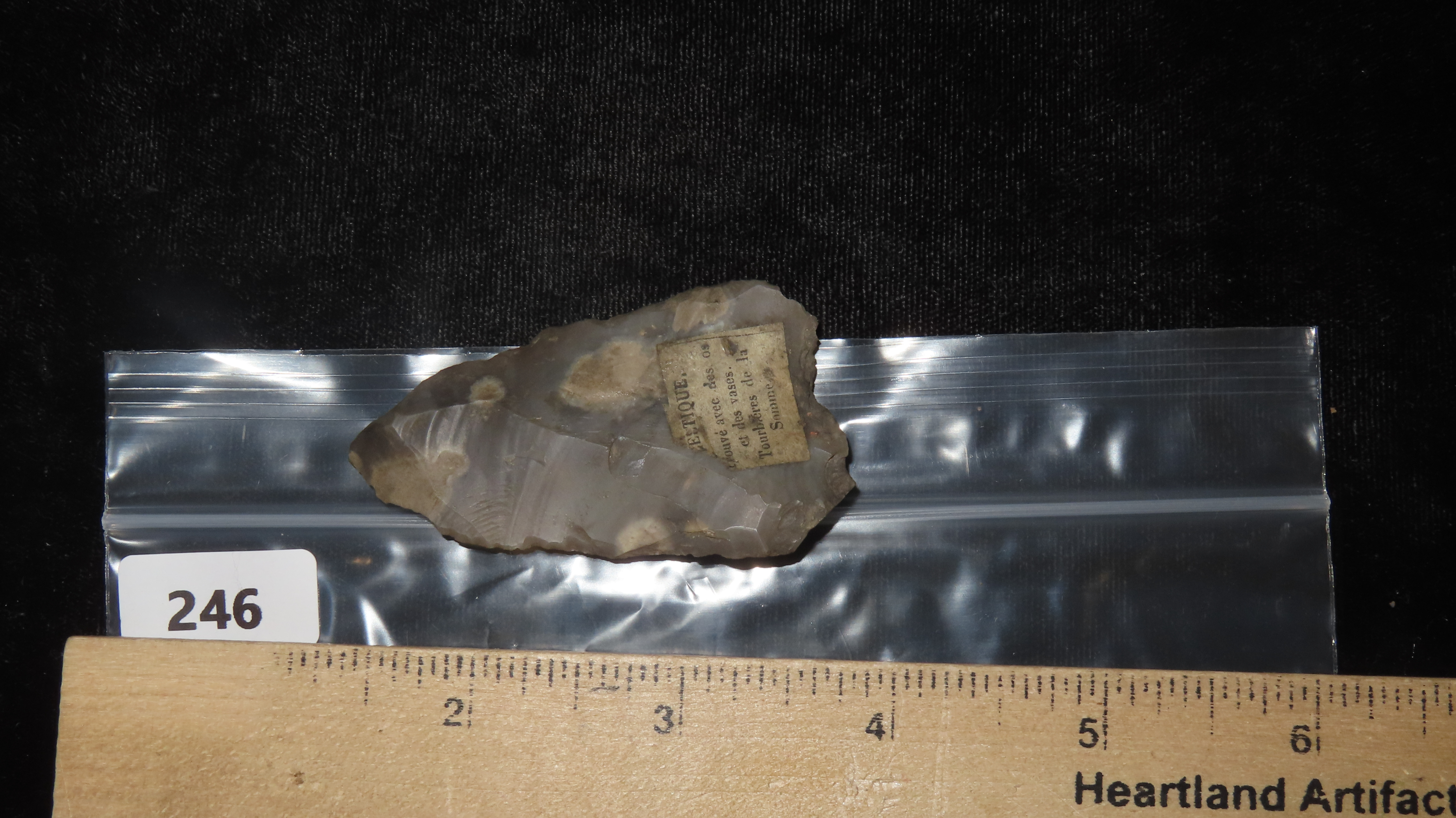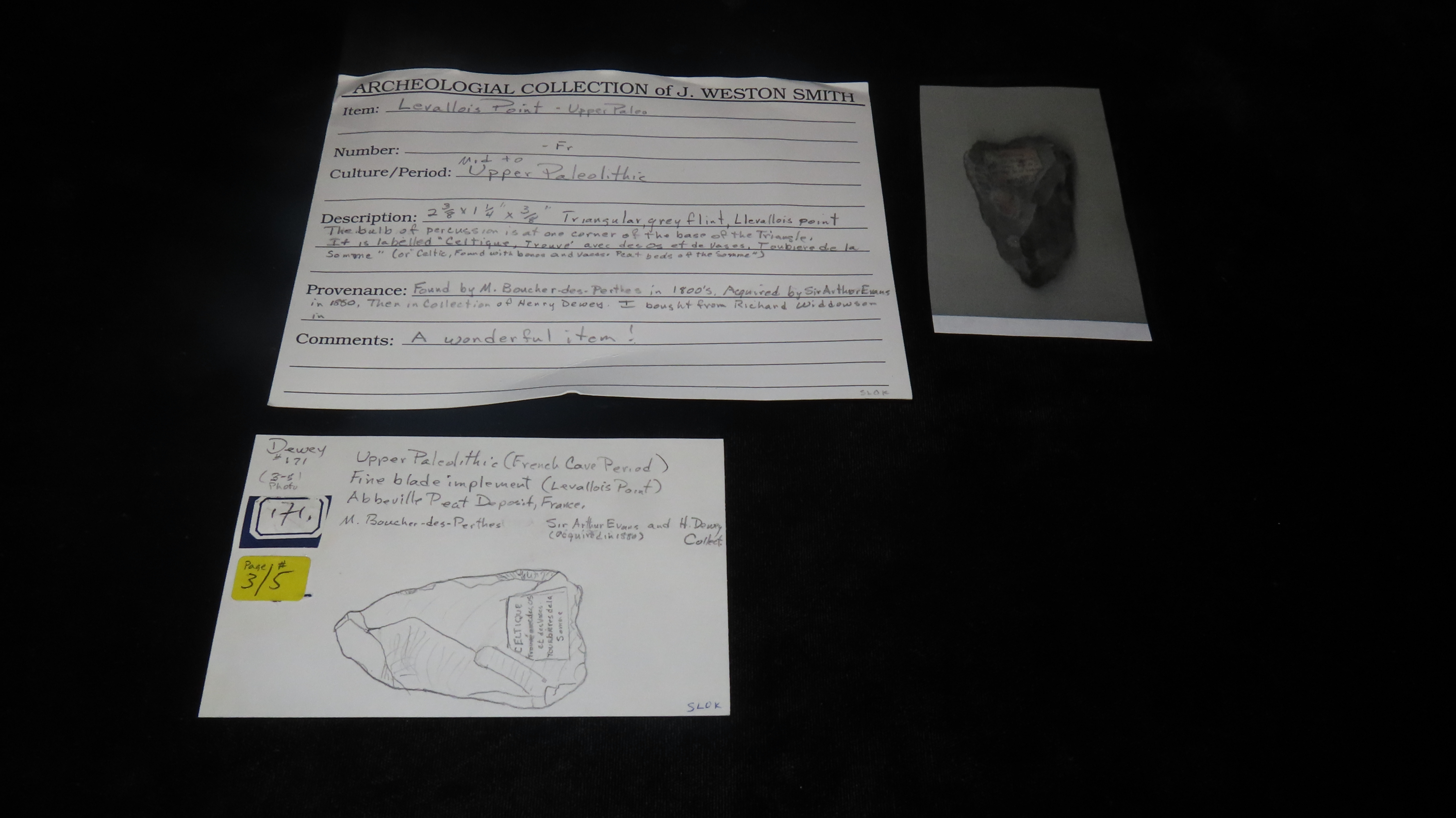 2 3/8″ Acheulean Levallois Point – Upper Paleo, Found by M. Boucher-des-Perthes in 1800s. Aquired by Sir Arthur Evans in 1800s then by Henrey Dewey. Ex. Widdowson