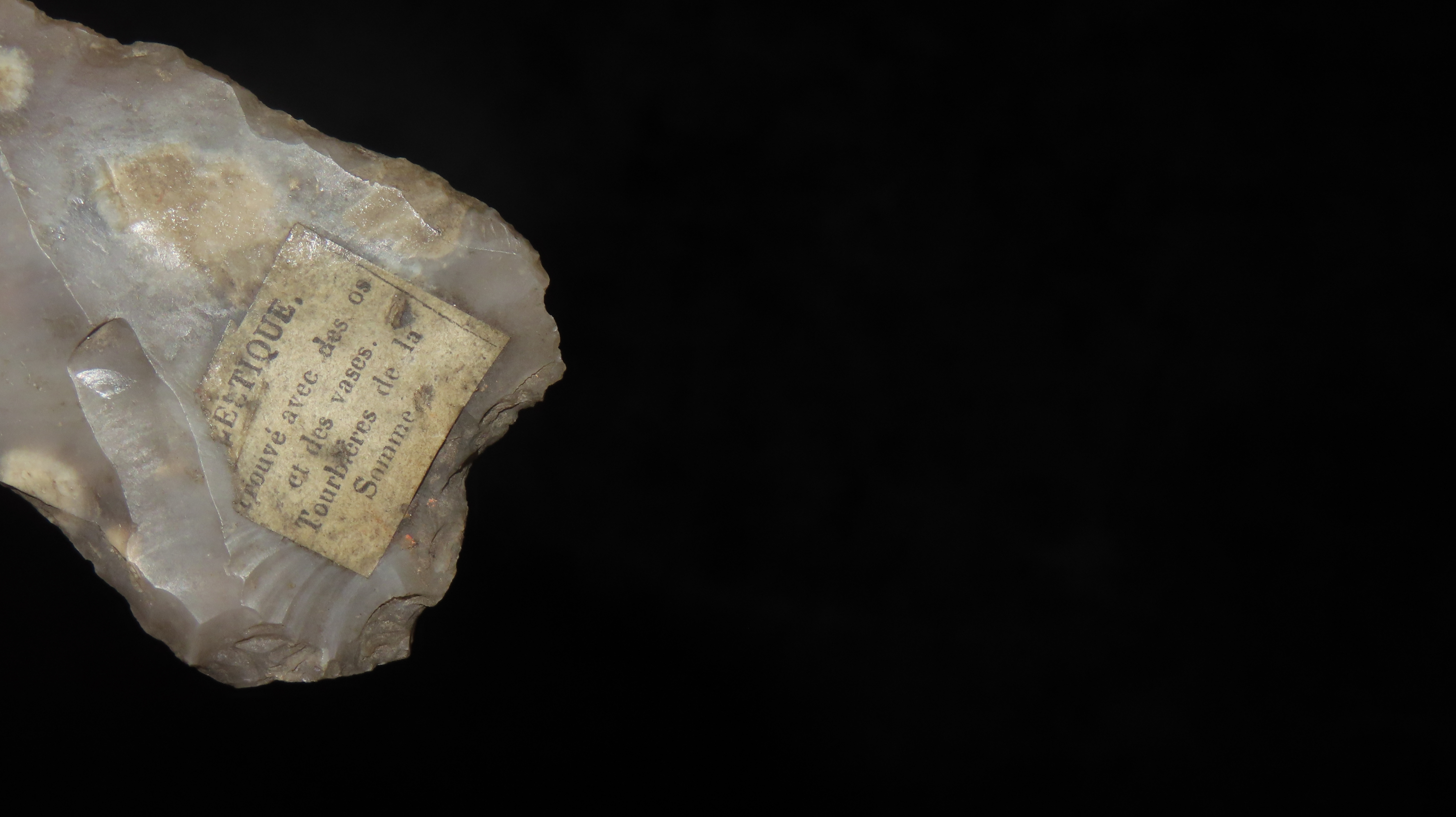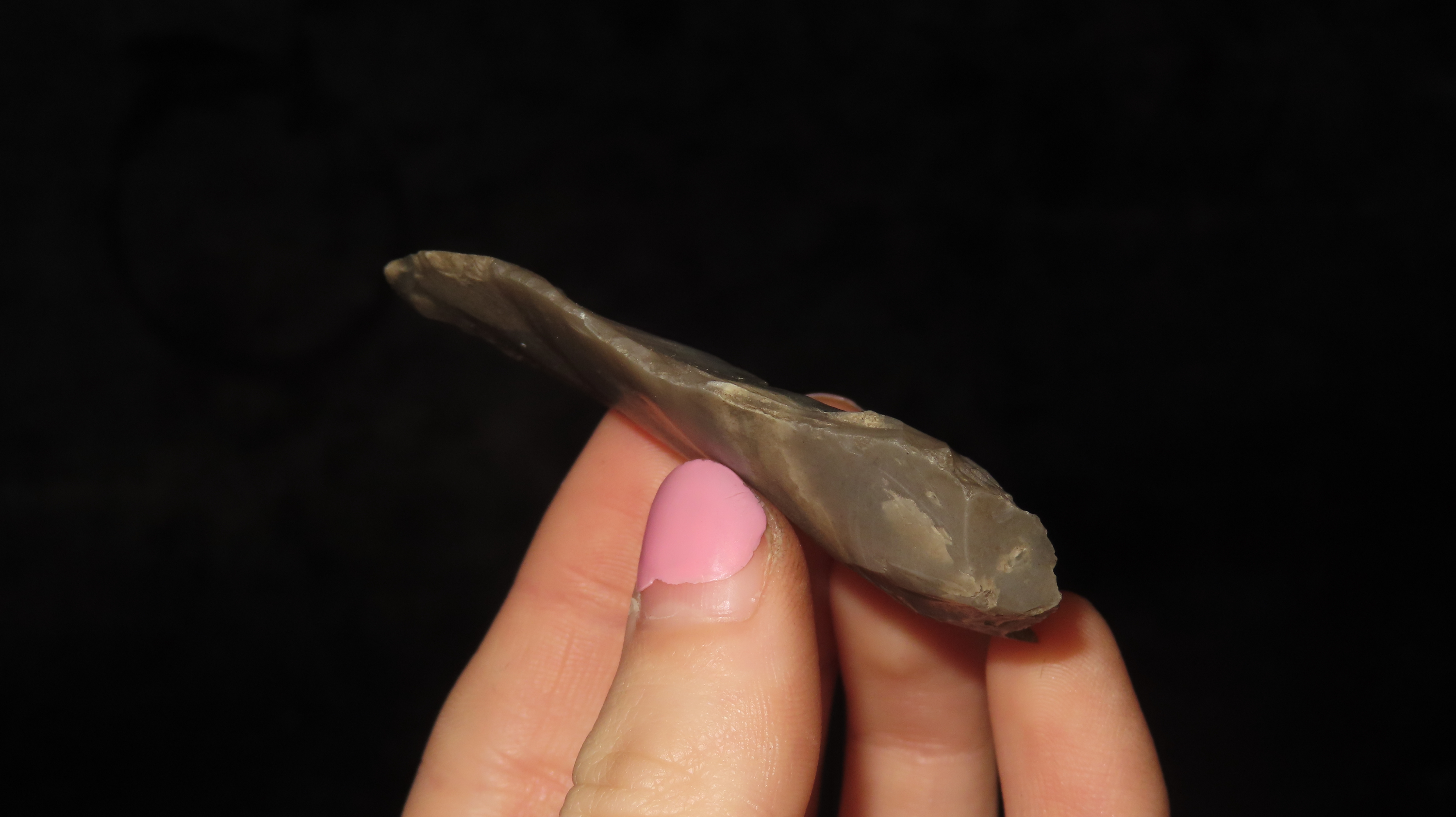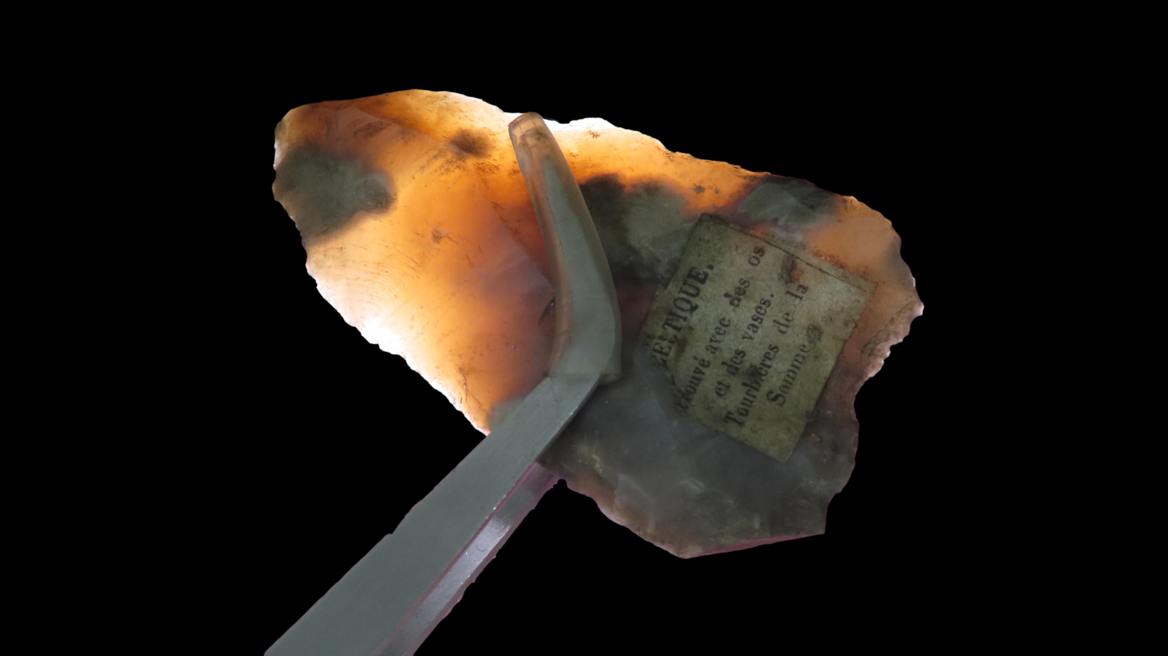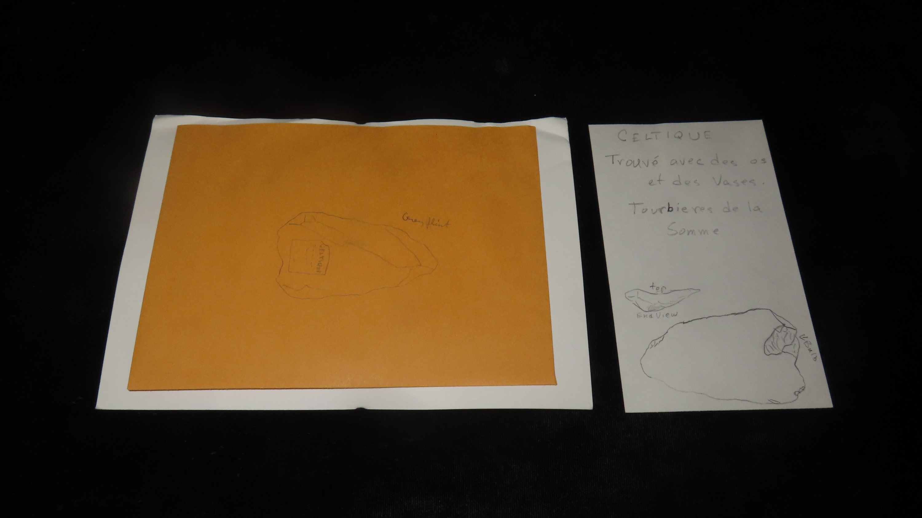 2 3/8″ Acheulean Levallois Point – Upper Paleo, Found by M. Boucher-des-Perthes in 1800s. Aquired by Sir Arthur Evans in 1800s then by Henrey Dewey. Ex. Widdowson