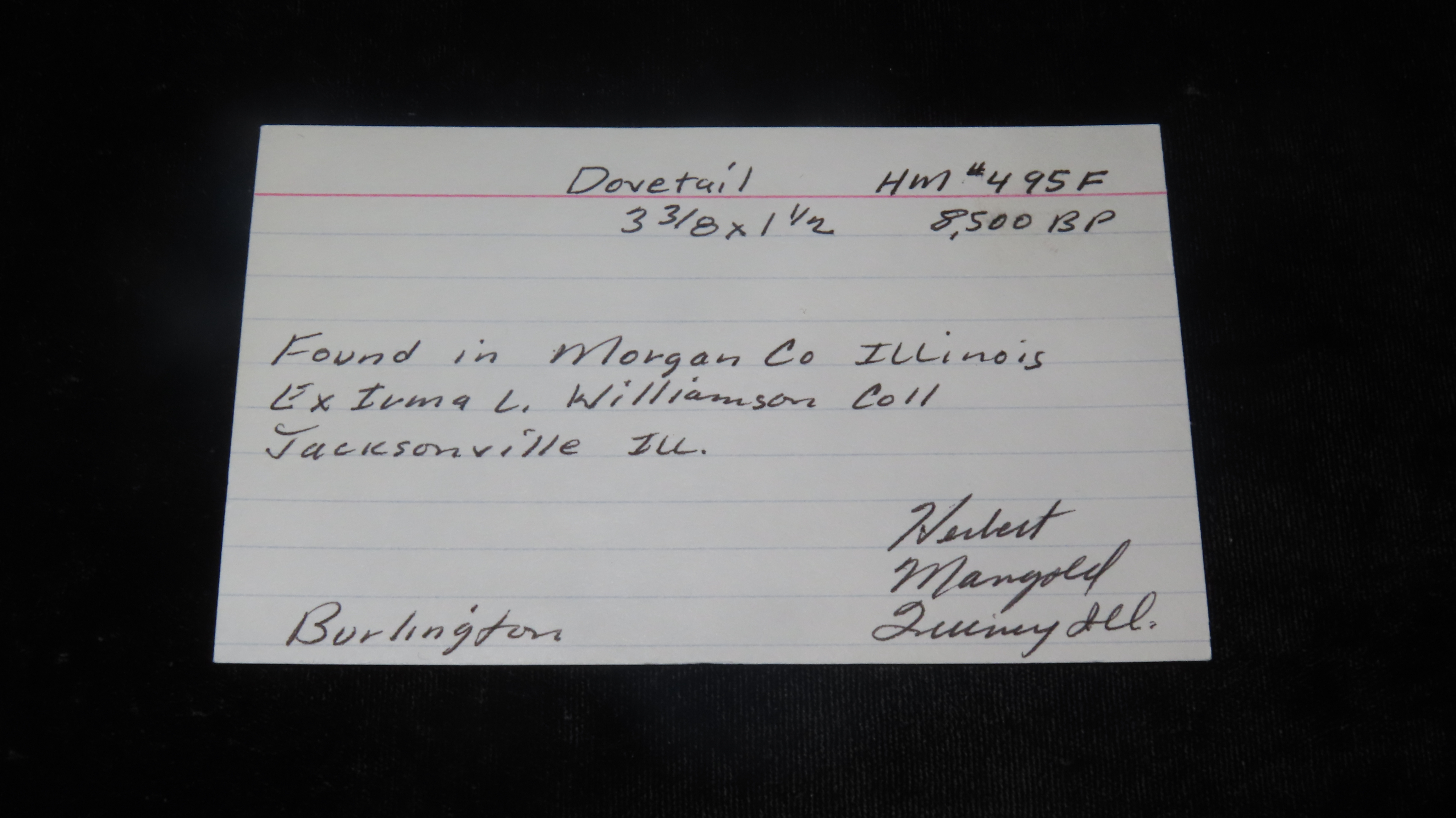 3 3/8″ x 1 1/2″ Dovetail, Found in Morgan Co. Illinois, Ex Irma L. Williamson Collection of Jacksonville, Illinois. Ex. Herb Mangold Collection