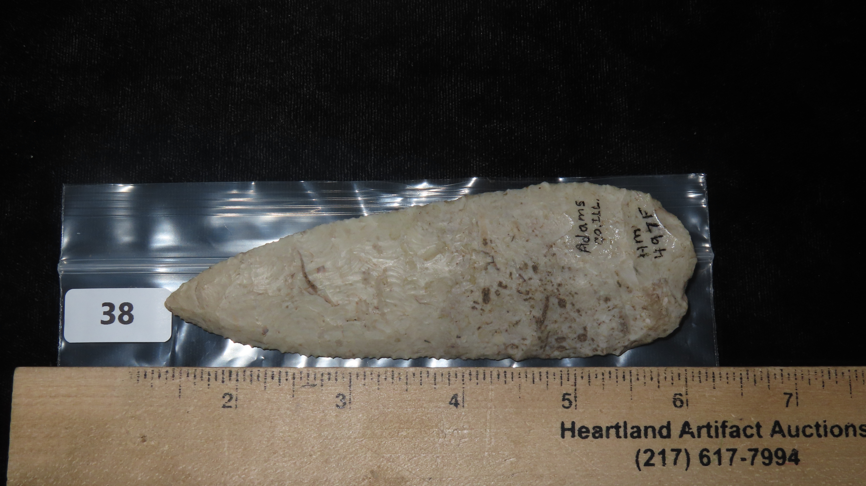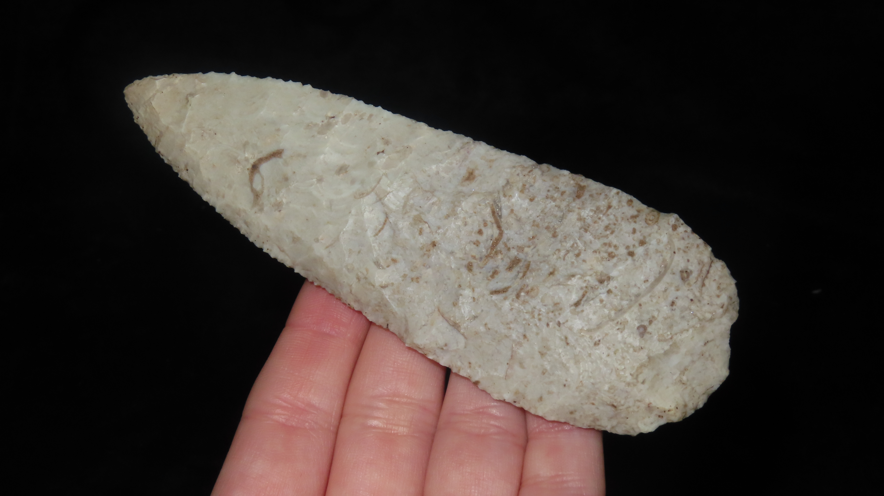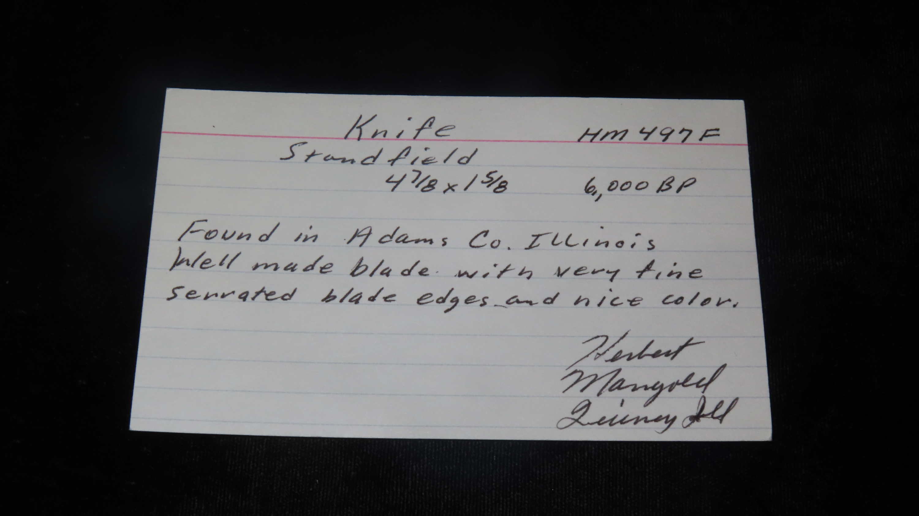 4 7/8″ x 1 5/8″ Knife, Found in Adams Co. Illinois, Well-made blade with very fine sarrated blade edges and a nice color. Ex. Herb Mangold Collection